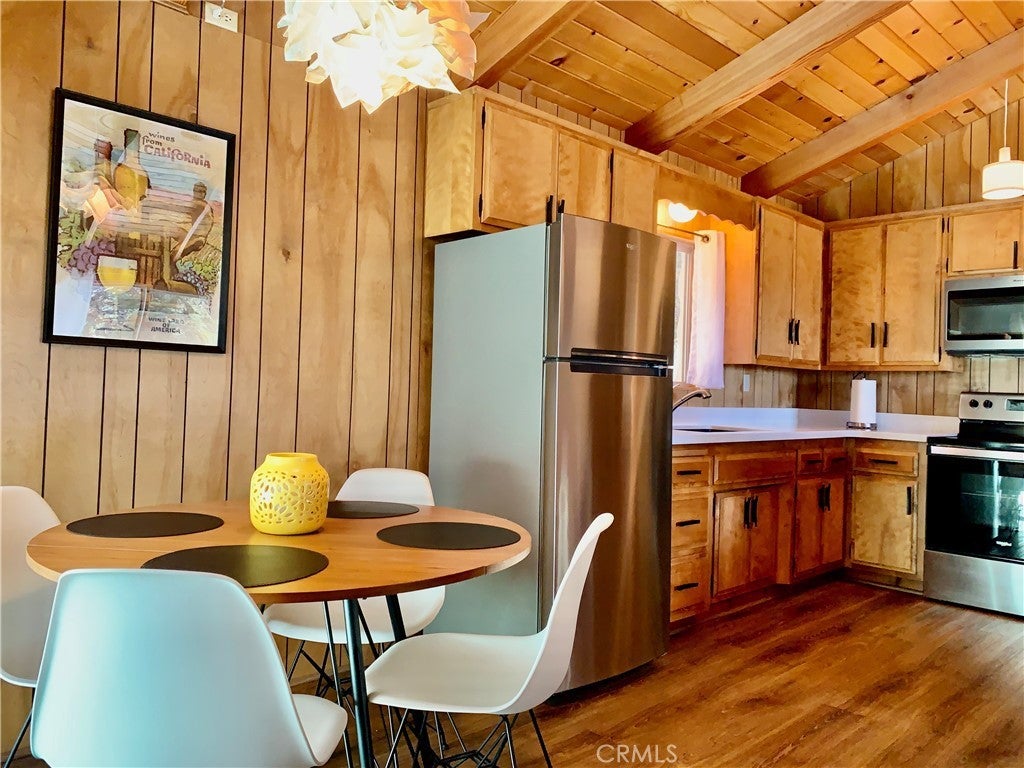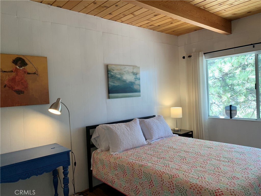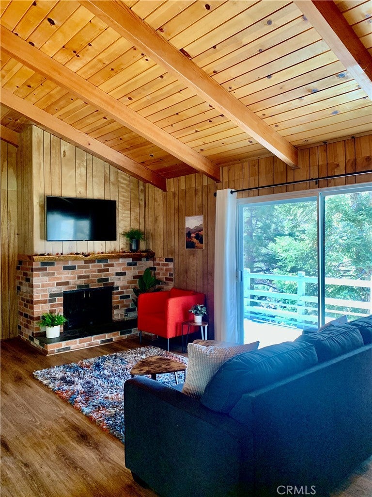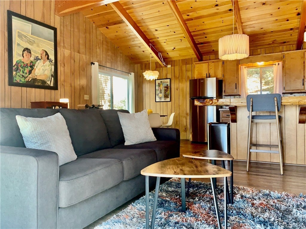 Come and see this Spectacular Mountain home nestled in the trees for that tree house effect, located in the quaint town of Green Valley Lake. This three bedroom and one bathroom cabin is nicely upgraded with new paint and vinyl plank flooring. Nice large den to host family and friends on those special occasions. Bright open great room concept. Kitchen has new quartz countertops and refinished kitchen cabinets. Beautiful wood breakfast bar to enjoy your morning coffee. Nice deck off living room for that indoor/outdoor living to relax and enjoy summer BBQ`s. Cozy brick fire place for those cold winter nights. Nice small deck off dining area for entertaining. This cabin has a new paint job and an asphalt driveway for easy parking and access. Nice storage shed. Large buildup for additional storage or possibly a second bathroom and laundry. Walk to Town, Lake and marina for boating, fishing and swimming Close to hiking trails for those avid hikers or bird watchers. Come and experience what Green Valley Lake has to offer you!