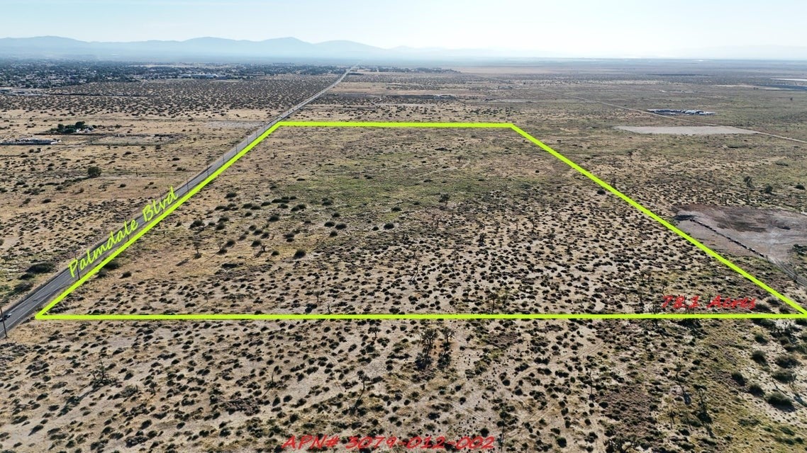 Parcel # 3079-012-002 Coordinates: 34.579939, -117.911456 78 Acres Surveyed, Zoned Heavy Agricultural Flat Land Located on Palmdale Blvd in Littlerock Ca. parcel starts on 120th Ste E. and ends on 125th st E. some businesses may be allowed and prime location on Palmdale Blvd Lots of Traffic.