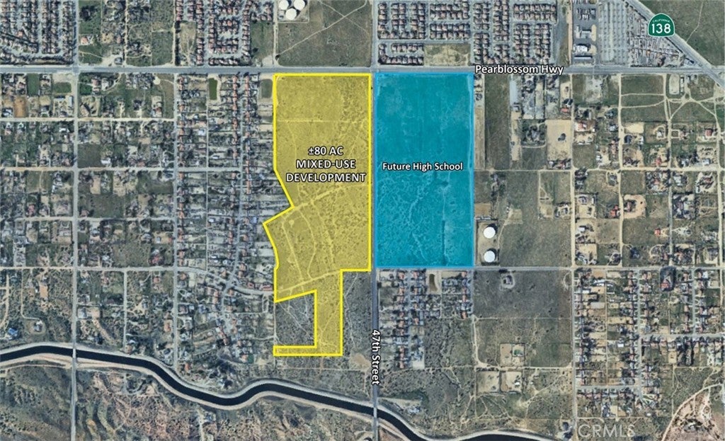 The subject property consists of approximately 80 acres located on the southwest corner of Pearblossom Highway and 47th E Street in Palmdale, California. The property is located in Los Angeles County a part of the Antelope Valley Plan and is relatively flat in topography with significant frontage on 47th St E as well as Pearblossom Hwy. Adjacent to the property’s easterly border is property owned by Antelope Valley Union High School District with plans for future high school. To the south of the property is vacant land, to the west there is an existing residential community, and to the north there is a vacant parcel as well as several medium density residential communities. The property is zoned MXD – RU (Rural Mixed Use Development Zone) with a MU-R (Mixed Use-Rural) land use designation which allows for a wide range of potential uses. The property has a recently expired Tentative Map for a large scale mixed use project. Current zoning will allow for the development of various residential product types with a maximum density of up to 5 DU/AC. NOTE: Asking price includes the assumption of the gas station user contract. Please reach out for more information.