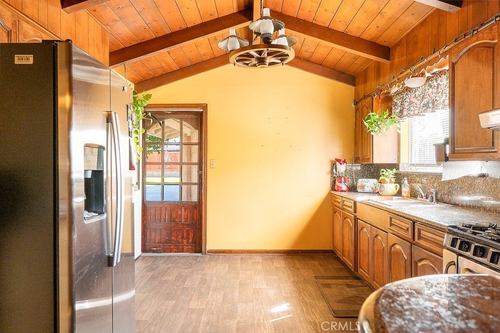 Welcome to this charming single-story home situated on a level .37-acre lot. Offering 3 bedrooms, 2 bathrooms, and 1,713 sq. ft. of living space, this property is thoughtfully designed for both comfort and versatility. The spacious kitchen boasts ample cabinetry, granite countertops, and a dedicated dining area, complemented by a formal dining room for special gatherings. The inviting living room features a cozy wood-burning fireplace, while the expansive family room provides endless possibilities—ideal for entertainment, a home office, or even a potential fourth bedroom. Step outside to your private backyard retreat with a covered patio, perfect for outdoor dining, relaxation, or hosting family and friends. The property is enhanced by a variety of fruit trees including oranges, lemons, apricots, grapefruit, grapes, and plums, allowing you to enjoy fresh fruit year-round. Additional highlights include a large driveway with space for approximately 10 vehicles, and a detached garage converted into storage with laundry hookups. The lot’s generous size offers potential for an ADU or Jr. ADU, making it an excellent investment opportunity. Conveniently located just minutes from Kaiser Permanente Hospital, shopping, Sierra Vista High School, local markets, and the 10 Freeway, with quick access to downtown Los Angeles in under 20 minutes. This home is being sold as-is and is truly a must-see to appreciate all it has to offer. Don’t miss this incredible opportunity—schedule your appointment today! The Sellers are in the process of moving and request that showings begin after the 19th.