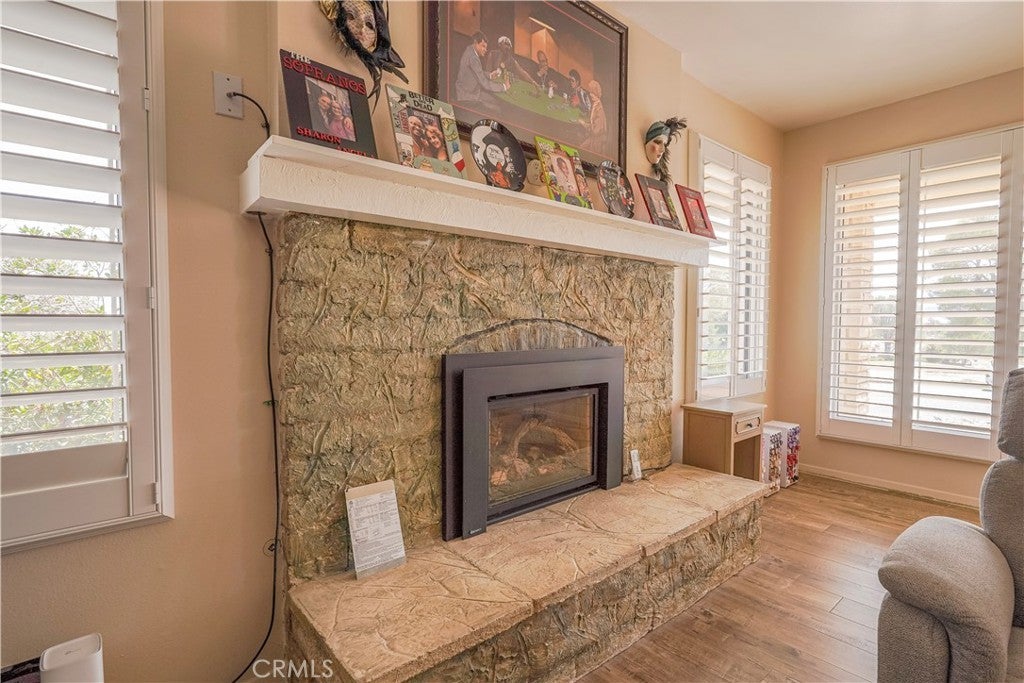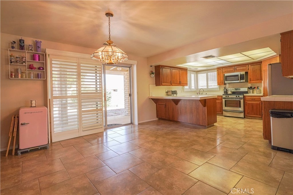 Experience Silver Lakes living in this serene golf course home with comfort, style, and stunning views. Upon entering, you are greeted by the living room featuring upgraded wood-look plank flooring, a stone fireplace, and large windows with shutters that fill the space with natural light. The kitchen offers ample cabinet space and opens to the dining area with a wet bar, ideal for entertaining. Tile flooring runs through the main areas, with carpeted bedrooms for added comfort. The primary bedroom offers sliding doors to the back patio and yard with stunning golf course views, a spacious walk-in closet, and an ensuite with a vanity and tiled shower. The hallway bathroom includes washer and dryer hookups. Step outside to enjoy peaceful mornings or sunset views over the golf course. Don’t miss this opportunity — schedule your showing today!