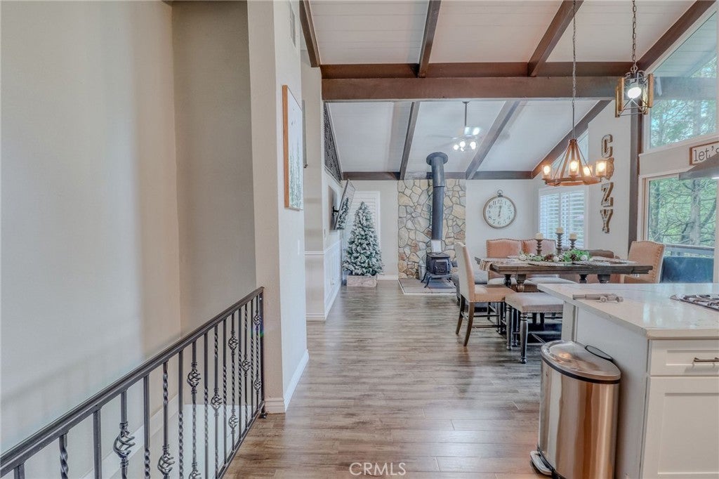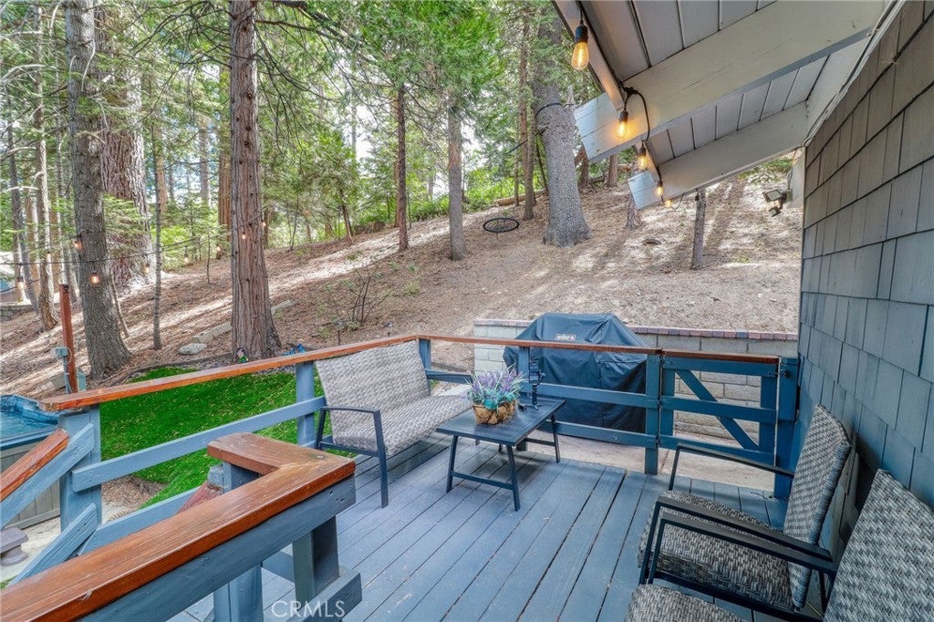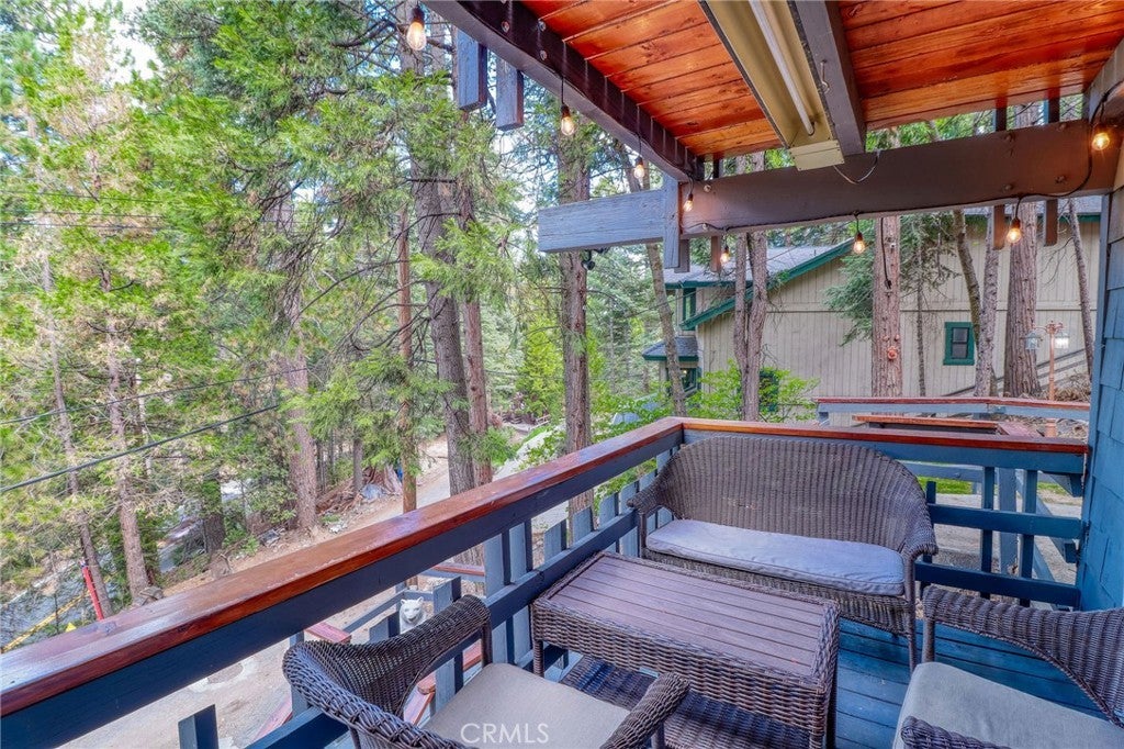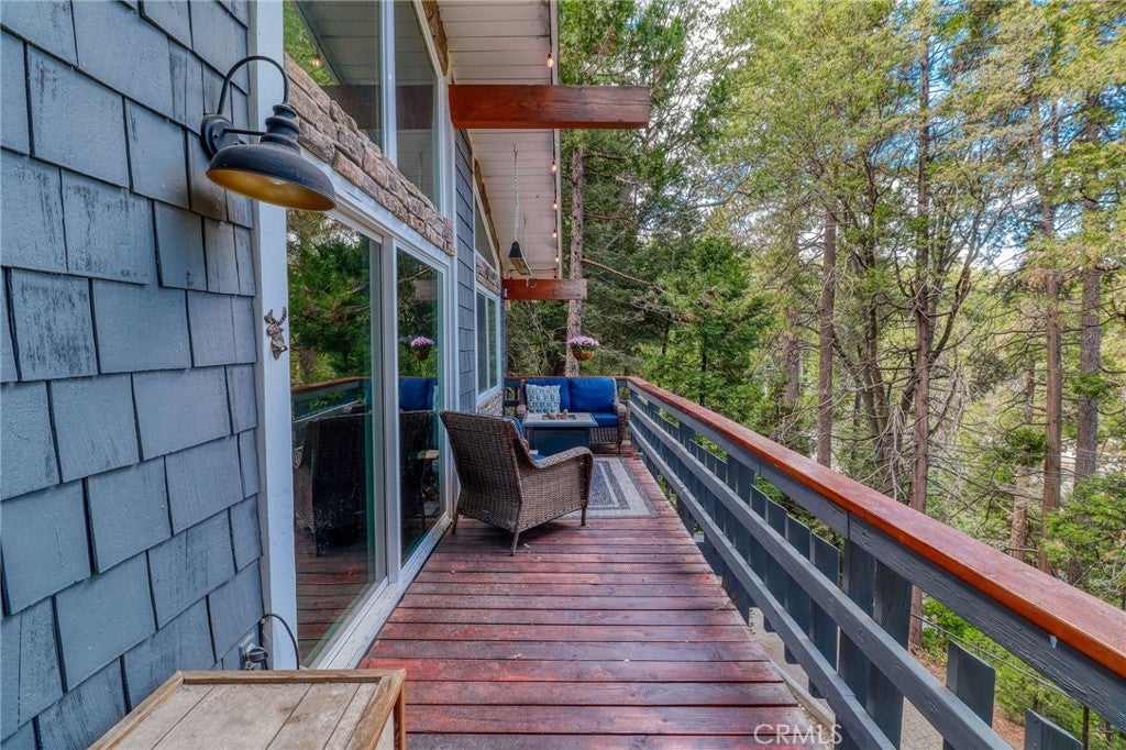 Looking for the perfect mountain getaway, full-time home, or short-term rental? This could be it! Welcome to this FURNISHED newly renovated, refined yet cozy chalet in beautiful Twin Peaks. The home features an open floor plan with vaulted, open-beamed ceilings connecting the living, dining, and kitchen areas. The living room offers a wood-burning stove accented by a stunning stone wall, floor-to-ceiling tinted windows with picturesque treetop views of the evergreens, and a small loft nook ideal for reading or play. The beautifully remodeled kitchen includes quartz countertops, stainless steel appliances, and a built-in microwave. Downstairs, the spacious family/game room features a refaced gas fireplace with ceramic logs, a wood accent wall, and access to a deck perfect for entertaining. The first bedroom offers built-in twin bunk beds, ceiling fan, and sliding door access, while the second bedroom features newer carpet with memory foam padding and a charming loft nook ideal for a play space or extra sleeping area. The upstairs bathroom includes a tub and shower with gorgeous Travertine flooring and tiled shower wall, while the downstairs bathroom features a shower, laundry area, and shiplap ceiling and wall accents. Enjoy the outdoors on any of the three decks, relax on the backyard swing overlooking the forest, or soak in the above-ground spa under the beautiful starry mountain nights. Additional features include plantation shutters, dual-pane windows, central A/C and heat, a tankless water heater, and a newer roof, all replaced within the past three years. With plenty of windows to capture mountain and forest views and close proximity to Lake Arrowhead Village, Lake Gregory, Blue Jay, Santa’s Village, and local ski resorts, this family-friendly home offers the best of mountain living with easy access off the mountain and all the conveniences nearby.