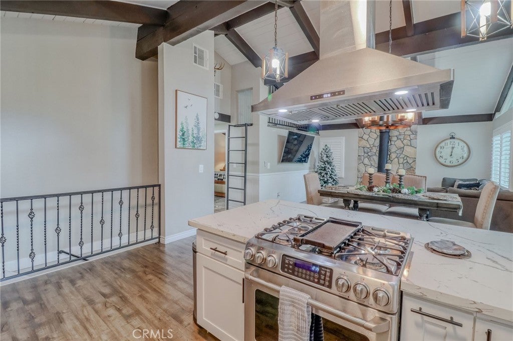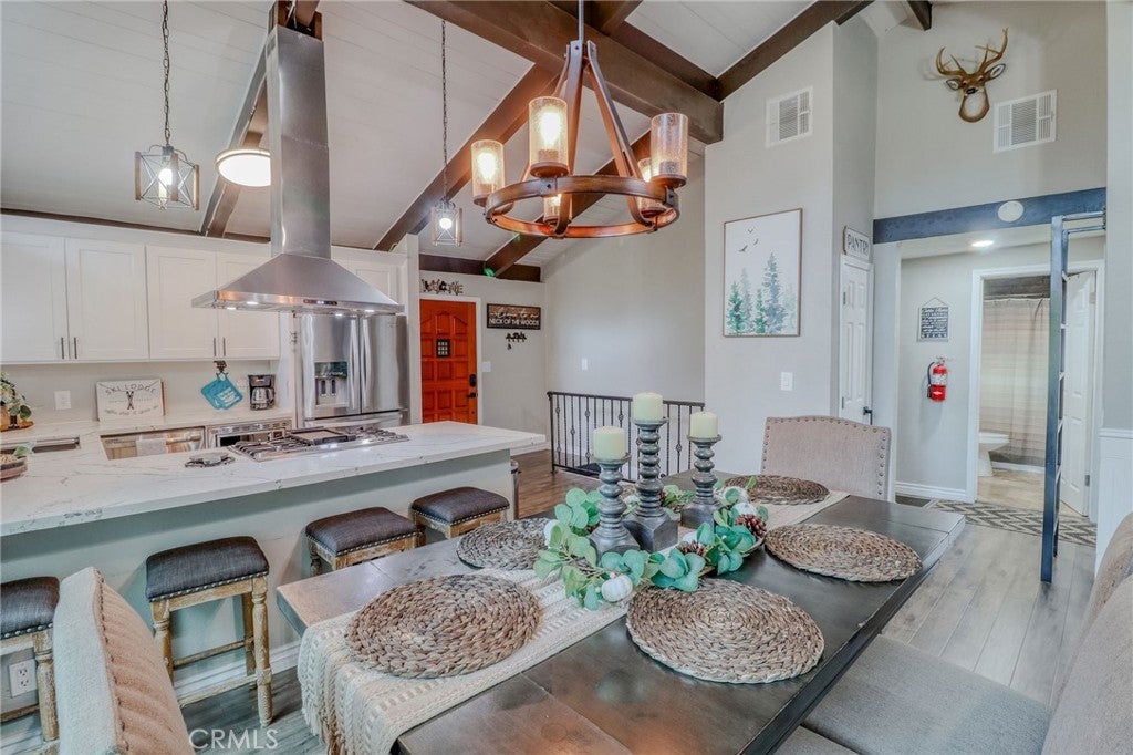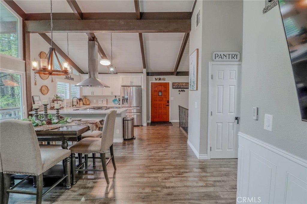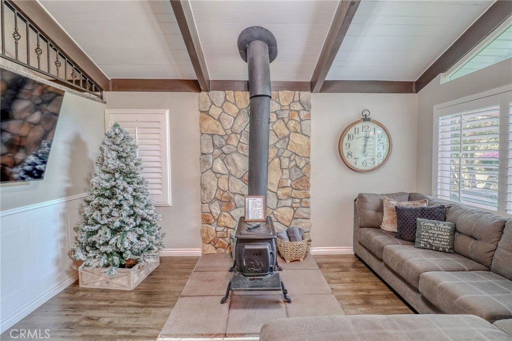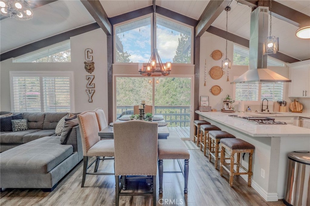 Looking for the perfect mountain getaway, full-time home, or short-term rental? This could be it! Welcome to this FURNISHED newly renovated, refined yet cozy chalet in beautiful Twin Peaks. The home features an open floor plan with vaulted, open-beamed ceilings connecting the living, dining, and kitchen areas. The living room offers a wood-burning stove accented by a stunning stone wall, floor-to-ceiling tinted windows with picturesque treetop views of the evergreens, and a small loft nook ideal for reading or play. The beautifully remodeled kitchen includes quartz countertops, stainless steel appliances, and a built-in microwave. Downstairs, the spacious family/game room features a refaced gas fireplace with ceramic logs, a wood accent wall, and access to a deck perfect for entertaining. The first bedroom offers built-in twin bunk beds, ceiling fan, and sliding door access, while the second bedroom features newer carpet with memory foam padding and a charming loft nook ideal for a play space or extra sleeping area. The upstairs bathroom includes a tub and shower with gorgeous Travertine flooring and tiled shower wall, while the downstairs bathroom features a shower, laundry area, and shiplap ceiling and wall accents. Enjoy the outdoors on any of the three decks, relax on the backyard swing overlooking the forest, or soak in the above-ground spa under the beautiful starry mountain nights. Additional features include plantation shutters, dual-pane windows, central A/C and heat, a tankless water heater, and a newer roof, all replaced within the past three years. With plenty of windows to capture mountain and forest views and close proximity to Lake Arrowhead Village, Lake Gregory, Blue Jay, Santa’s Village, and local ski resorts, this family-friendly home offers the best of mountain living with easy access off the mountain and all the conveniences nearby.