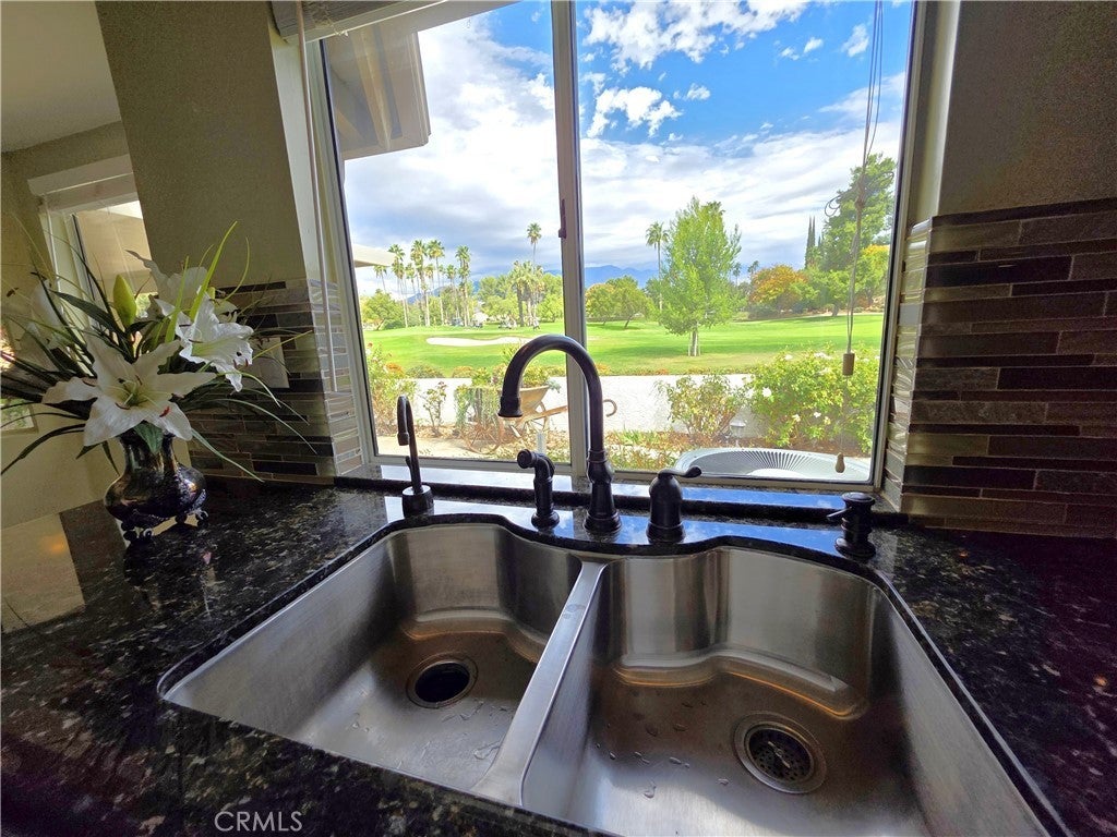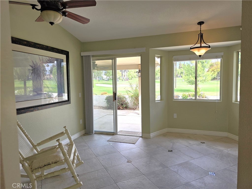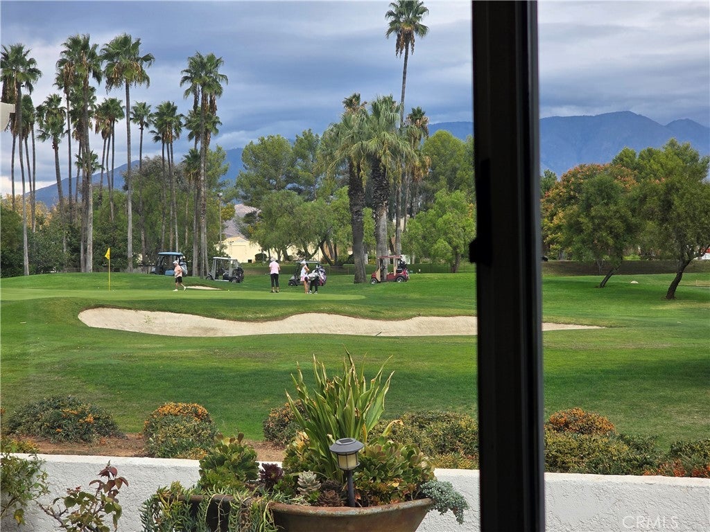 Mountain and golf course views unmatched in Sun Lakes!!! Highly Upgraded Sunningdale with a Golf Course Green View Location. This is one of the most beautiful view lots in all of Sun Lakes. Home is at the end of a road with little to no street traffic. Features a beautiful unobstructed panoramic view of the San Gorgonio Mountains with a big double fairway view of the 16th and 17th holes. The Home is located adjacent to the 16th green and as a result the patio can be safely enjoyed with no fear of errant shots. Patio has a newer Alumiwood cover with beautiful landscaping and decorations. Inside find a tastefully renovated Sunningdale Model 2 bedroom 2 bathroom plus den with atrium/patio. This home has upgraded newer paint, upgraded moldings, custom tile with accents in all the traffic areas, Kitchen has been renovated with new appliances, granite countertops, sink and high end fixtures. 2 CAR Plus golf cart Epoxy floor garage with pull down attic storage, and wall storage cabinets. All maintenance has been recently performed. This is an absolute gem of a home located on the perfect lot.