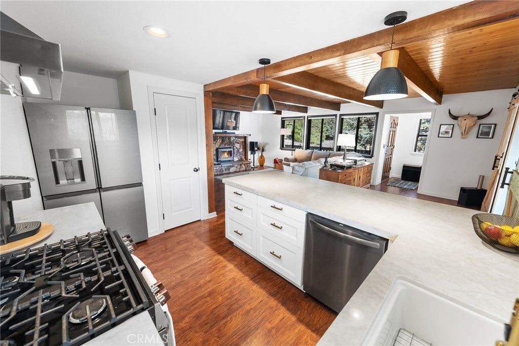 This move-in-ready, upgraded, beautiful, 2-story mountain home is situated on an 8,456 Sq. Ft. corner lot on the East side of town. This home features an open-concept living area, a spacious dining room, and a cozy fireplace. The primary bedroom boasts its own private balcony for enjoying the mountain views. The property includes an attached 1-car garage, RV parking with power source, a fully fenced yard with beautiful landscaping. the beautiful back patio space is perfect for entertaining, complete with a gas burning fire pit and a sitting area. Only minutes away from downtown Wrightwood shops and restaurants, and minutes from the famous Mountain High Ski Resort.