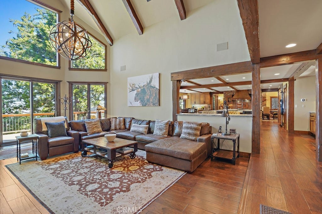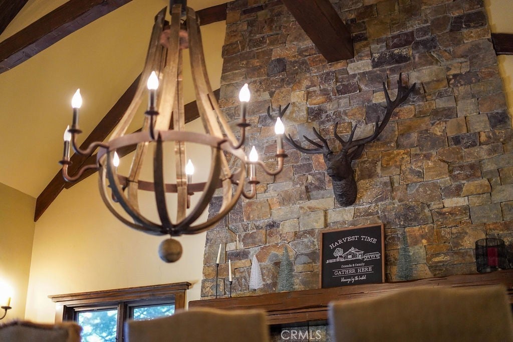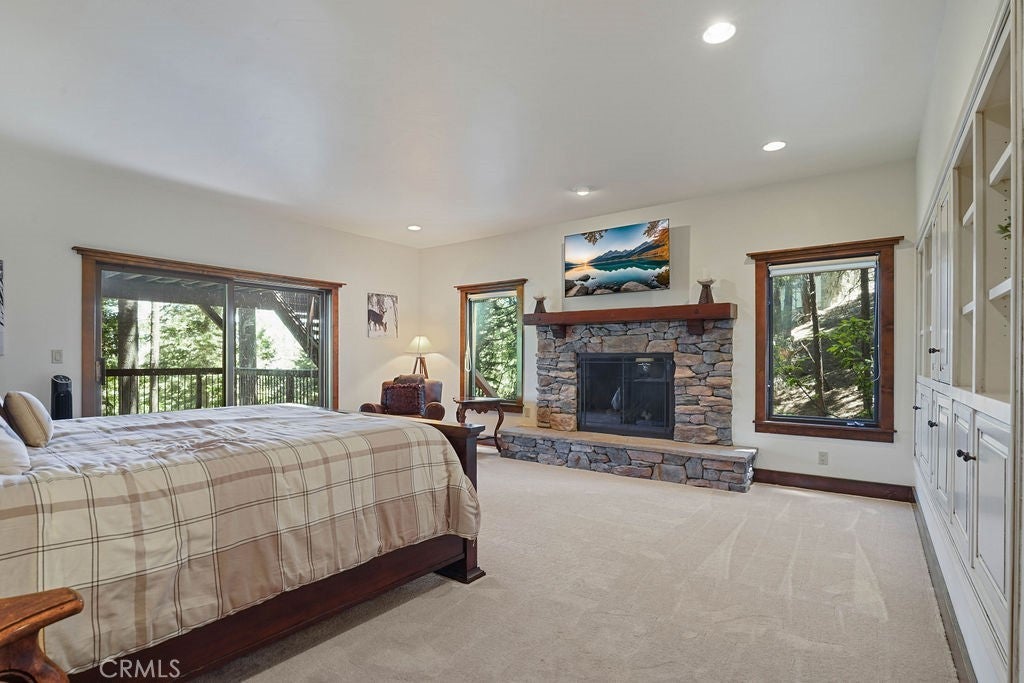 BALD EAGLE RIDGE: Perched high within the prestigious Cedar Ridge Estates, this magnificent mountain lodge combines timeless craftsmanship with natural beauty. Nestled among towering pines and overlooking beautiful Lake Arrowhead, the setting offers breathtaking panoramic scenery. Set on approximately 1.54 acres of pristine landscape, this exceptional home includes every modern comfort—along with coveted lake rights. The chef’s kitchen is a true centerpiece, featuring an 8-burner professional range, double ovens, a sleek stainless-steel hood, and a large island perfect for meal prep or casual dining. The formal dining room, highlighted by a striking stone fireplace (one of five throughout the home), easily accommodates a 12-seat table—perfect for memorable gatherings. A beautiful bedroom suite graces the main level, while the master suite upstairs offers a cozy fireplace, lake view, and a luxurious bath complete with a steam shower. Two additional bedrooms are also located on the upper level, with six bedrooms total throughout the home. The expansive game room is ideal for entertaining, boasting a full wet bar with refrigerators, space for a pool table, shuffleboard, and poker table, along with another fireplace and large bar area. Two sweeping decks provide the perfect backdrop for outdoor entertaining or quiet relaxation beneath the trees. Additional features include multiple air conditioners, fresh paint, and an attached three-car garage with an electric charging station—all set within the exclusive gates of Cedar Ridge Estates.