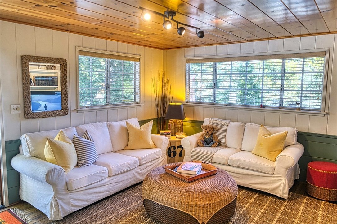 Restored Vintage Cottage nestled within a magnificent forest setting with just a few other cabins nearby. This restored mini Showplace is just “Magical”!! Approx. 30 Acres of common land, you are in another world, yet within walking distance to the town of Blue Jay. There are 2 Charming Bedrooms. 1 & ¾ upgraded Bathrooms and an amazing Office/Lounge Sun Room filled with sunlight and could be a 3rd Bedroom. The Kitchen offers an authentic 1930’s Stove and conveniently located Mudroom with Pantry. 2 Entertaining Decks! Beautiful Dining Area with Family Room features Stone Mantled Fireplace! Separate Conversation Living Room with Bookshelves and Fireplace Insert for ambiance! Central Heat and Air Conditioning! Top Security. Offered FURNISHED!! Move Right in!