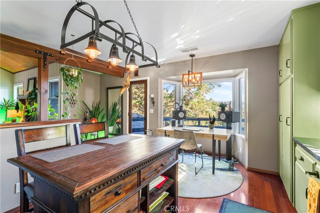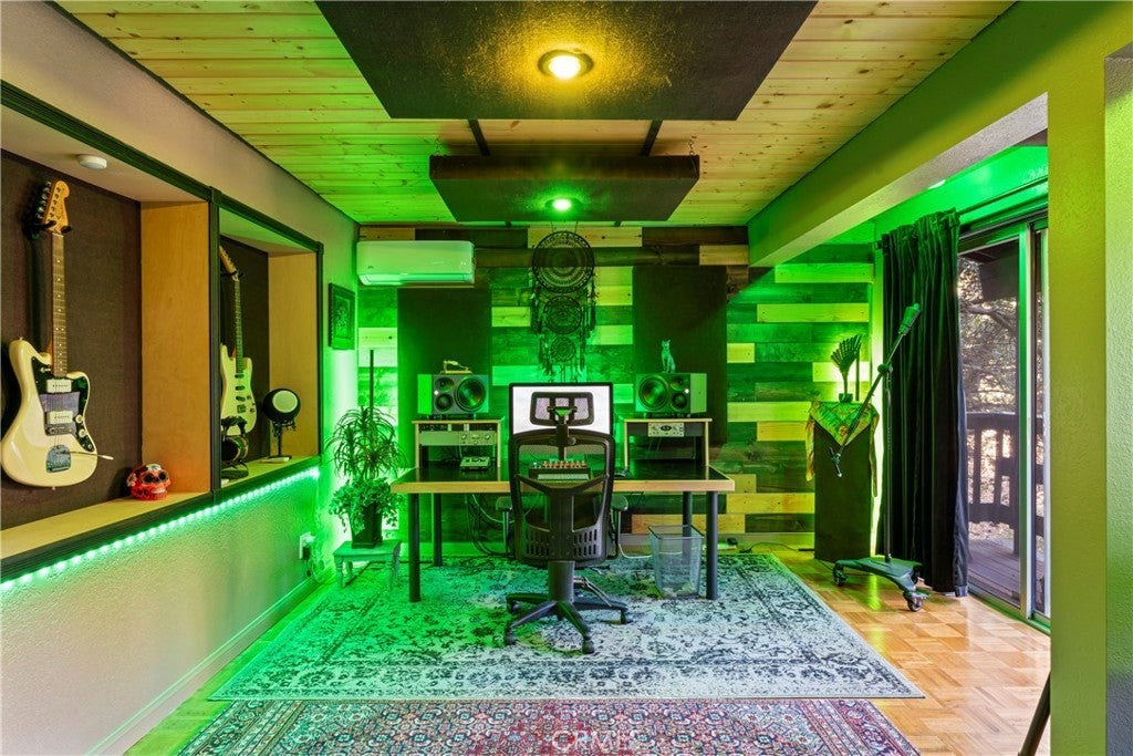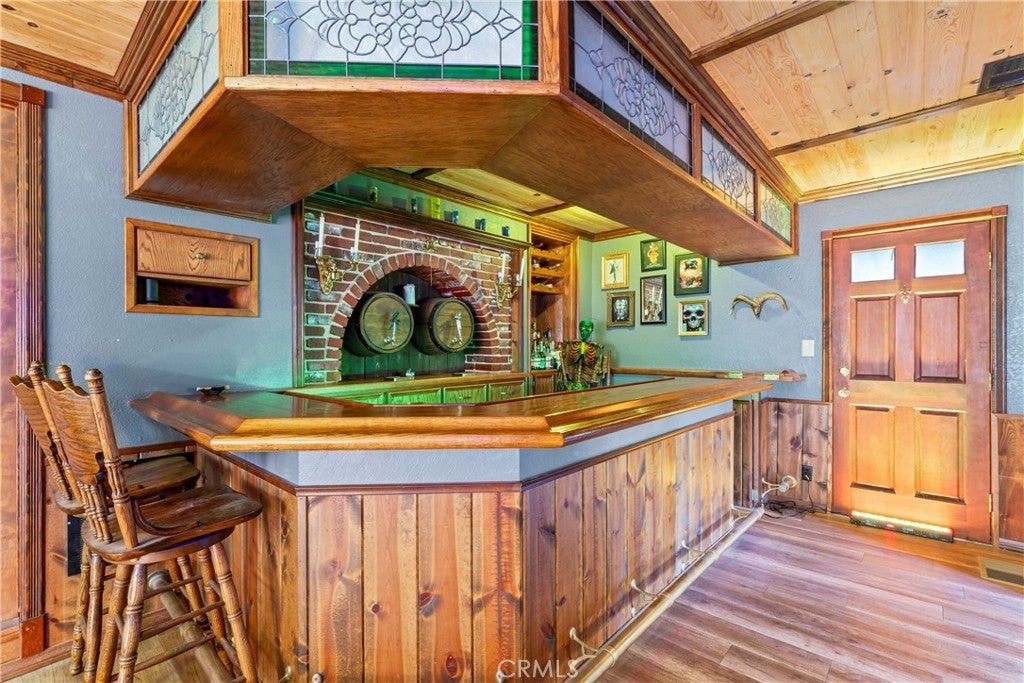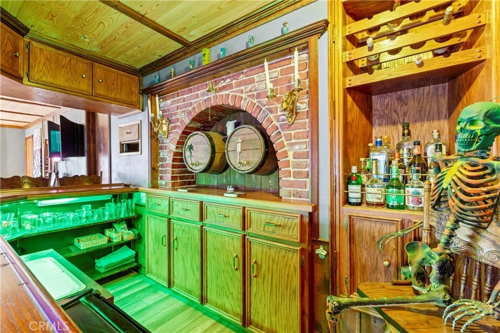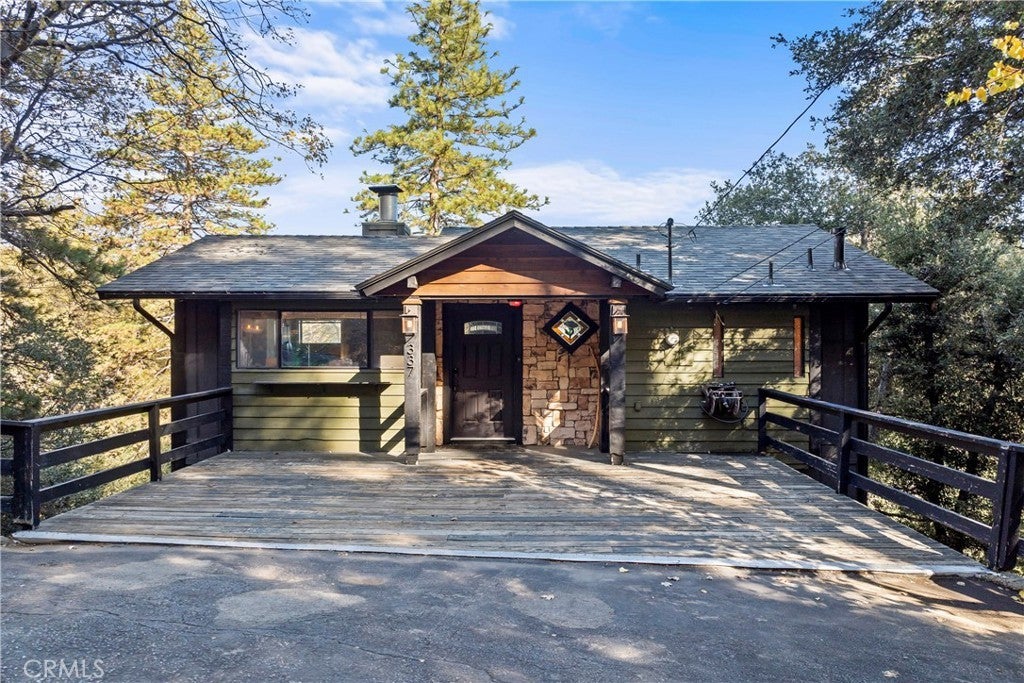 Stunning 3-bed, 4-bath craftsman retreat with unmatched privacy, forest surroundings, and sweeping skyline views of the rolling mountaintops—completely unobstructed by neighboring homes. Enjoy four decks immersed in nature, ideal for outdoor dining, grilling, stargazing, and relaxing in total seclusion. Located just 3 minutes from Goodwins and Lake Gregory, this home offers peaceful mountain living with convenient access to town. The home features four levels. The main entry level includes warm wood ceilings, abundant natural light, bay-window, a cozy fireplace with an open concept kitchen and dining. The second level includes all bedrooms, with the primary suite offering a new split-unit climate-control system, blackout shades, ensuite bath with shower, and upgraded California Closets. The third-floor entertainment level is a true standout—complete with a full bar, functional taps and keg fridges, pool table, shaded deck, and even a hidden door behind the bar for extra storage. An additional family/bonus room with its own fireplace provides flexible use options. The fourth level has been transformed into a sound/music studio and includes an additional split unit. this space offers adaptability for studio use, guest space, or an additional bedroom (buyer to verify any intended use). Upgrades include newer roof (202 2), tankless water heater, newer furnace, newer LG dishwasher, split units (primary & lower level), AC in living room and guest room, blackout shades, new blinds. A rare blend of privacy, views, and versatile living spaces—an ideal mountain escape.