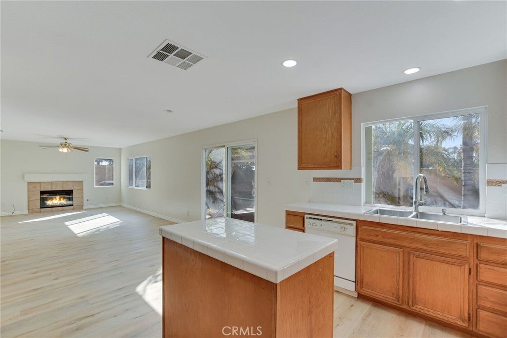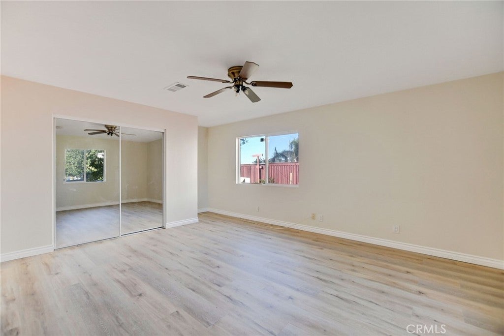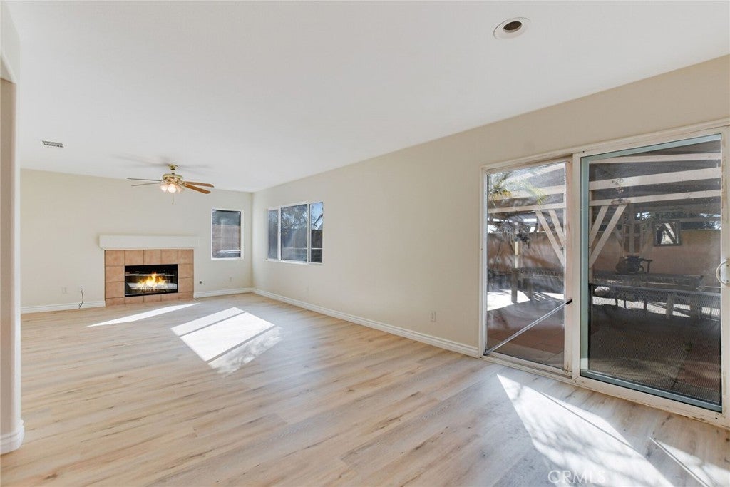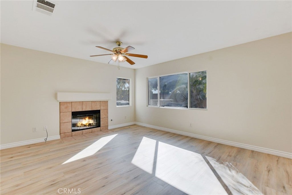 Absolutely gorgeous two-story home in a prime location recently updated with interior paint and new flooring throughout. This home has so much to offer, including a spacious living room with high ceilings and a cozy family room with a fireplace. The kitchen and dining area are open and inviting, featuring a center island, recessed lighting, a built-in office desk area, and tile flooring. Downstairs, you'll find two bedrooms and a full bathroom. Upstairs include three generously sized bedrooms, including the main suite with its own private bathroom. The main suite boasts a dual-sink vanity, walk-in closet, enclosed shower, and a relaxing bathtub. The spacious backyard features orange trees and a covered concrete patio—perfect for entertaining. There's also plenty of room to add a pool or start your own vegetable garden. Additional features include an indoor laundry room with tile flooring and shelving, a two-car attached garage, low HOA, and a convenient location close to parks, shops, entertainment, freeways (91, 60, and 15), golf courses, and restaurants.