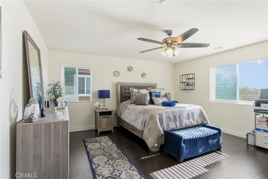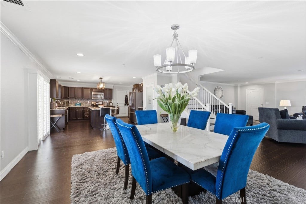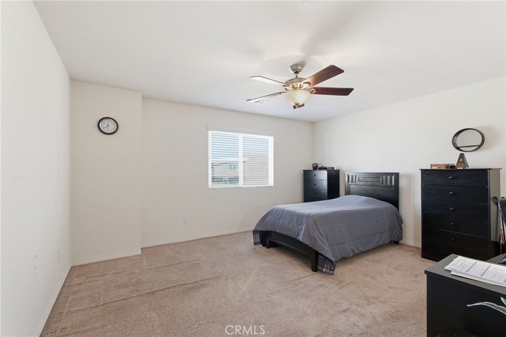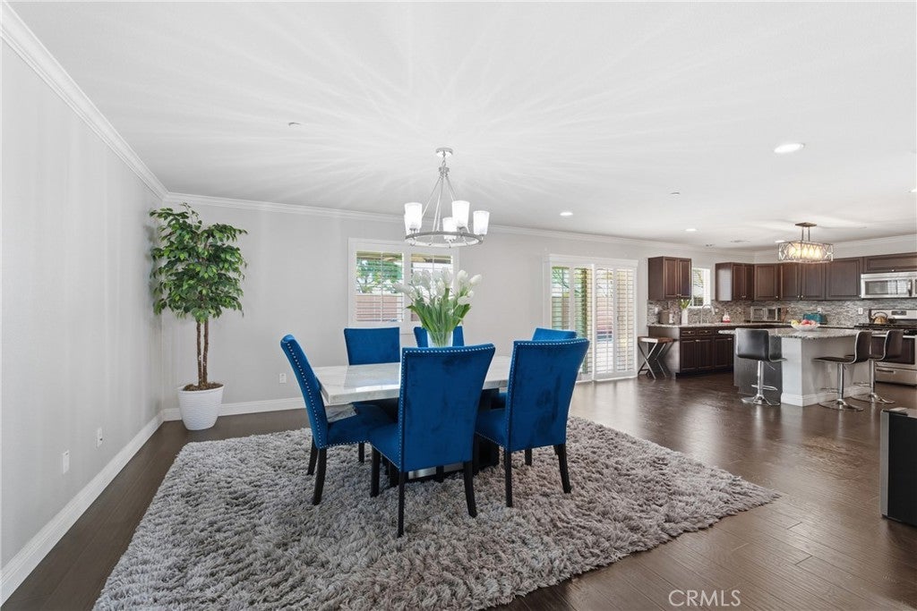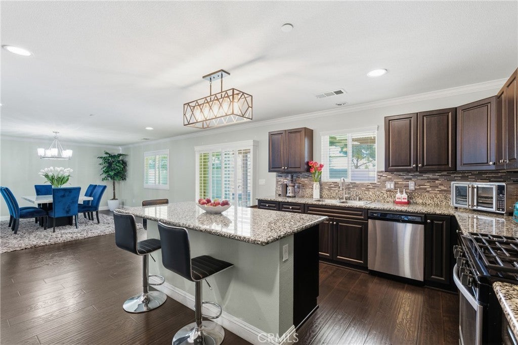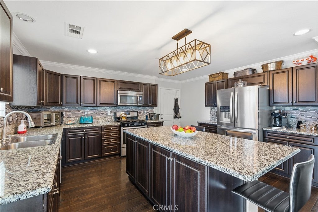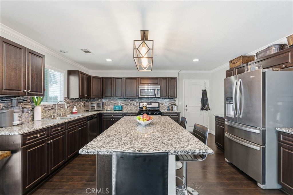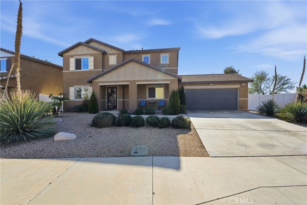 This move-in-ready 4 bedroom, 3 bath home is located in one of Moreno Valley’s most sought-after neighborhoods and sits on a large 0.25 acre lot. Designed for comfort and flexibility, the home features an open-concept layout with abundant natural light, wood flooring throughout, crown molding, and a highly desirable downstairs bedroom with a full bath. The upgraded kitchen includes an oversized island, granite countertops, stainless steel appliances, tile backsplash, and a custom pantry door, seamlessly connecting to the living and dining areas—perfect for entertaining. Upstairs offers wood flooring and plantation shutters throughout. The low-maintenance backyard features a vinyl patio cover, ceiling fans, and rain gutters, making it ideal for year-round enjoyment. Convenient freeway access, nearby shopping, and close proximity to elementary, middle, and high schools complete this exceptional opportunity.