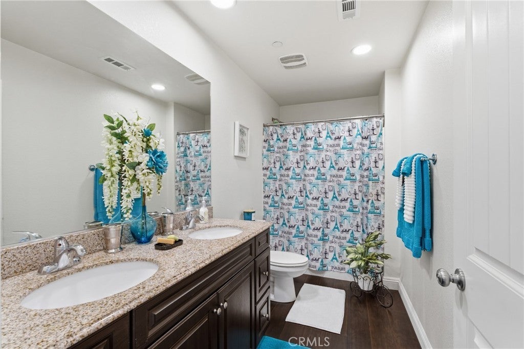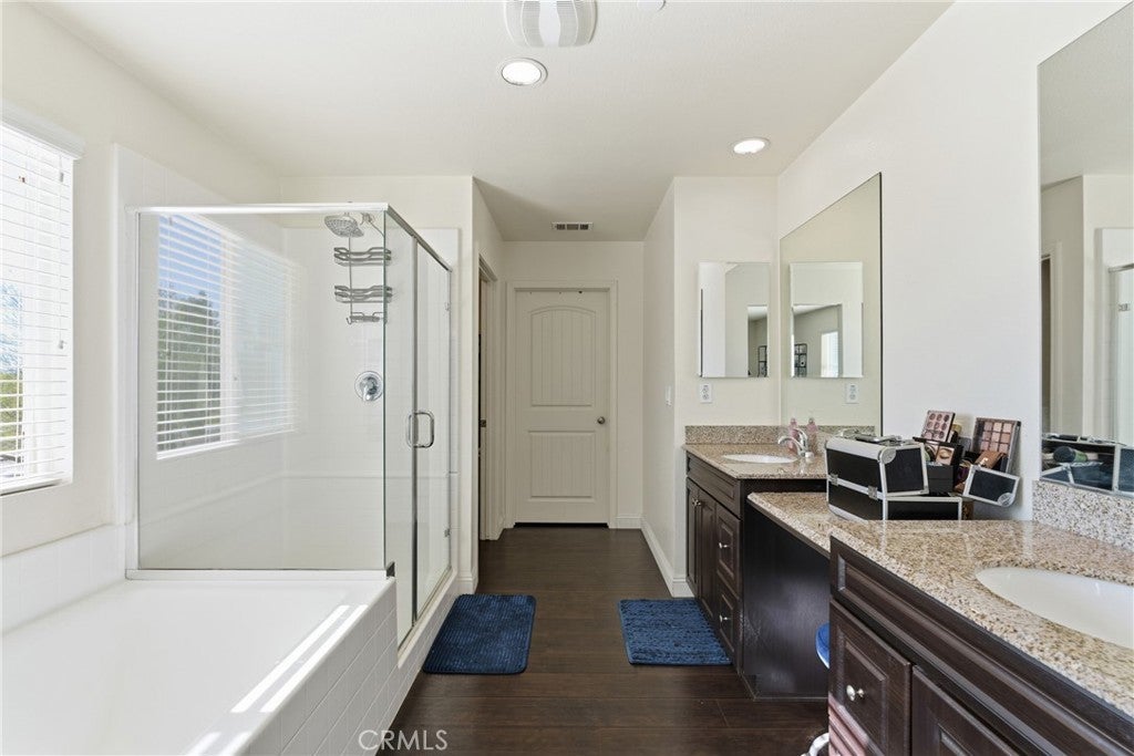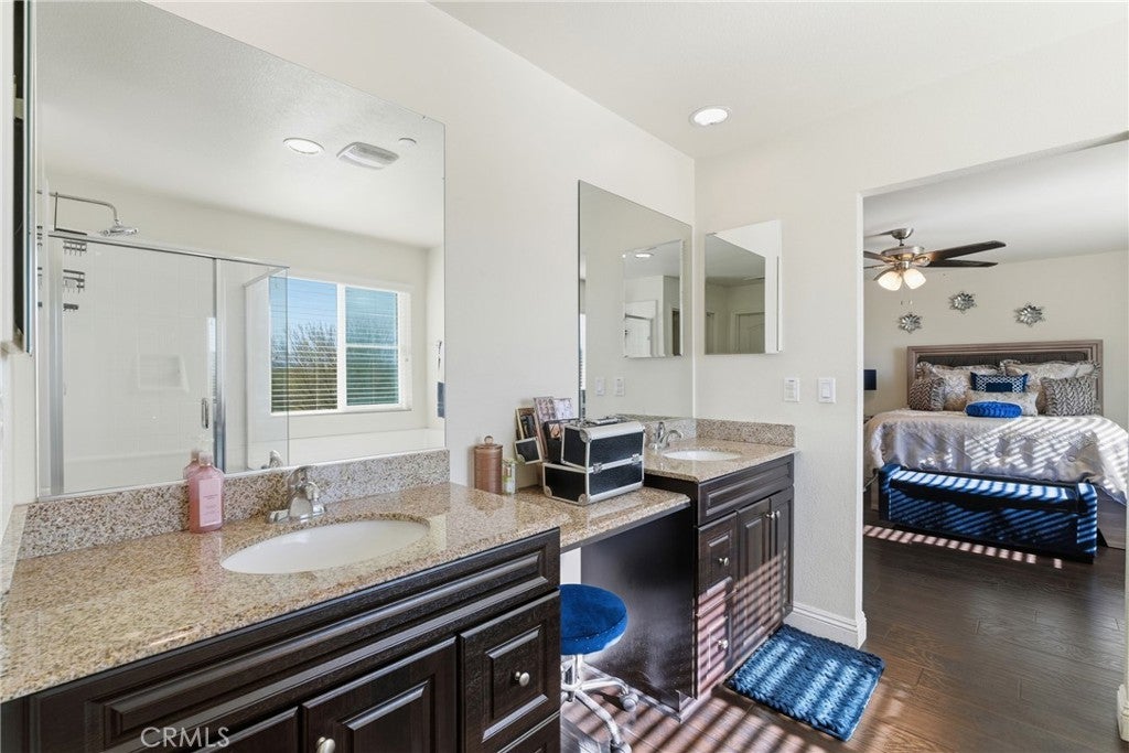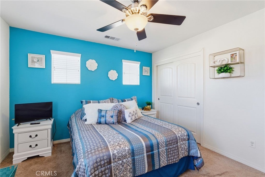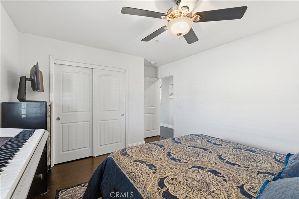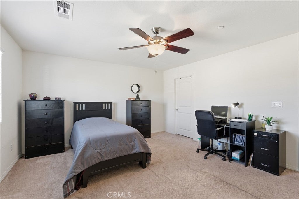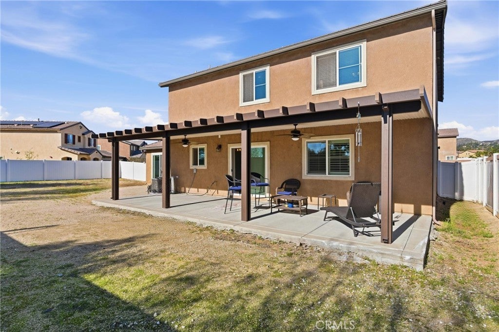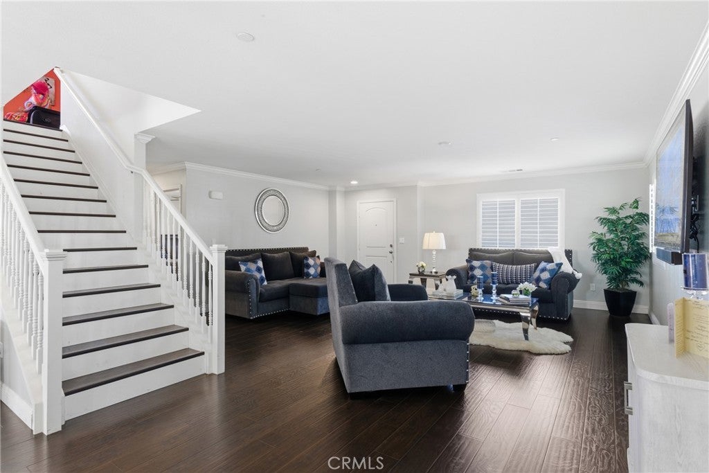 This move-in-ready 4 bedroom, 3 bath home is located in one of Moreno Valley’s most sought-after neighborhoods and sits on a large 0.25 acre lot. Designed for comfort and flexibility, the home features an open-concept layout with abundant natural light, wood flooring throughout, crown molding, and a highly desirable downstairs bedroom with a full bath. The upgraded kitchen includes an oversized island, granite countertops, stainless steel appliances, tile backsplash, and a custom pantry door, seamlessly connecting to the living and dining areas—perfect for entertaining. Upstairs offers wood flooring and plantation shutters throughout. The low-maintenance backyard features a vinyl patio cover, ceiling fans, and rain gutters, making it ideal for year-round enjoyment. Convenient freeway access, nearby shopping, and close proximity to elementary, middle, and high schools complete this exceptional opportunity.