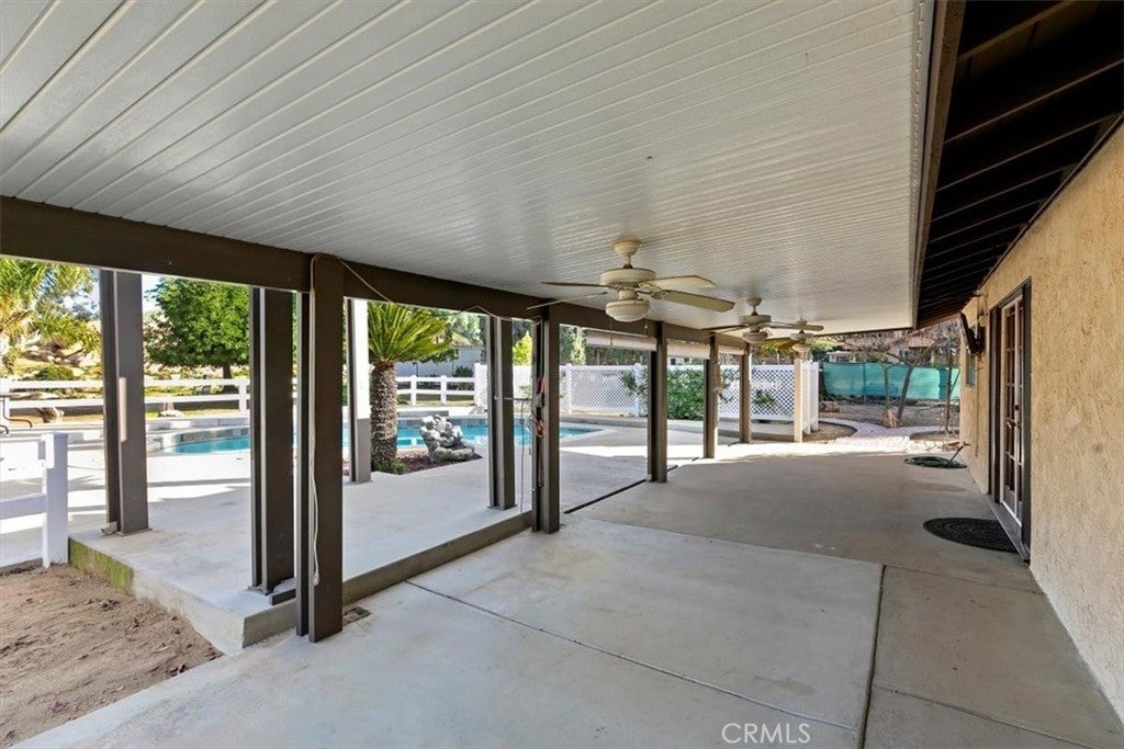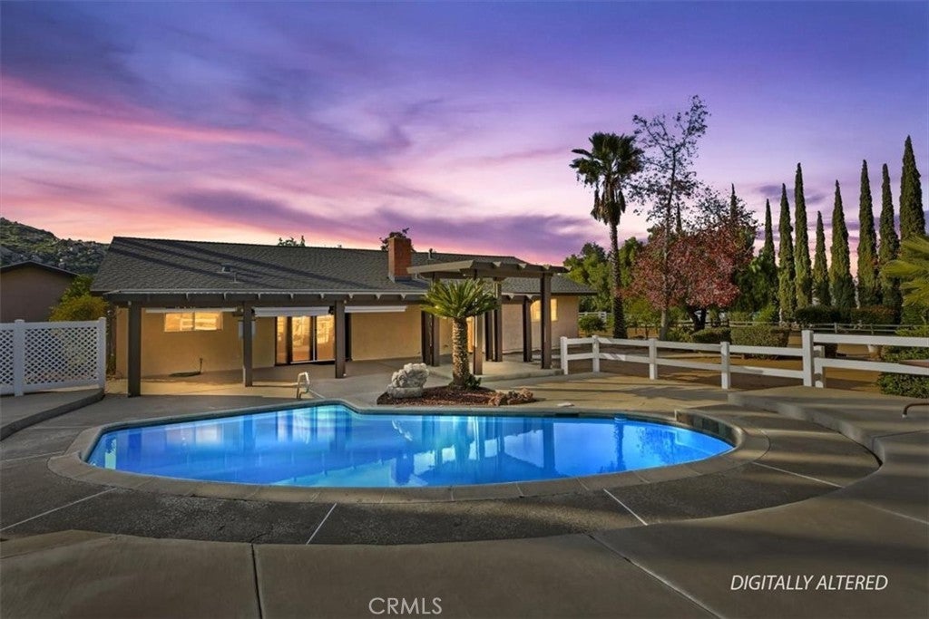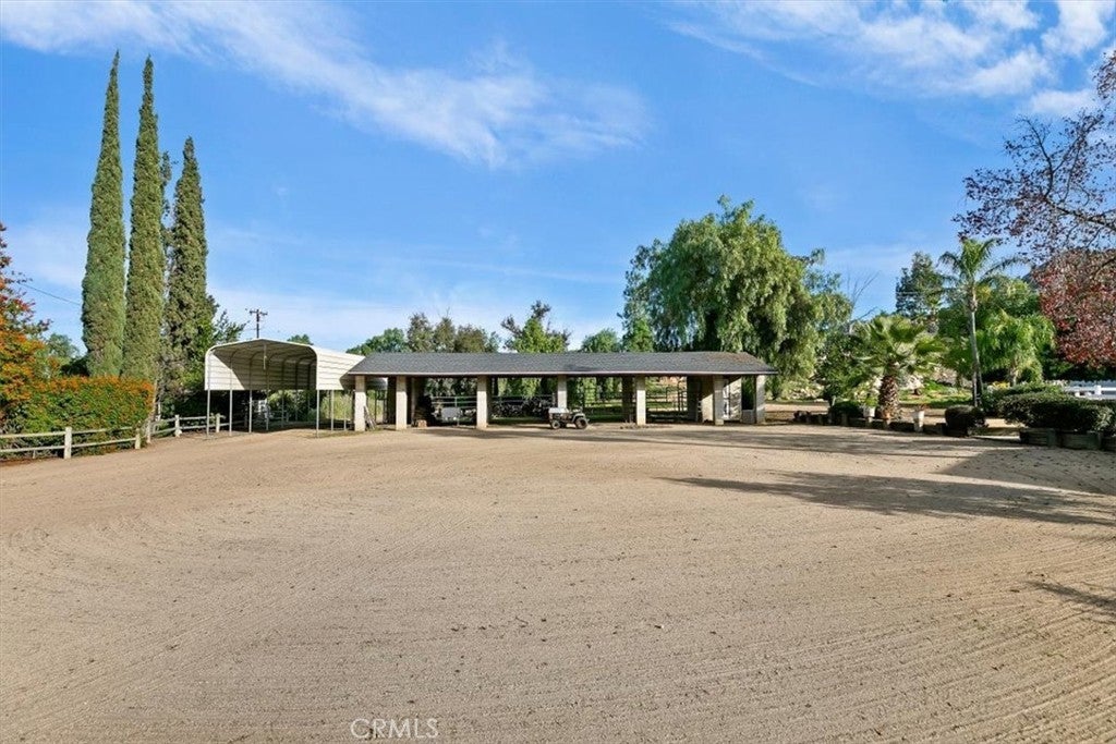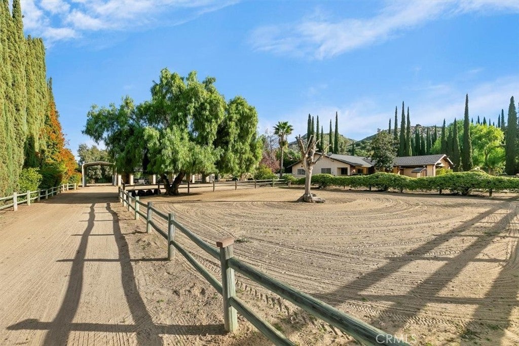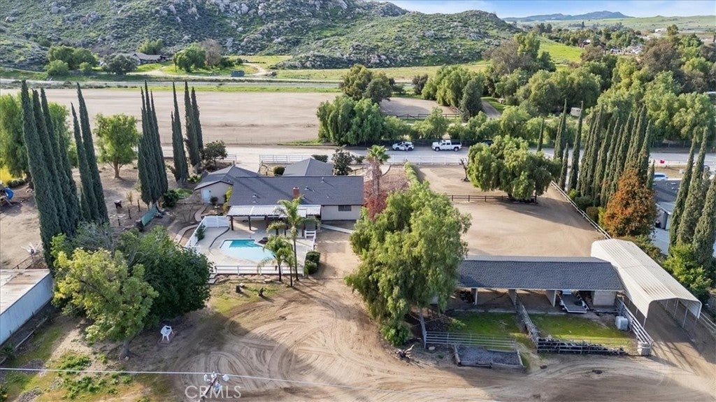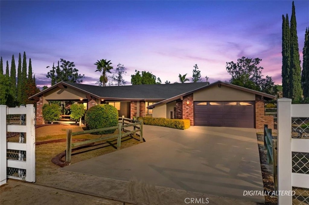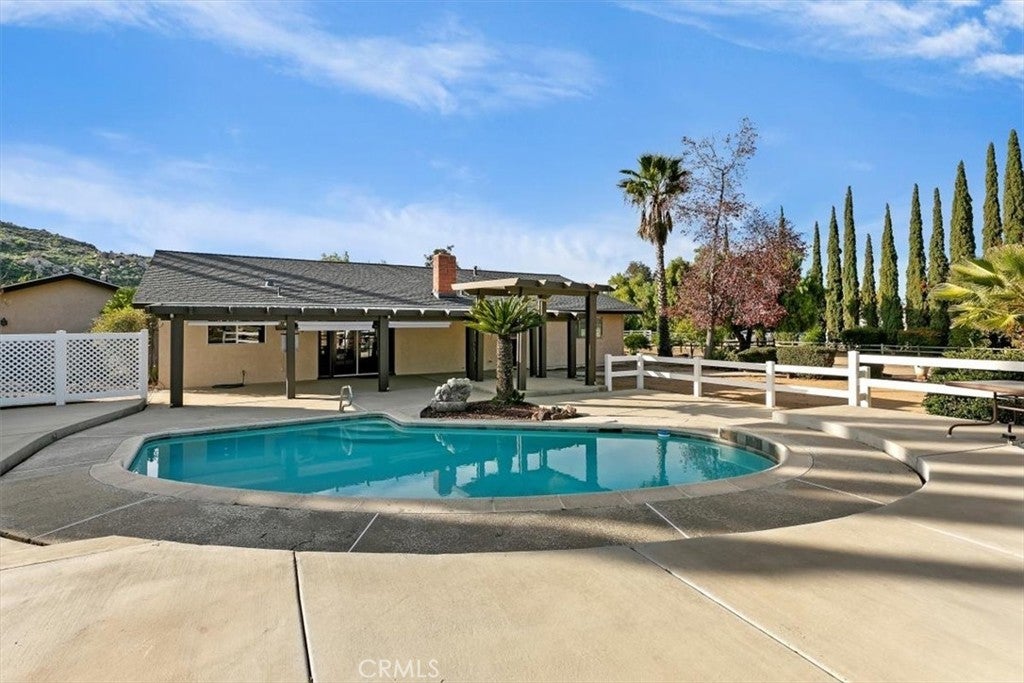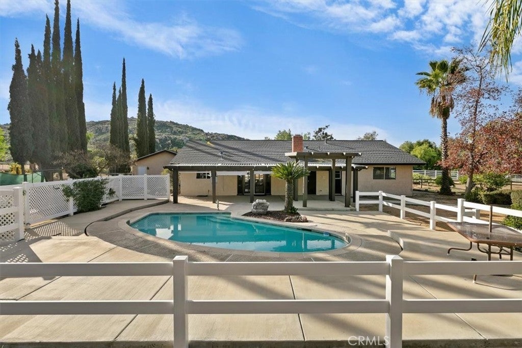 Beautifully maintained ranch-style home featuring a charming covered front carriage porch, privately gated and situated on 1.50 acres with a circular driveway. The property is fully fenced with convenient pull-through double gates providing full access to the backyard. Step inside to a tiled entry and formal living room accented with plantation shutters. The inviting family room showcases stunning wood-beamed ceilings and a dramatic full rock wood-burning fireplace creating warmth and character throughout. Real wood doors and wood casings highlight the home’s quality craftsmanship. The kitchen is open to the family room and offers a breakfast bar, granite countertops, newer stainless steel appliances, double ovens, microwave, and large windows overlooking the backyard. The home features 3 spacious bedrooms and 2 bathrooms, including a hall bath with tub/shower combo. The primary suite includes a private bathroom with dual sinks, vanity, and direct access to the back patio. The exterior has been freshly painted and the backyard is perfect for entertaining with a covered patio featuring an Alumawood cover and a sparkling swimming pool. Equestrian amenities include a 4-stall block barn with tack room and hay storage, along with a large RV cover. Plenty of room for an arena, shop, or ADU. This exceptional property truly reflects pride of ownership.