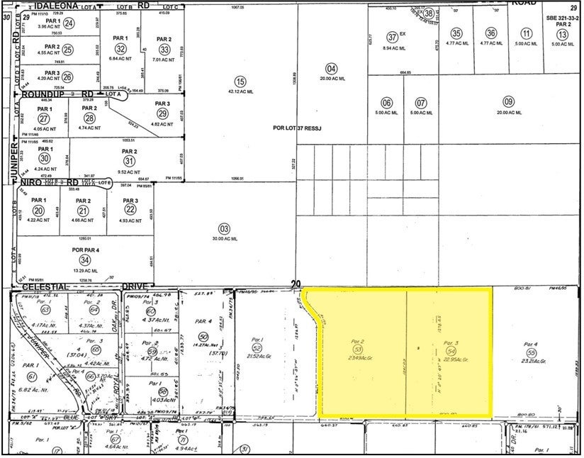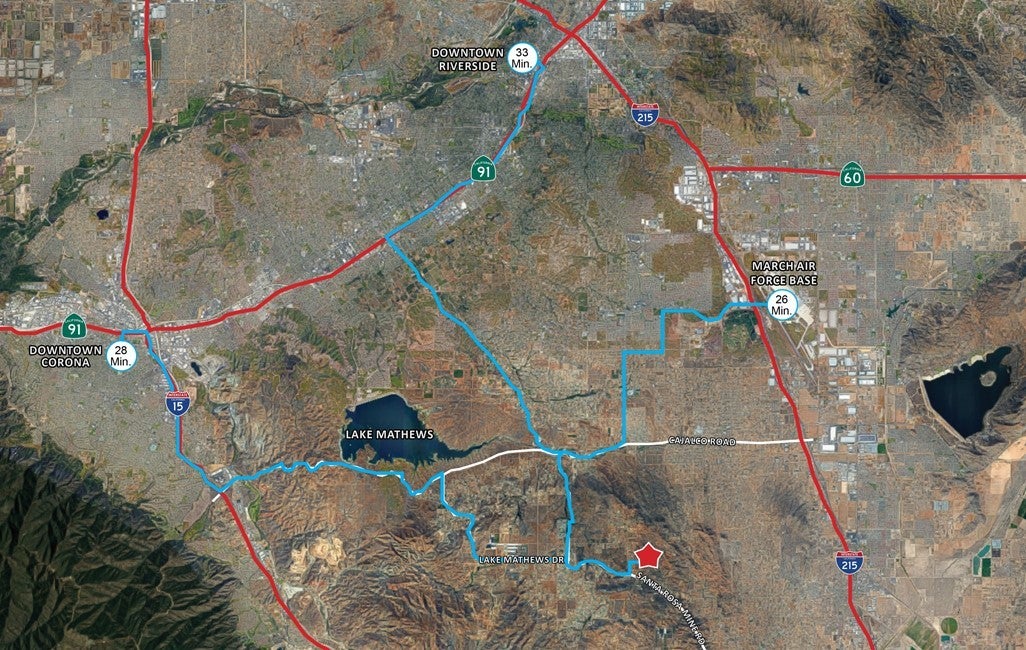 The offering consists of two parcels totaling approximately 46.44 acres of land within the Lake Matthews area in Riverside County. The parcels have frontage on Blue Sky Road. The area surrounding the property consists of mostly rural residential/large lot homes and some agricultural operations. The property lies approximately 4.5 miles from Highway 74 access which connects to the I-215 to the north and the I-15 to the south. Additionally, the property is within the Lake Matthews/Woodcrest Planning Area of Riverside County’s General Plan. It has a zoning classification of R-A-2 ½ which allows for single family residences on a minimum lot size of 2.5 acres consistent with the development standards in the county’s municipal code. A total of 98 adjacent acres are available under the same ownership. Seller may carry. Please reach out with any questions / interest.