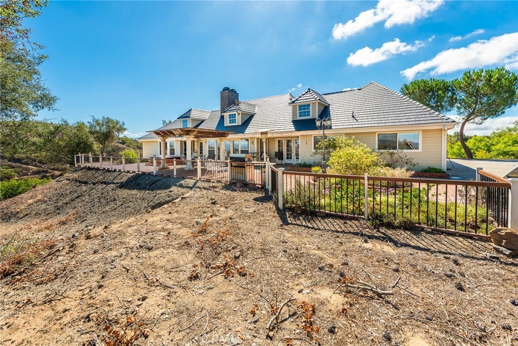 De Luz property- Nestled on a sprawling 5.15-acre lot in a desirable area of Temecula five minutes from Old Town, this scenic single-story residence offers a tranquil, large-lot lifestyle with exceptional potential. The main level of the home provides a comfortable layout featuring 3 bedrooms and 2.5 bathrooms. The inviting, open-concept design flows through expansive living areas, including a formal dining room and a large family room. Elegant details abound, such as Brazilian Cherry engineered flooring, classic wainscoting, and French doors leading to the exterior. The large kitchen is the heart of the home, featuring oak wood cabinetry, travertine tile flooring, and a convenient butler’s pantry. The adjacent dedicated dining area is perfect for casual meals. Utility spaces include a spacious laundry room with a large porcelain sink, upper and lower cabinets, and matching travertine tile. The luxurious Primary Suite offers a walk-in closet, a dedicated fireplace, and an en-suite bathroom complete with double basins and a relaxing Jacuzzi tub. A unique opportunity exists in the upper level, which features two rooms and a loft—perfect for extra storage or flexible space. Outside, the backyard features extensive brick paving and a 7-foot Jacuzzi-brand hot tub, ideal for enjoying the quiet acreage.