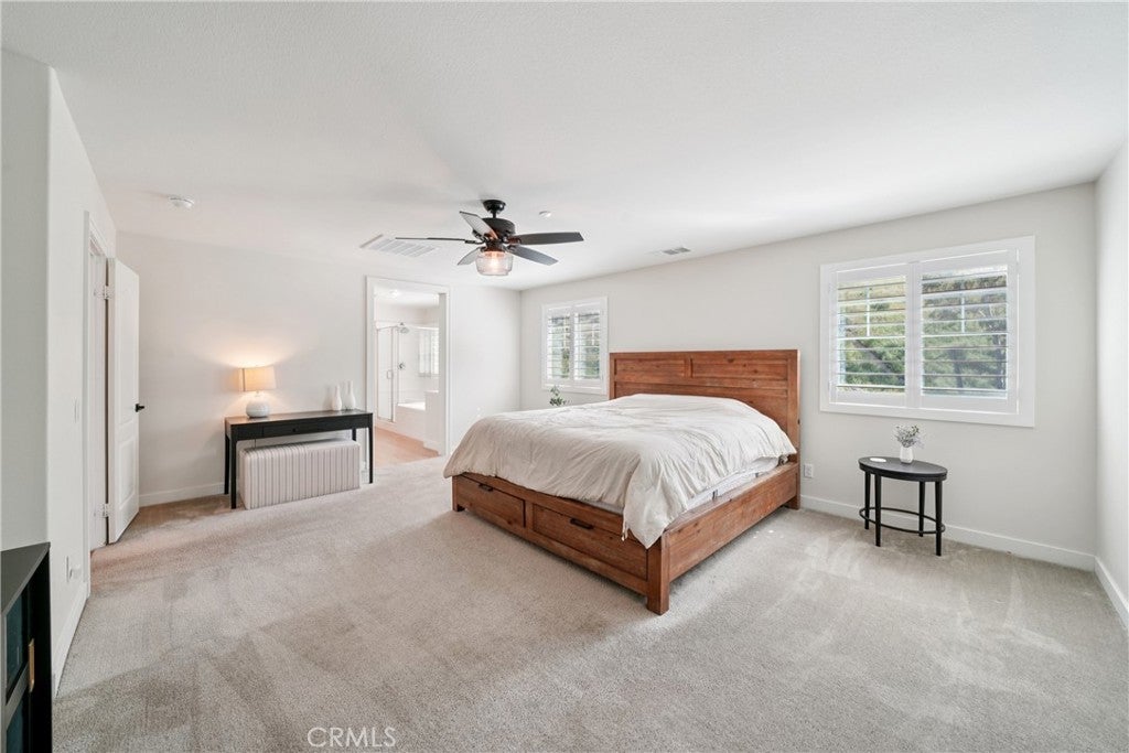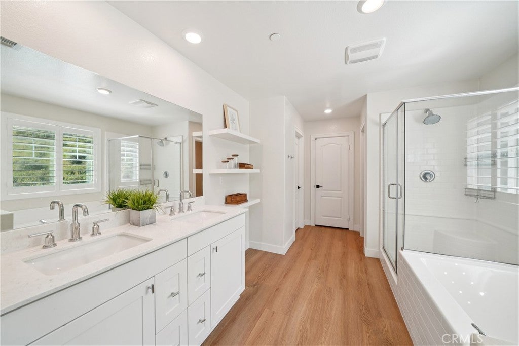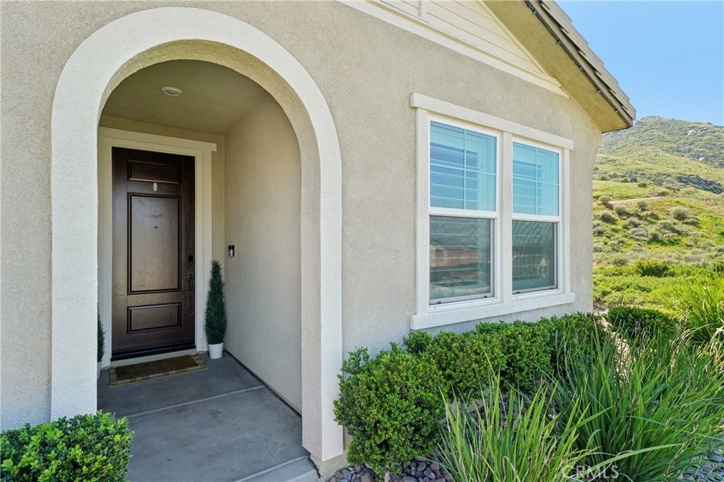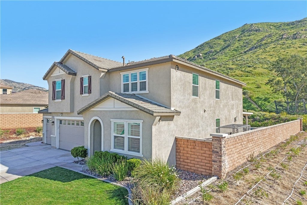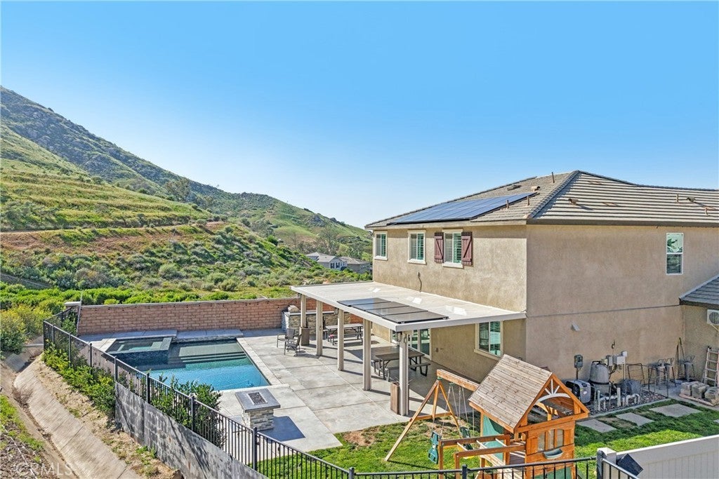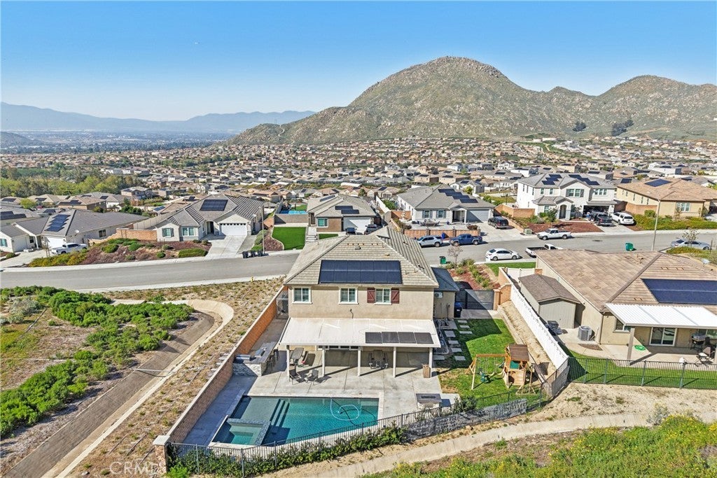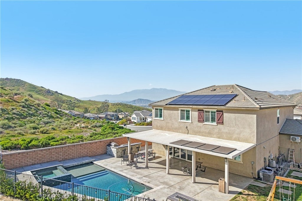 Stunning upgraded home featuring 9-ft ceilings, wood-look vinyl flooring, plantation shutters, and an open-concept floor plan filled with natural light. The spacious kitchen offers modern appliances and flows seamlessly into the main living and dining areas, perfect for everyday living and entertaining. The private backyard is a true retreat with no rear neighbors and no neighbor on the left for added privacy. Enjoy a heated pool and spa, BBQ island, gas fire pit, insulated patio cover, and beautiful mountain views, creating the perfect outdoor living space. Additional highlights include owned solar panels, a 3-car garage, epoxy garage flooring, mini-split A/C in the garage, a generator ready electrical switch, and potential RV parking. A rare opportunity to own a move-in-ready home with a resort style backyard, privacy, and scenic views, perfect for entertaining and relaxing.