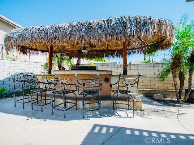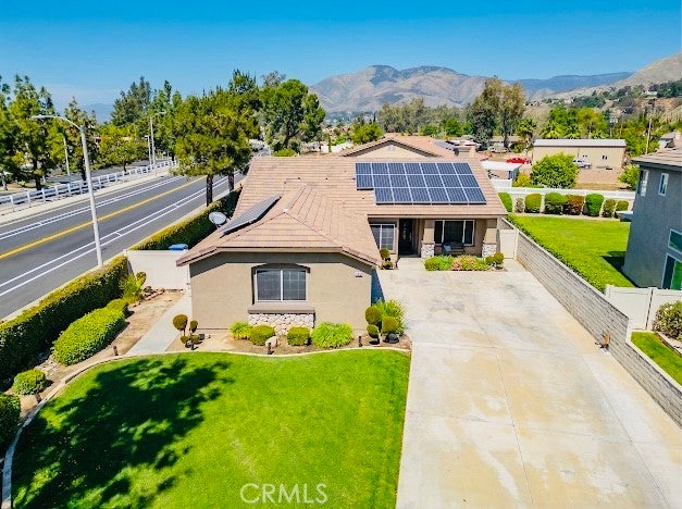 Beautiful Single Story 4 Bedroom 2 full bath home on a large 10,400 size lot that comes with a Resort-style backyard. The kitchen features granite countertops, lots of cabinet space with a touch of decorative glass cabinet doors and kitchen nook. The family room is adjacent to the kitchen comes with a cozy fireplace. The formal dining and living room has vaulted ceilings and wood shutters. You will also find ceiling fans throughout the house. The main bedroom has walk in closet, en-suite bathroom, sliding door for easy access to the beautiful backyard. The main bathroom was upgraded about 3 years ago features double sink vanities, self closing cabinet doors and a walk in shower. The second bathroom has double sink vanities and a bath tub. Indoor laundry, a well maintained front and fully fenced back yard for privacy, a three car garage, a long driveway for RV, trailor, boat or additional parking plus the exterior of the home was recently painted. The back yard is ready for relaxation or entertainment with a sparkling pool and spa, BBQ island and a Palapa, covered patio with ceiling fans etc. Beautiful views of the Mountains, easy access to fwys and shopping. NO HOA and buyer to assume solar lease.