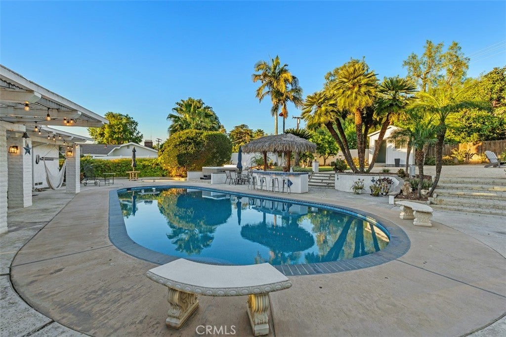Located in the sought after Alessandro Heights neighborhood, on one of Riverside's most desirable streets, is this beautifully maintained 3-bedroom, 2.5-bath home featuring luxury vinyl plank flooring throughout and a light-filled, functional layout designed for both everyday living and entertaining. The updated kitchen is the heart of the home, showcasing shaker-style cabinetry with soft-close doors and drawers, quartz countertops, a farmhouse sink, center island with built-in microwave, breakfast bar seating, and a spacious pantry. The main living room opens seamlessly to the kitchen and dining area, creating an inviting great room feel, complete with a cozy fireplace. The dining room is lined with large picture windows that frame views of the stunning backyard. A separate, oversized family room offers even more space to relax or gather, featuring a second fireplace and sliding glass doors leading to the patio. The primary suite is a private retreat with a walk-in closet, dual vanity, soaking tub, and walk-in shower. Both guest bedrooms are well-appointed: one with direct backyard access, crown moulding, recessed lighting, and ceiling fan; the other with plantation shutters, crown moulding, and ceiling fan. Step outside to your own backyard oasis, perfect for entertaining or unwinding. Enjoy two covered patios, a sparkling pool with pebble-tech finish, above ground jacuzzi, expansive hardscape, and mature landscaping that creates a peaceful, private setting. The detached casita with air conditioning offers an ideal work-from-home office, art studio, or creative space with views of the pool and yard. To top it all off, the property features an incredible collection of fruit trees, including orange, lemon, clementine, tangelo, and large avocado trees bringing both beauty and bounty to your outdoor space.