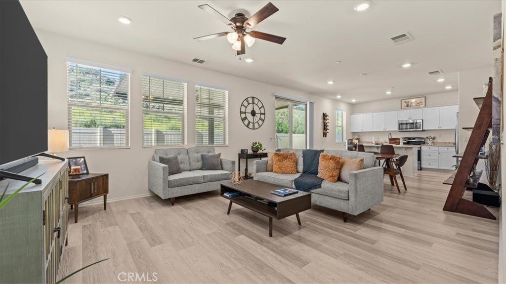 Welcome to this beautifully maintained 3-bedroom, 2.5-bathroom home offering modern design, clean lines, and an inviting open-concept layout perfect for everyday living and entertaining. The bright and spacious main level features a seamless flow between the living room, dining area, and a well-appointed kitchen with white cabinetry, stainless steel appliances, and a large island with bar seating, all enhanced by abundant natural light and stylish flooring throughout. Upstairs, you’ll find generously sized bedrooms, including a serene primary suite with a private bath and walk-in closet, along with well-positioned secondary bedrooms. The home also offers a convenient upstairs laundry area, recessed lighting, and an attached 2-car garage. Step outside to a private backyard with direct access from the main living space, offering the perfect setting for relaxing, entertaining, or enjoying the peaceful hillside views behind the home. With its thoughtful layout and move-in-ready condition, this home is a standout opportunity.