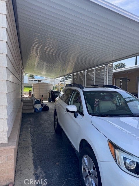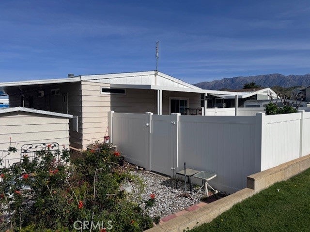 Manufactured home. Concrete on both sides. Rock landscaping at front. Window overhangs at front. Carport on one side. Covered front patio. Rear fenced area adjacent to open space. Front and rear entry. Rear ramp. Kitchen with stainless steel double-basin sink and laminate countertops. Storage shed behind carport. Vinyl fencing at rear.