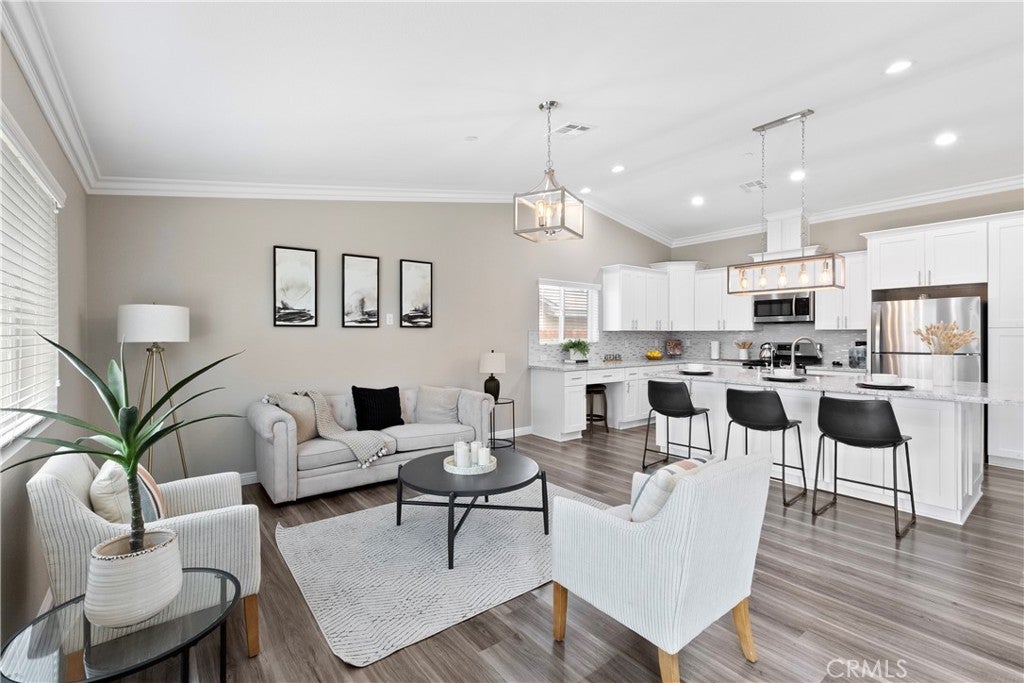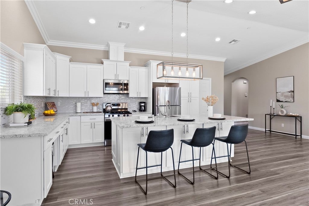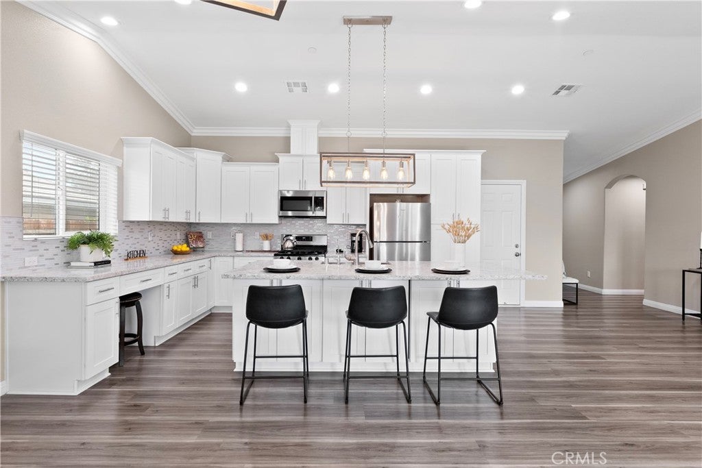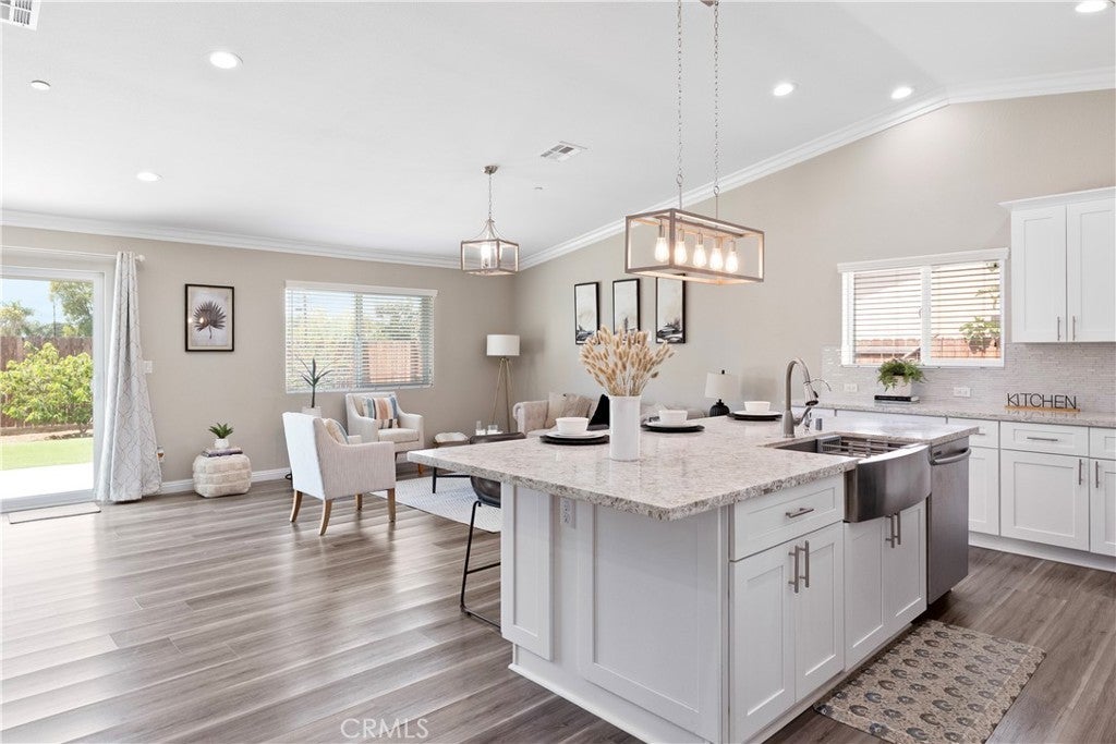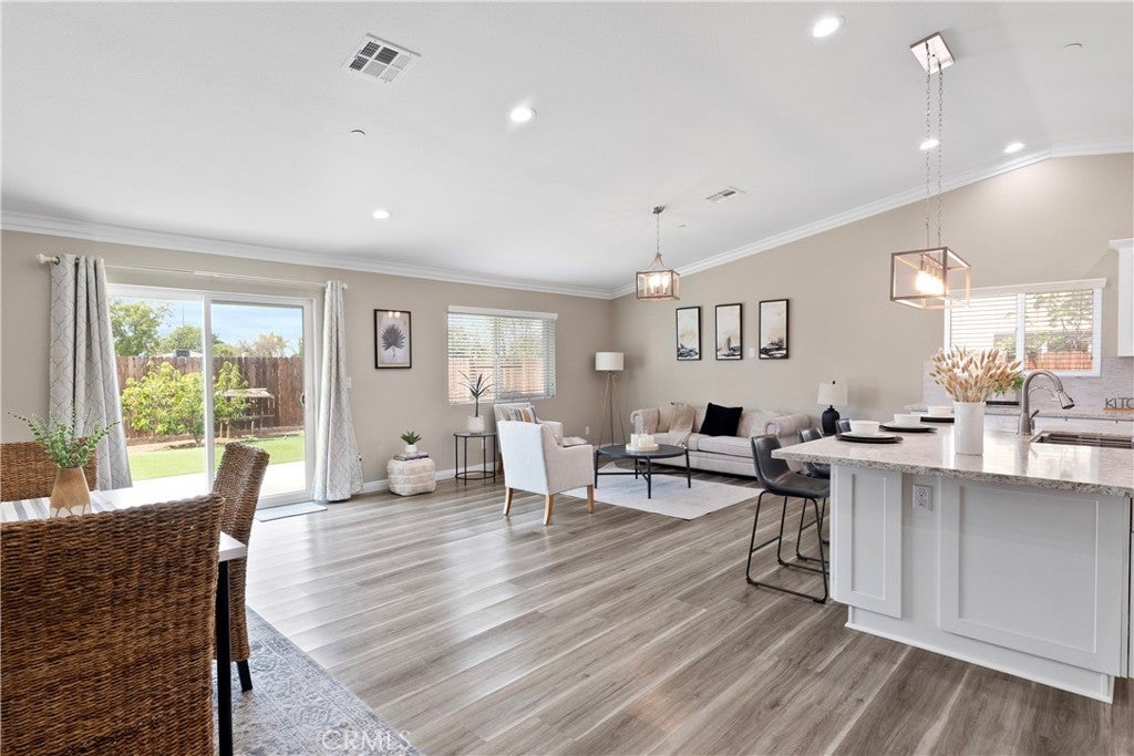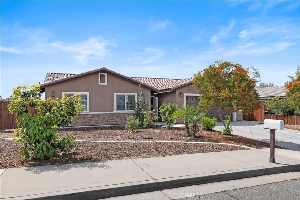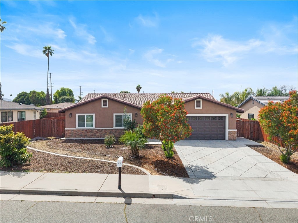 Built in 2019, this single-story Riverside home offers a functional layout with modern finishes and low-maintenance features. The home includes 4 bedrooms and 2 bathrooms, along with a 2-car attached garage, and a design that connects the main living spaces for everyday use and entertaining. The kitchen features white cabinetry, quartz countertops, stainless steel appliances, and a center island that opens directly to the living room. There is also a designated dining area along with a breakfast bar at the kitchen counter for additional seating. Vinyl flooring runs throughout the main living areas, providing durability and easy upkeep, while all bedrooms are carpeted and include ceiling fans. The primary bedroom offers a comfortable layout with carpet flooring, a walk-in closet, and an en-suite bathroom that includes a walk-in shower with tile wall surround. A separate laundry room adds convenience and keeps utility space tucked away from the main living areas. The backyard is designed for low maintenance, featuring a concrete patio area just outside the home and artificial turf in the rear yard, helping reduce water usage while still offering usable outdoor space. This home is just minutes from the 91 Freeway, with nearby shopping, dining, and access to the orange groves along Victoria Avenue. This property offers a practical combination of location, layout, and modern features. Make this great home yours today!