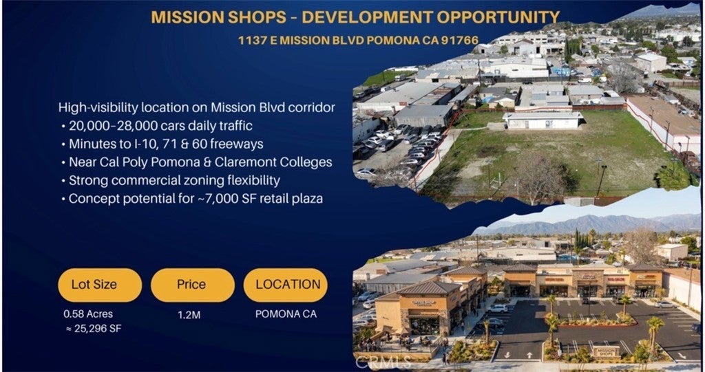 Prime development opportunity located at 1137 E Mission Blvd in Pomona, CA, offering approximately 0.58 acres (25,296 SF) of highly visible commercial land along one of the city’s busiest corridors. Strategically positioned with excellent access to Interstate 10, SR-71, and SR-60, the site benefits from strong commuter exposure with an estimated 20,000–28,000 vehicles per day. The property falls under the Pomona Corridors Specific Plan, allowing for a wide range of commercial and mixed-use developments including retail, restaurant, medical office, personal services, and more. Additional uses such as drive-thru establishments, fitness facilities, and automotive-related businesses may be permitted with city approval. This offering presents a compelling value-add development opportunity, with a proposed concept for approximately 7,000 SF neighborhood retail plaza, featuring 6–7 units and ~30 parking spaces. Surrounded by a strong population base and major educational institutions including Cal Poly Pomona, Western University of Health Sciences, and the Claremont Colleges, the site is ideally positioned to serve both residential and student-driven demand. With proximity to Downtown Pomona and continued city support for corridor revitalization, this site is well-suited for investors, developers, and owner-users seeking a high-growth opportunity in the heart of Southern California.