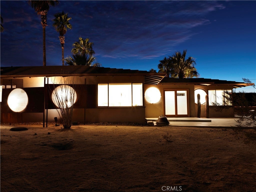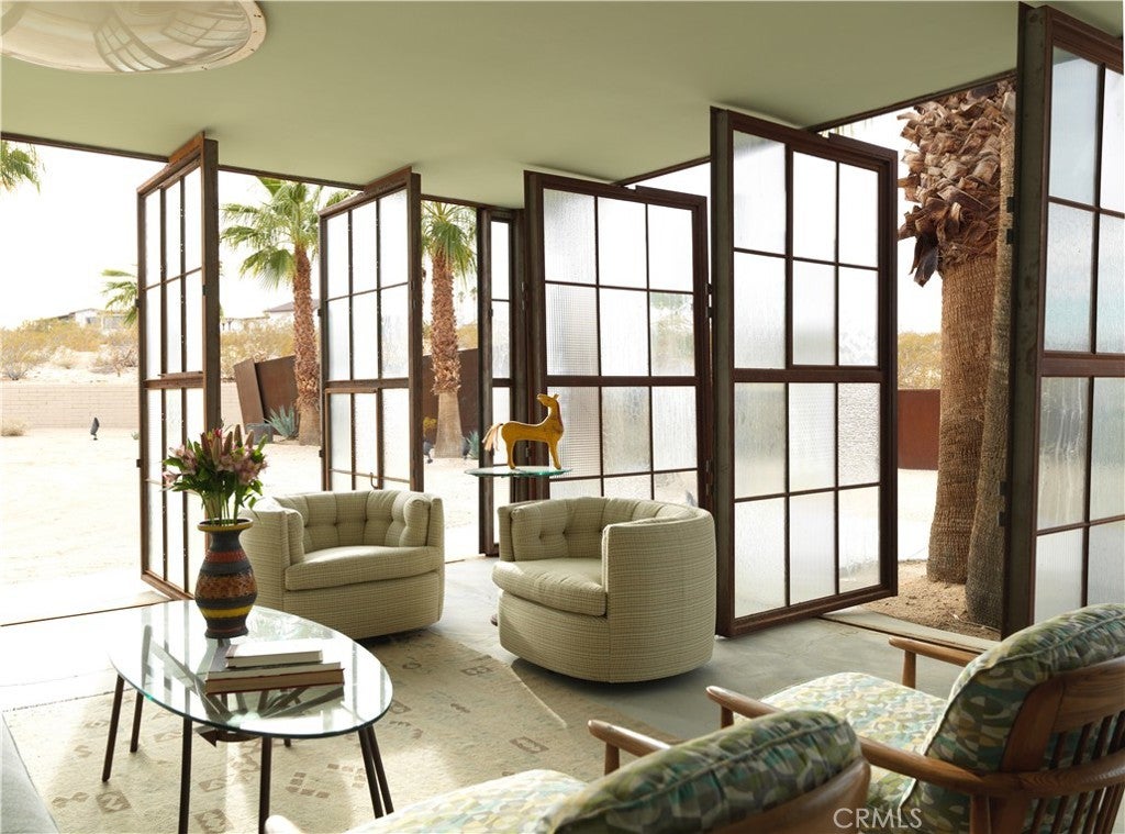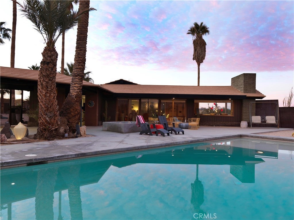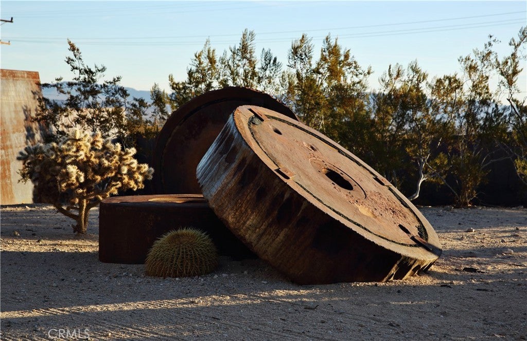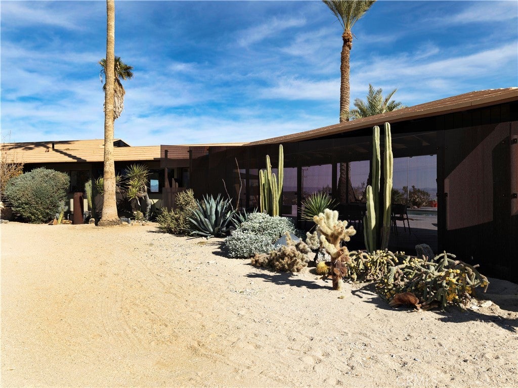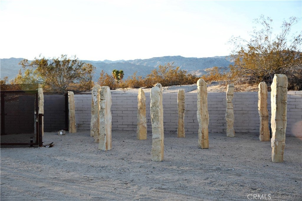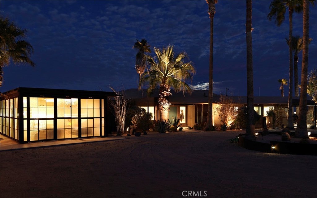 ***HUELL HOWSER’S 80-ACRE MID-CENTURY RETREAT*** Formerly owned by Huell Howser, this mid-century gem is situated on 82.7 acres and has breathtaking, unobstructed views of Joshua Tree National Park and the surrounding areas. The land is comprised of 2 legal parcels, each with additional development potential, without any subdividing. The house is situated on an 11.9-acre parcel (0614-321-38) and additional structures such as an ADU could be built. The other parcel (0615-261-01) totals 70.82 acres and protects the unobstructed national park views and amazing sunrises. It is zoned for single family homes on 1-acre lots. This parcel could also be developed with another estate home or multiple homes. After the passing of Huell in 2013, the current ownership fully restored the property and turned it into a vacation rental and wedding/event space. The home is partially gated and the grounds around the home feature mature palm trees and beautiful desert gardens that are enclosed by an iconic, architecturally designed, rusted steel fence. Extensive outdoor lighting, chosen by Huell, allows the spaces to be enjoyed in both the day and the nighttime. The home has 2 bedrooms and 2 bathrooms, a galley kitchen with a breakfast table, a great room with a wood-burning fireplace, a den/TV room or third bedroom, and a beautiful glass atrium or tea room. The master bedroom is furnished with a king-size bed, and a toddler/(day) bed. The second bedroom has a queen-size bed. The third bedroom is set up as a den or TV room, with a sofa that converts to a queen-size bed, desk & TV. The galley kitchen features classic mid-century cabinetry, concrete countertops and the original 1950s stove. The great room, has a dining table and chairs, plus media wall with TV and comfortable seating. A large dining table, that doubles as a ping pong table, is situated on the pool deck under the veranda, along with a stylish outdoor grill and vintage swing set. The pool has a maximum depth of 10 feet and also has a large tanning shelf. On one side of the pool is a separate Jacuzzi and on the opposite is a fire pit. There are five large 100-year old millstones brought in by Huell that lay about the pool area, giving the house its name. At the west end of the home is a glass atrium sitting room or tea room. The exterior walls are made of steel framed, sliding glass panels, which can be opened to blend the indoor area into the outdoor area. This landmark home is truly one-of-a-kind.