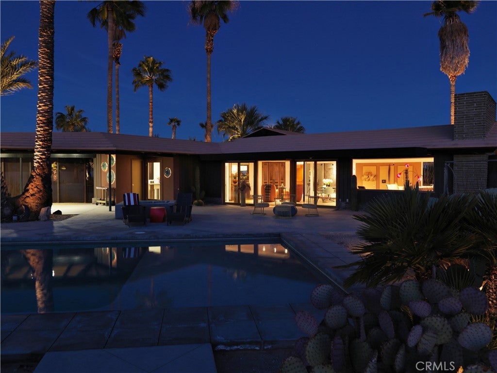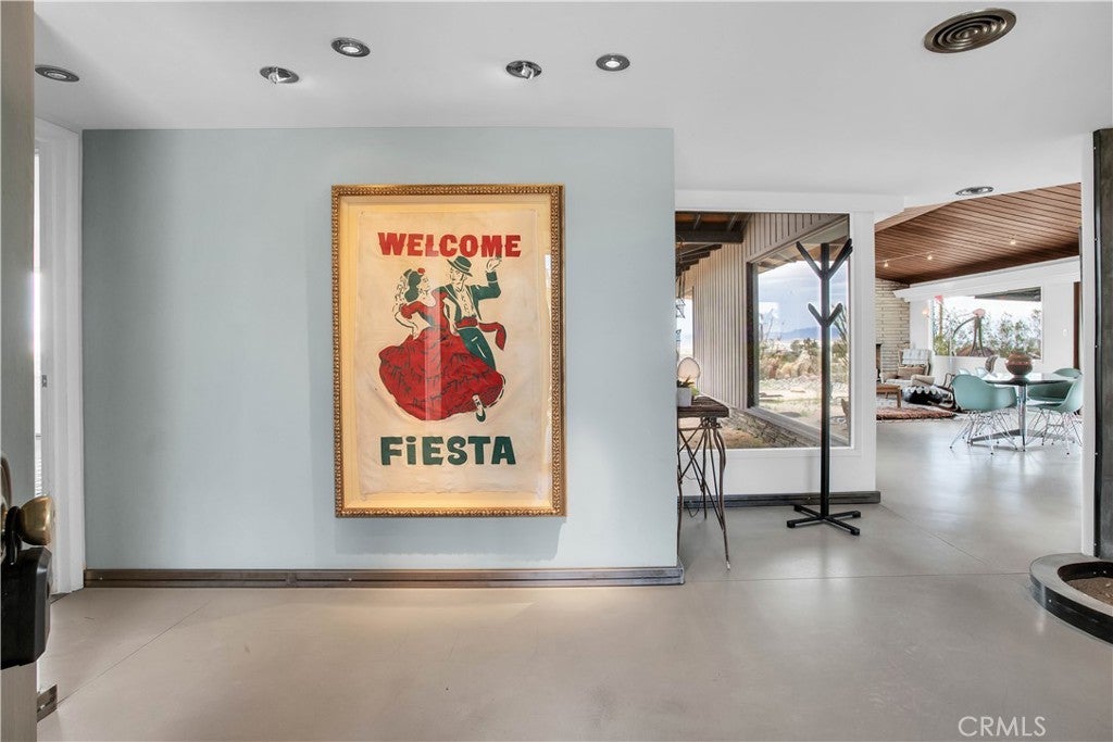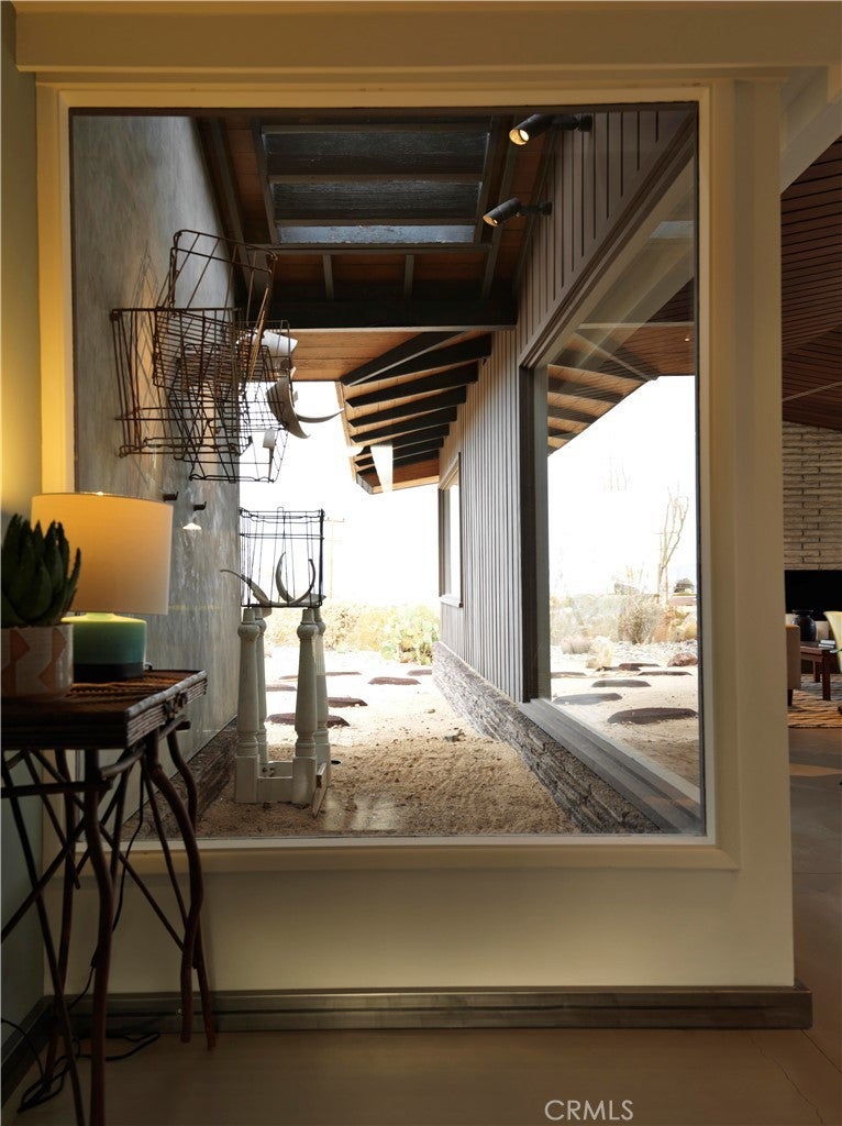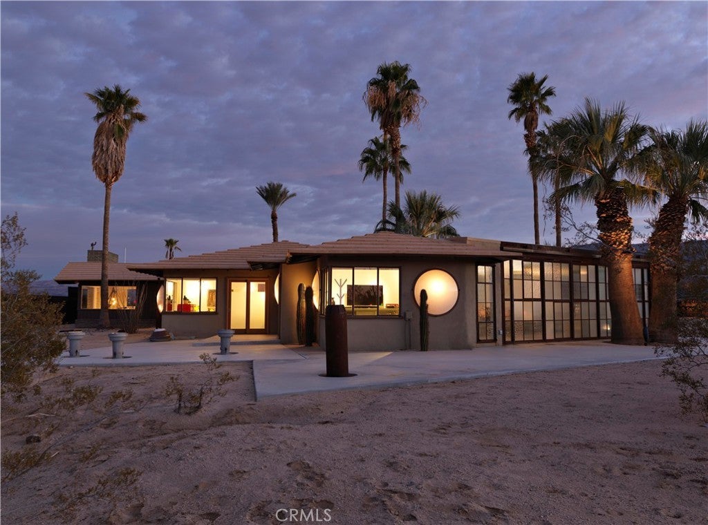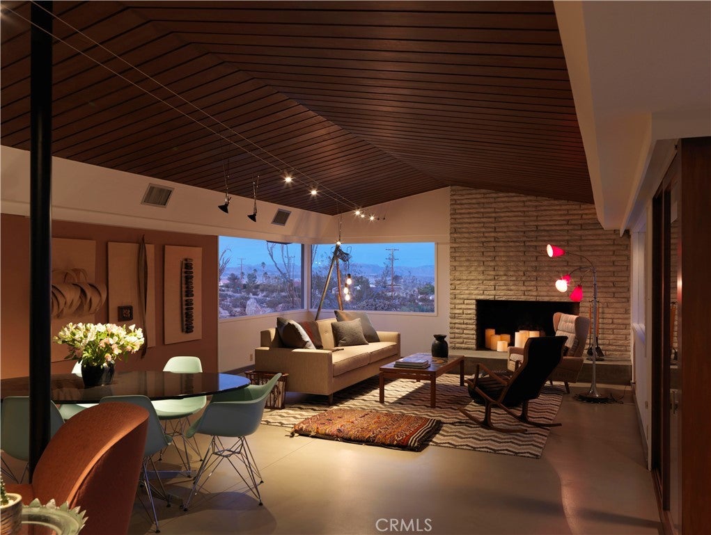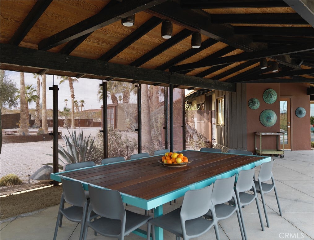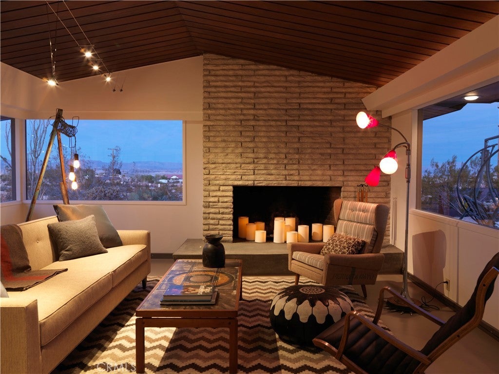 ***HUELL HOWSER’S 80-ACRE MID-CENTURY RETREAT*** Formerly owned by Huell Howser, this mid-century gem is situated on 82.7 acres and has breathtaking, unobstructed views of Joshua Tree National Park and the surrounding areas. The land is comprised of 2 legal parcels, each with additional development potential, without any subdividing. The house is situated on an 11.9-acre parcel (0614-321-38) and additional structures such as an ADU could be built. The other parcel (0615-261-01) totals 70.82 acres and protects the unobstructed national park views and amazing sunrises. It is zoned for single family homes on 1-acre lots. This parcel could also be developed with another estate home or multiple homes. After the passing of Huell in 2013, the current ownership fully restored the property and turned it into a vacation rental and wedding/event space. The home is partially gated and the grounds around the home feature mature palm trees and beautiful desert gardens that are enclosed by an iconic, architecturally designed, rusted steel fence. Extensive outdoor lighting, chosen by Huell, allows the spaces to be enjoyed in both the day and the nighttime. The home has 2 bedrooms and 2 bathrooms, a galley kitchen with a breakfast table, a great room with a wood-burning fireplace, a den/TV room or third bedroom, and a beautiful glass atrium or tea room. The master bedroom is furnished with a king-size bed, and a toddler/(day) bed. The second bedroom has a queen-size bed. The third bedroom is set up as a den or TV room, with a sofa that converts to a queen-size bed, desk & TV. The galley kitchen features classic mid-century cabinetry, concrete countertops and the original 1950s stove. The great room, has a dining table and chairs, plus media wall with TV and comfortable seating. A large dining table, that doubles as a ping pong table, is situated on the pool deck under the veranda, along with a stylish outdoor grill and vintage swing set. The pool has a maximum depth of 10 feet and also has a large tanning shelf. On one side of the pool is a separate Jacuzzi and on the opposite is a fire pit. There are five large 100-year old millstones brought in by Huell that lay about the pool area, giving the house its name. At the west end of the home is a glass atrium sitting room or tea room. The exterior walls are made of steel framed, sliding glass panels, which can be opened to blend the indoor area into the outdoor area. This landmark home is truly one-of-a-kind.