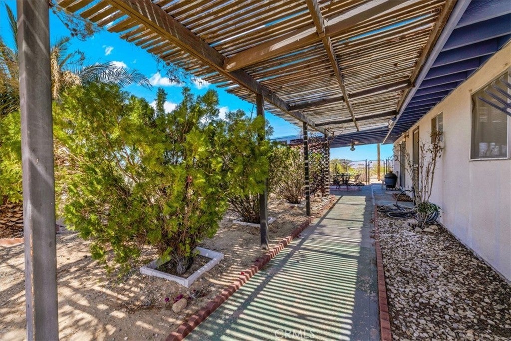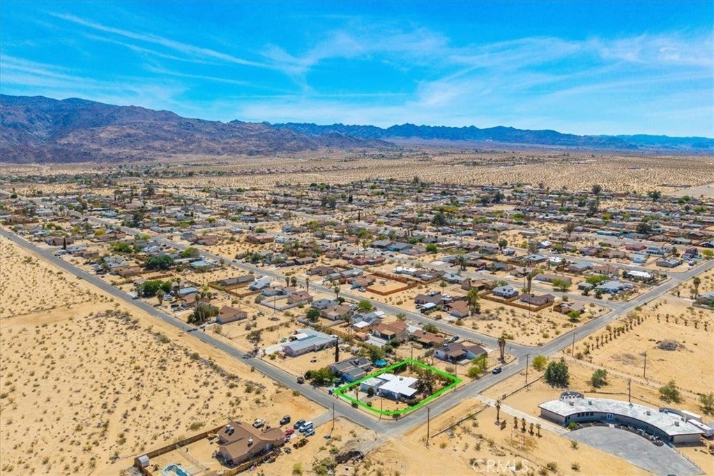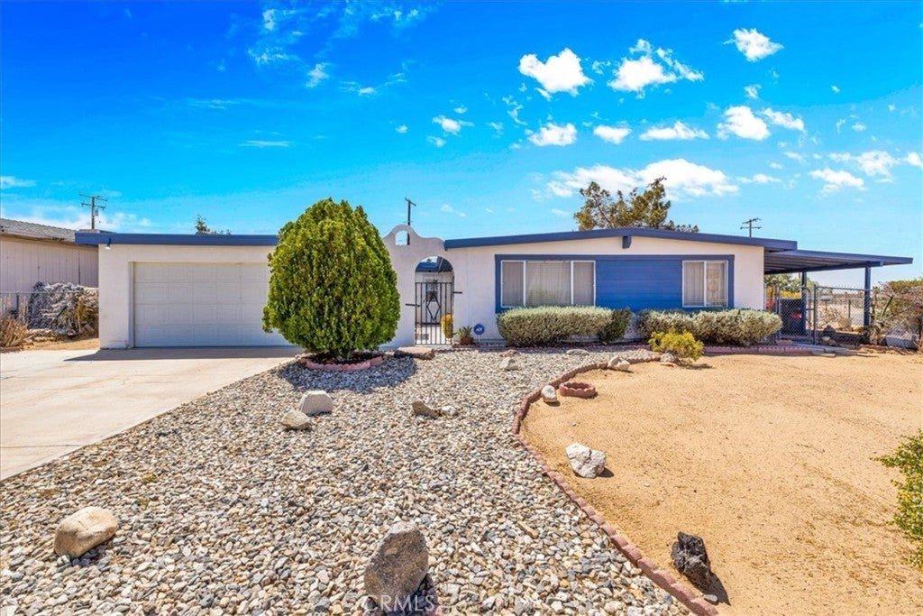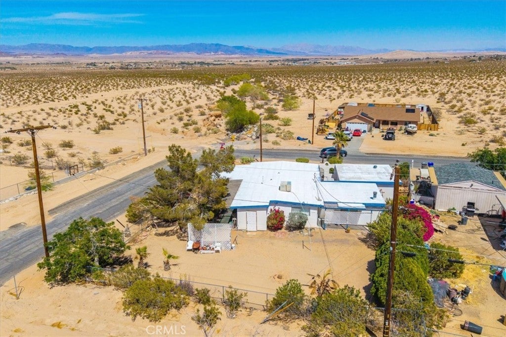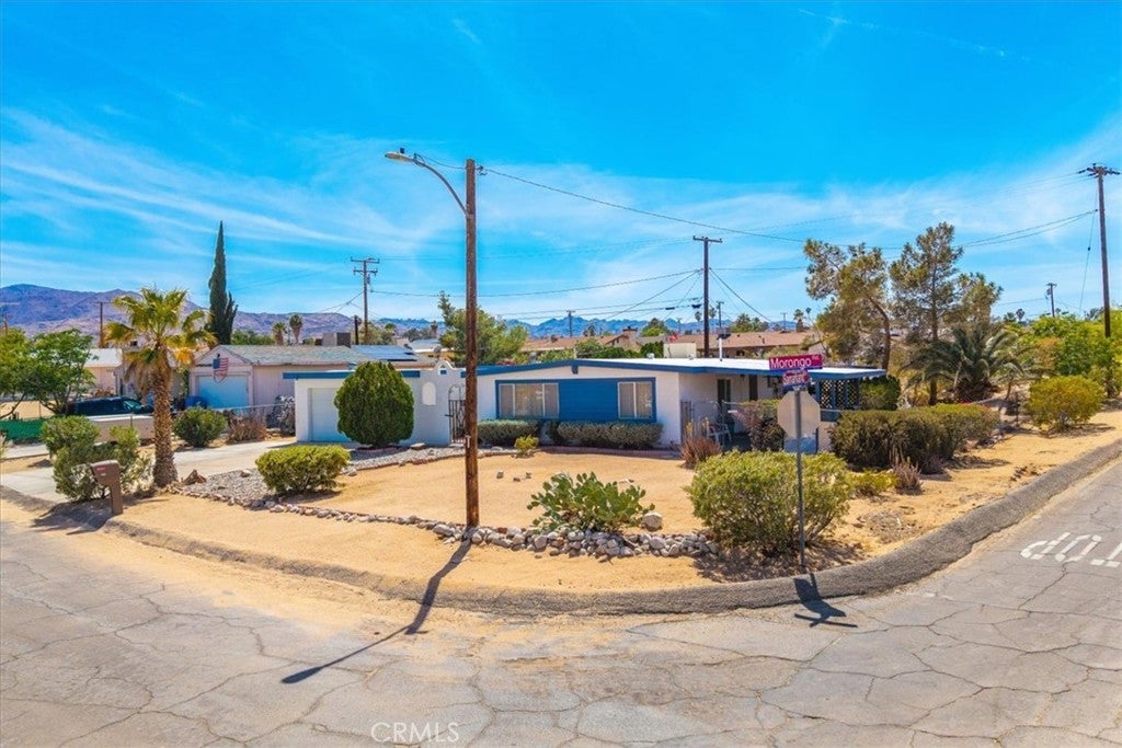 Looking for a lovely desert home or investment property with beautiful forever views?! Look no further! This charming 3 bedroom 2 bath home features 1,470 sqft of living space and is perfectly situated on a Corner Lot in the quiet Chocolate Drop neighborhood of 29 Palms mere minutes from the Marine Corps base, Joshua Tree National Park north entrance, and downtown shopping and eateries. A gated entry opens to a lovely courtyard/breezeway with delightful desert landscaping that connects the detached 2 car garage to the house. The front door opens to a nicely sized living room that flows effortlessly into the formal dining room & kitchen space. The large east-facing windows let in an abundance of natural light & the open-concept layout makes it a great space for entertaining. The kitchen is complete with beautiful granite countertops & upgraded cabinetry, a matching center island and dining table, stainless steel appliances, and ample storage space. There is a convenient storage/laundry room just off the kitchen that could make for a sizable pantry! The primary bedroom follows suit with custom built-in drawers/cabinetry and features an ensuite bathroom. The home's 3rd bedroom could be used as a large family room/den & is warmed with a lovely pellet burning fireplace, has its own breezeway entrance, backyard patio access, a mini-split and an attached pass-through room with a closet & built in bookcase (which would make for a great office space)! Outside you'll be delighted to find a fully fenced yard with a spacious covered patio (the perfect spot your for your morning coffee or evening BBQ as you take in gorgeous desert and mountain views) and plenty of space to expand, entertain or relax around a firepit on a starry desert night. Come take a look and let this home's charming allure do the rest. Your new desert home awaits!