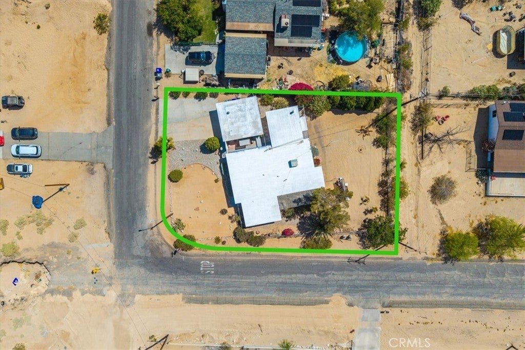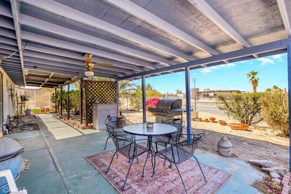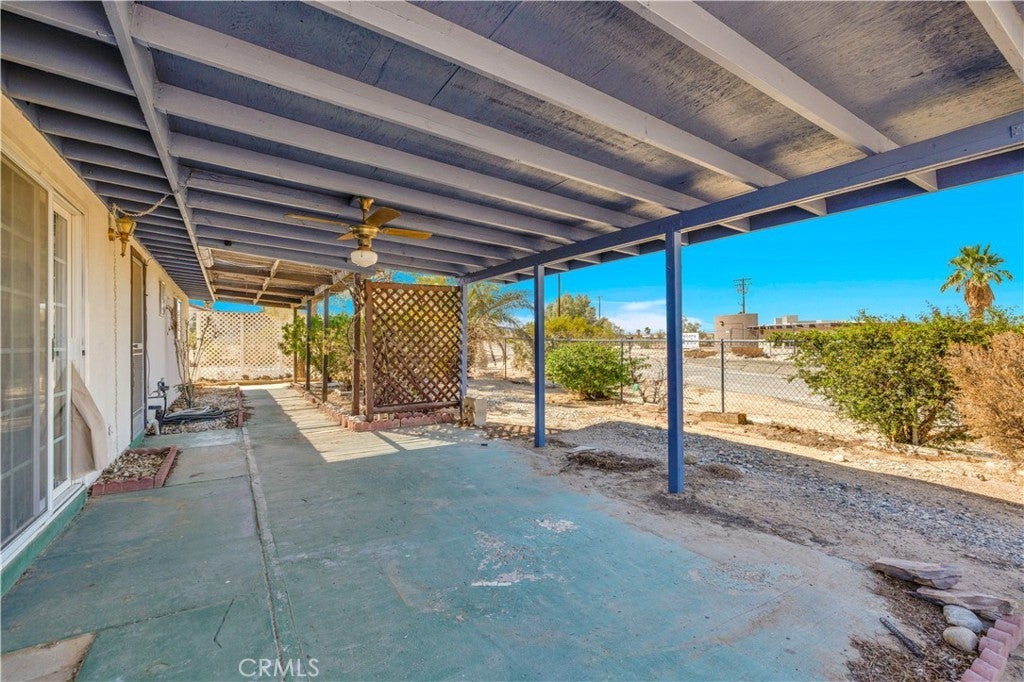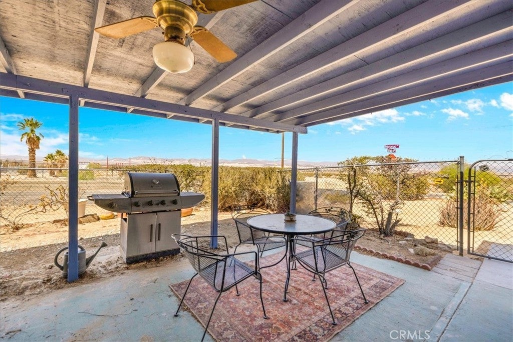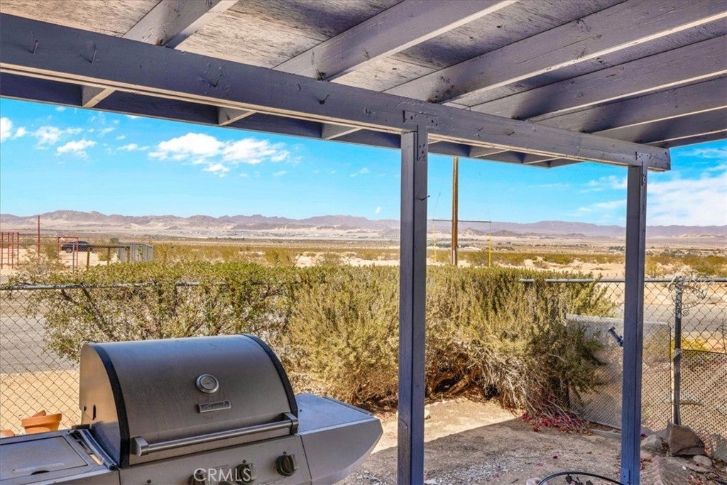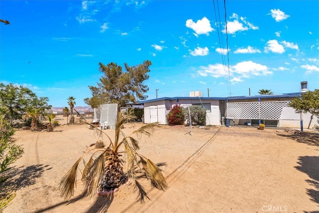 Looking for a lovely desert home or investment property with beautiful forever views?! Look no further! This charming 3 bedroom 2 bath home features 1,470 sqft of living space and is perfectly situated on a Corner Lot in the quiet Chocolate Drop neighborhood of 29 Palms mere minutes from the Marine Corps base, Joshua Tree National Park north entrance, and downtown shopping and eateries. A gated entry opens to a lovely courtyard/breezeway with delightful desert landscaping that connects the detached 2 car garage to the house. The front door opens to a nicely sized living room that flows effortlessly into the formal dining room & kitchen space. The large east-facing windows let in an abundance of natural light & the open-concept layout makes it a great space for entertaining. The kitchen is complete with beautiful granite countertops & upgraded cabinetry, a matching center island and dining table, stainless steel appliances, and ample storage space. There is a convenient storage/laundry room just off the kitchen that could make for a sizable pantry! The primary bedroom follows suit with custom built-in drawers/cabinetry and features an ensuite bathroom. The home's 3rd bedroom could be used as a large family room/den & is warmed with a lovely pellet burning fireplace, has its own breezeway entrance, backyard patio access, a mini-split and an attached pass-through room with a closet & built in bookcase (which would make for a great office space)! Outside you'll be delighted to find a fully fenced yard with a spacious covered patio (the perfect spot your for your morning coffee or evening BBQ as you take in gorgeous desert and mountain views) and plenty of space to expand, entertain or relax around a firepit on a starry desert night. Come take a look and let this home's charming allure do the rest. Your new desert home awaits!