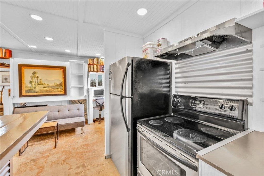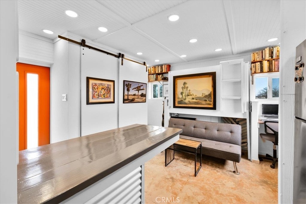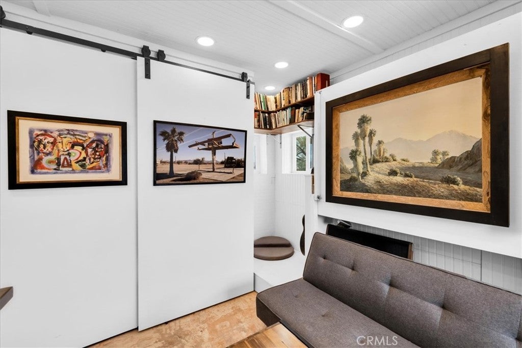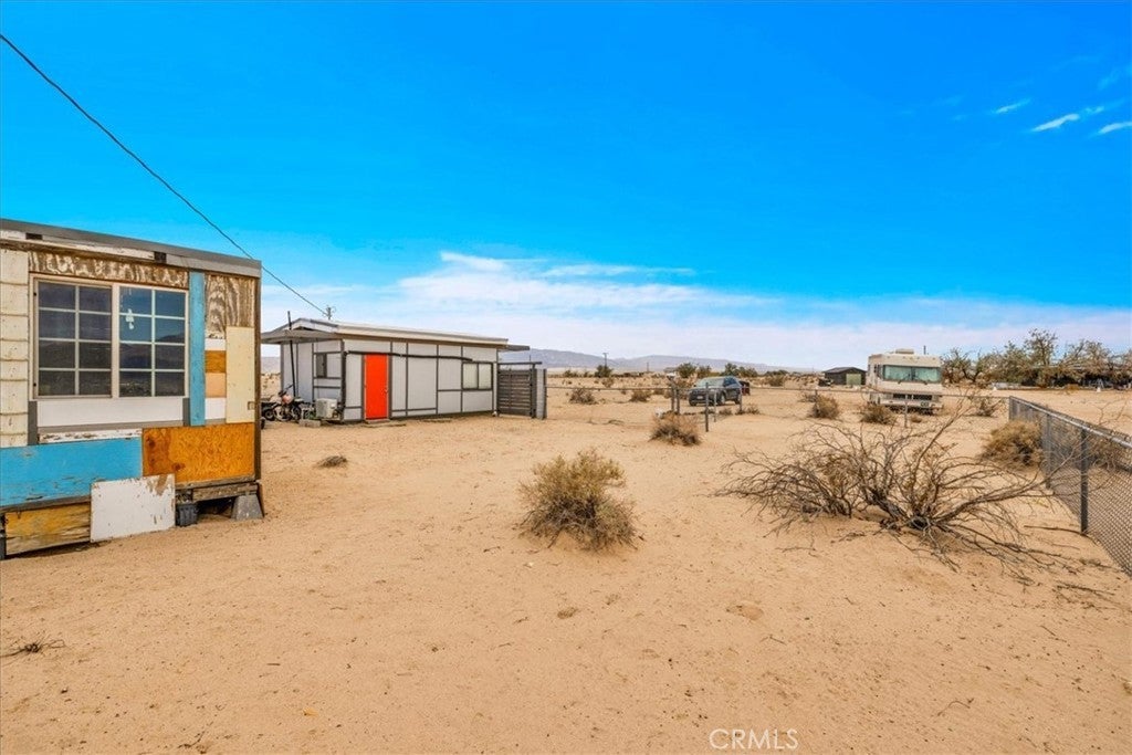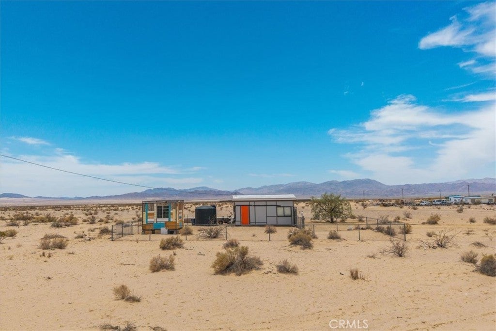 Nestled on a private 5-acre lot in sought-after Wonder Valley, this fully renovated recreational cabin is the perfect blend of smart design and modern convenience. Every detail has been thoughtfully upgraded, making the most of the 280-square-foot footprint to deliver a completely livable, turn-key space. The cabin features a full stainless steel kitchen with an electric stove, refrigerator, and a sleek, integrated design. A built-in elevated Murphy bed maximizes floor space, while a custom built-in entertainment center adds both function and style. Comfort is ensured year-round with dual mini split systems for efficient heating and cooling, recessed LED lighting on dimmers, and dual-paned windows throughout. Utilities are fully set up: connected electricity, a 2,500-gallon hauled water tank, and a solar panel water heater that supports both the water heater and washing machine. Outside, the fully fenced backyard features a creatively built shed made with recycled colored wood—perfect for storage or workspace. The property is set back from the road, offering a sense of privacy while still being conveniently located just past The Palms Restaurant and minutes from Joshua Tree National Park. This is a rare opportunity to own a fully functional and modern micro-home on a spacious desert lot—perfect for anyone seeking simplicity, self-sufficiency, and smart design. A true one-stop shop.