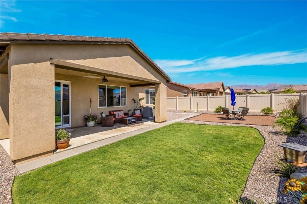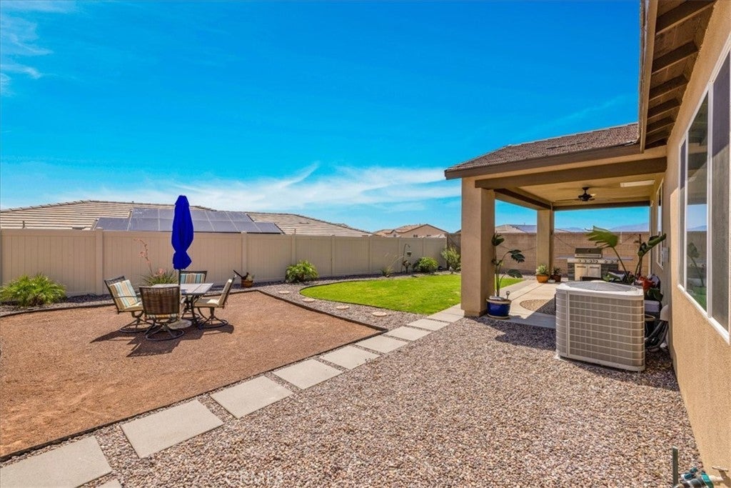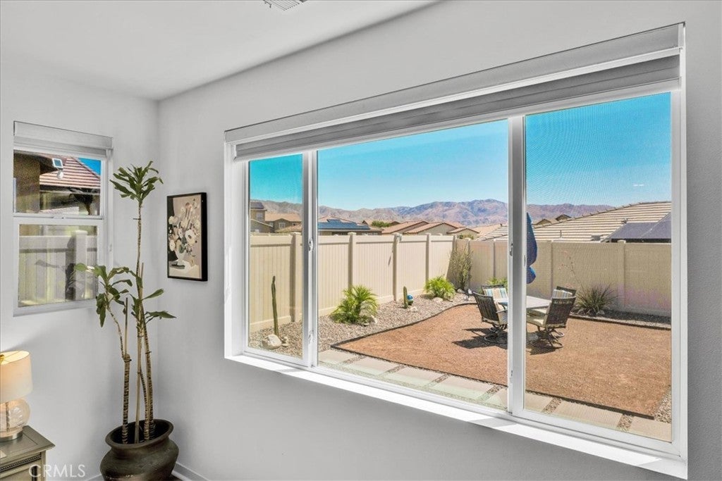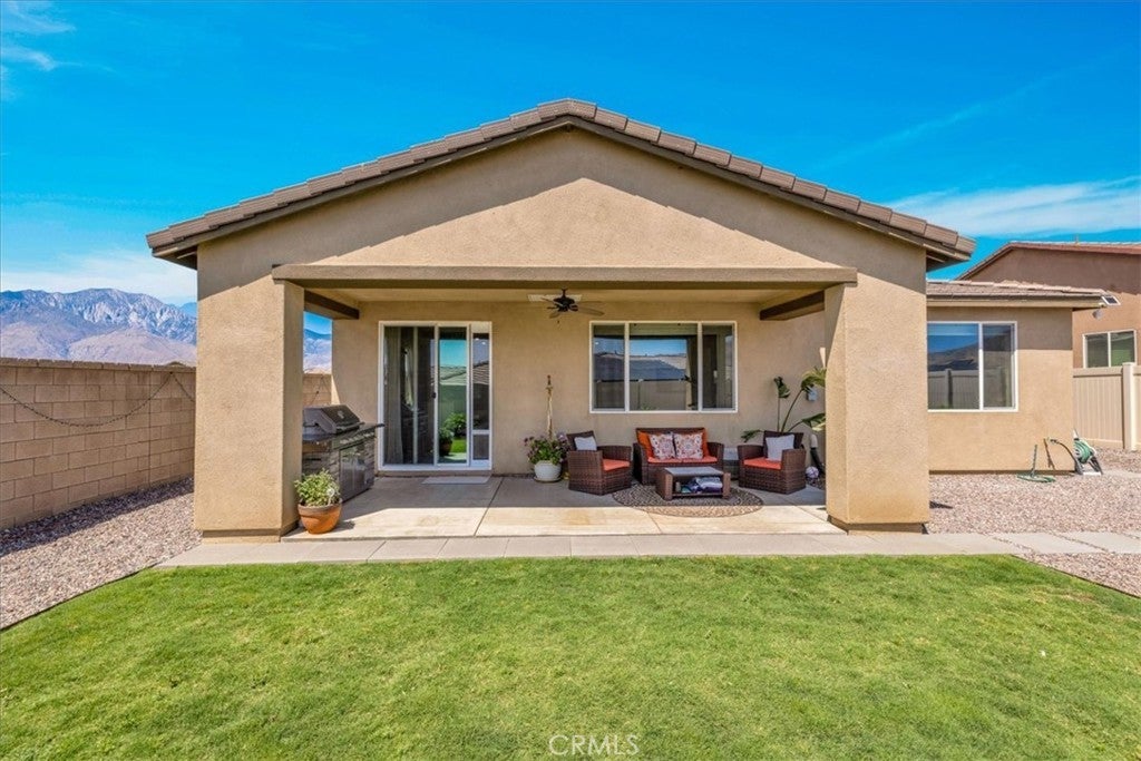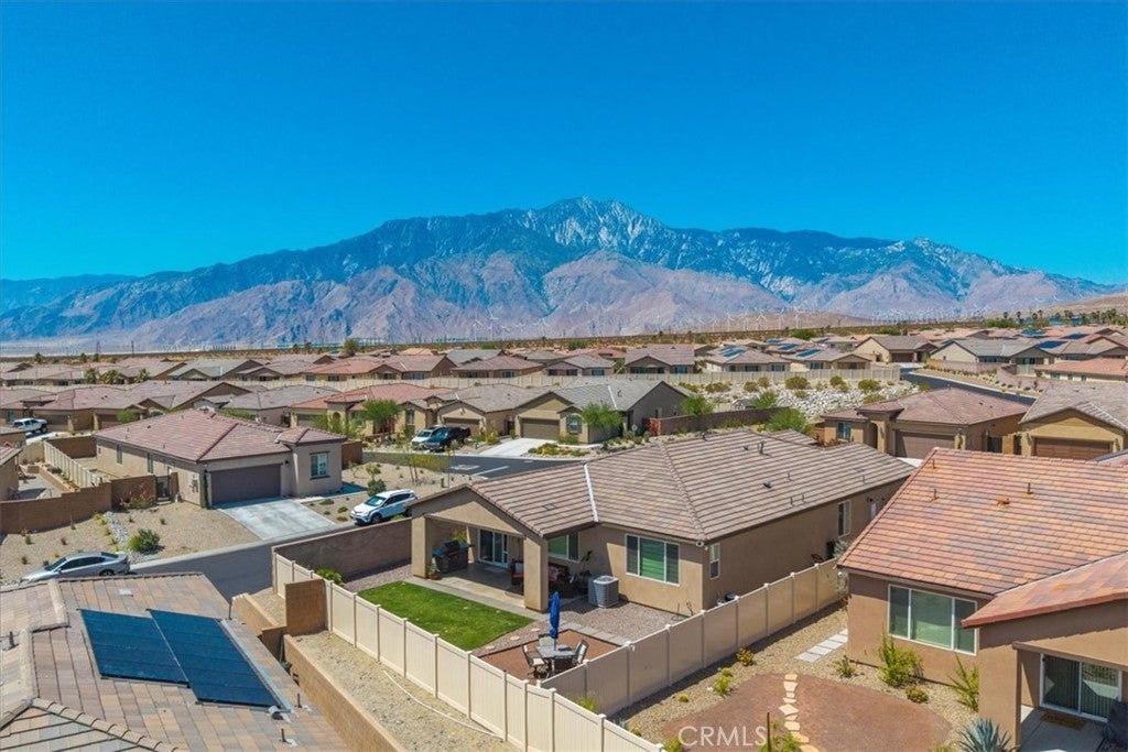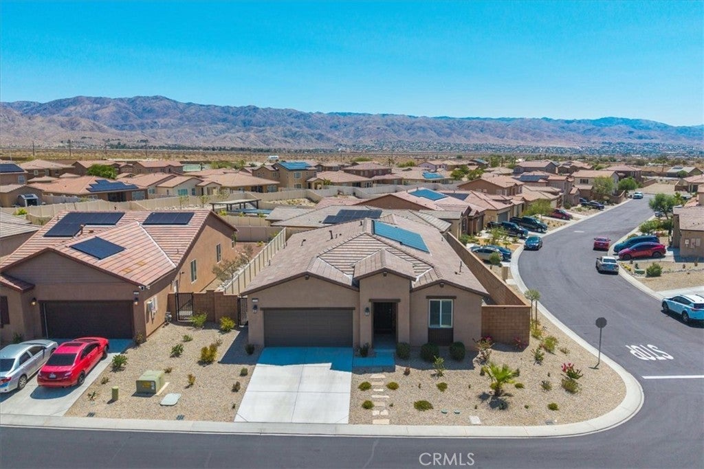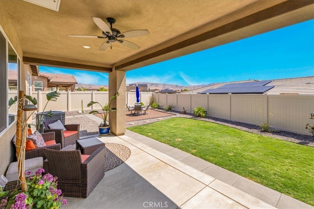 Step into modern elegance with this stunning 2,088 sq ft Lennar-built home, perfectly situated on a spacious corner lot in one of Desert Hot Springs' most desirable communities. Featuring 4 oversized bedrooms and 2 beautifully designed bathrooms, every inch of this home showcases true luxury—from the custom cabinetry to the pristine flooring throughout. Upon entry, you're welcomed by an open-concept layout that flows effortlessly from the bright foyer into the heart of the home. The chef’s kitchen boasts a large center island ideal for morning coffee and conversation, seamlessly connecting to the expansive living room adorned with recessed lighting and ceiling fans. The primary suite is a private retreat, complete with a generous walk-in closet and spa-like bathroom offering dual sinks, a soaking tub, and a separate walk-in shower. Designed with energy efficiency in mind, the home comes fully equipped with solar panels at just $150/month and central A/C for year-round comfort. Step outside into a thoughtfully landscaped backyard oasis featuring lush grass, privacy fencing, and a covered patio with a ceiling fan—perfect for relaxing or entertaining under the desert sky. With an HOA fee of only $153/month and just a 10-minute drive to Palm Springs, this home offers the perfect balance of serenity and convenience with access to both the Low and High Deserts. Don’t miss your chance to own this move-in ready desert dream.