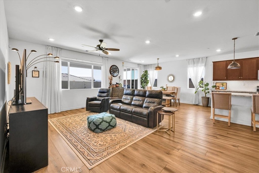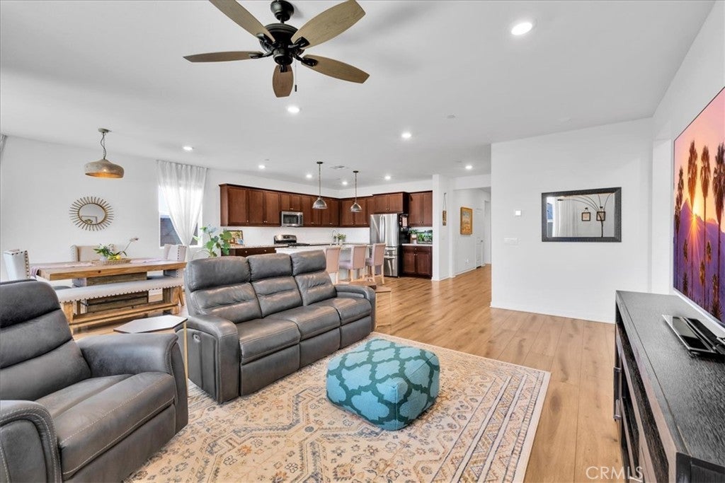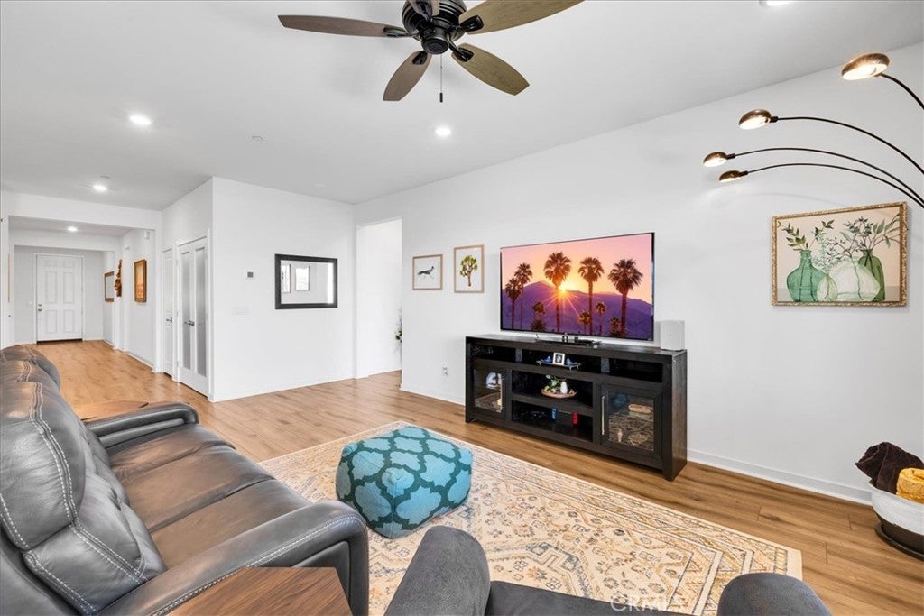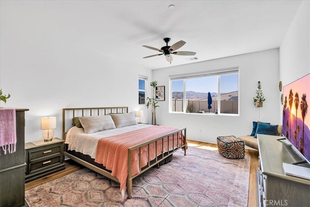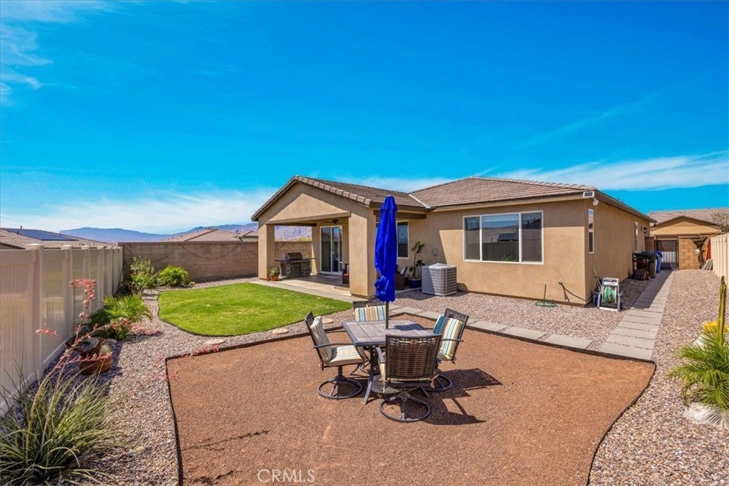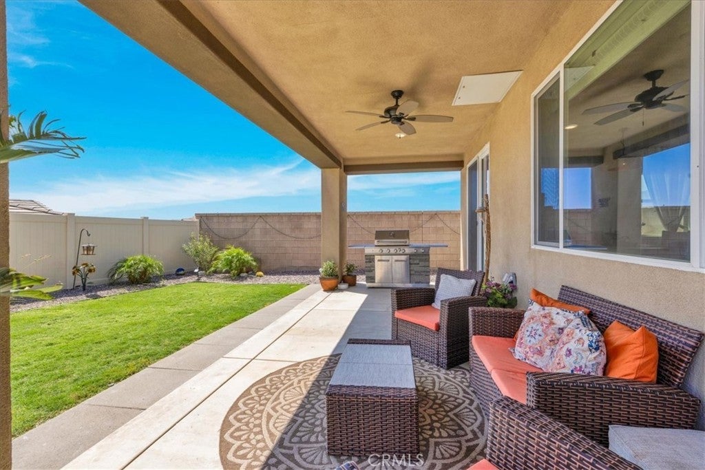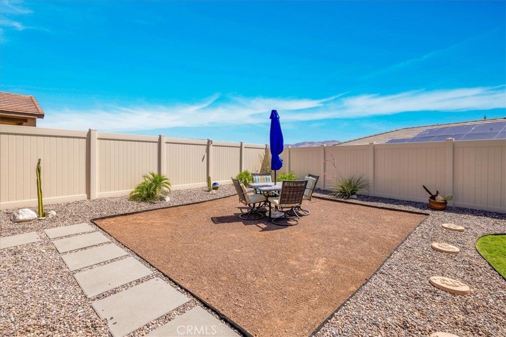 Step into modern elegance with this stunning 2,088 sq ft Lennar-built home, perfectly situated on a spacious corner lot in one of Desert Hot Springs' most desirable communities. Featuring 4 oversized bedrooms and 2 beautifully designed bathrooms, every inch of this home showcases true luxury—from the custom cabinetry to the pristine flooring throughout. Upon entry, you're welcomed by an open-concept layout that flows effortlessly from the bright foyer into the heart of the home. The chef’s kitchen boasts a large center island ideal for morning coffee and conversation, seamlessly connecting to the expansive living room adorned with recessed lighting and ceiling fans. The primary suite is a private retreat, complete with a generous walk-in closet and spa-like bathroom offering dual sinks, a soaking tub, and a separate walk-in shower. Designed with energy efficiency in mind, the home comes fully equipped with solar panels at just $150/month and central A/C for year-round comfort. Step outside into a thoughtfully landscaped backyard oasis featuring lush grass, privacy fencing, and a covered patio with a ceiling fan—perfect for relaxing or entertaining under the desert sky. With an HOA fee of only $153/month and just a 10-minute drive to Palm Springs, this home offers the perfect balance of serenity and convenience with access to both the Low and High Deserts. Don’t miss your chance to own this move-in ready desert dream.