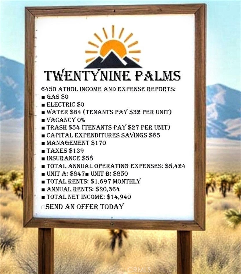 Priced to sell investment opportunity that awaits a savvy investor. Classic duplex with consistent occupancy located in 29 Palms. Great potential for the person that is looking for the right price and conditions on an income producing property. This duplex is a gem that has even more of an upside potential for future rents. Each unit consists of a one bedroom, one bathroom home that boasts great use of space and storage, wall unit AC's and radiant wall heaters. Each one has it's own water meter and gas meter as well as each having their own mailing address. Both units share a water meter. The front unit features beautiful exposed beam ceilings and the back unit has it's own private back yard. Conveniently located next to schools and downtown 29 Palms which is really getting a lot of attention for recent improvements like some new chic restaurants, Freedom Plaza with it's weekly farmers and art market and special events and concerts. The homes are also less than two miles from Luckie Park community park and community pool with baseball, football, skate park, basketball courts, playgrounds and more. They are less than five miles away from the main entrance to Joshua Tree National Park. Less than 6 miles from the 29 Palms Marine base. It is a great jump off point to all that the high desert has to offer. The seller willing to provide concessions for escrow closing costs. 2% credit for investor and 5% credit for owner-occupant at close of escrow. Live in one and rent out the other or rent out both. Come take a look and make this great property yours to own. Seller also has a second duplex for sale on Desert Queen in 29 Palms.