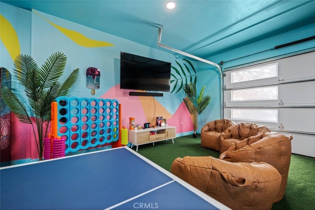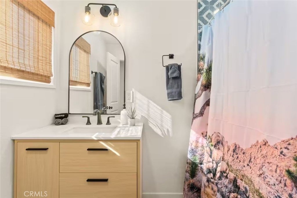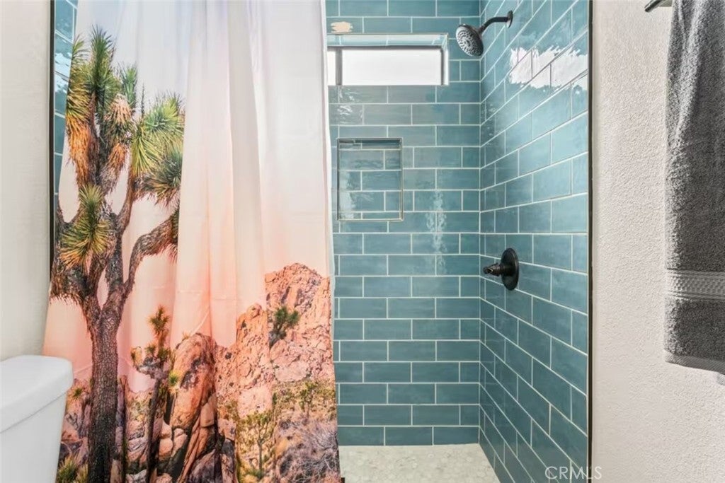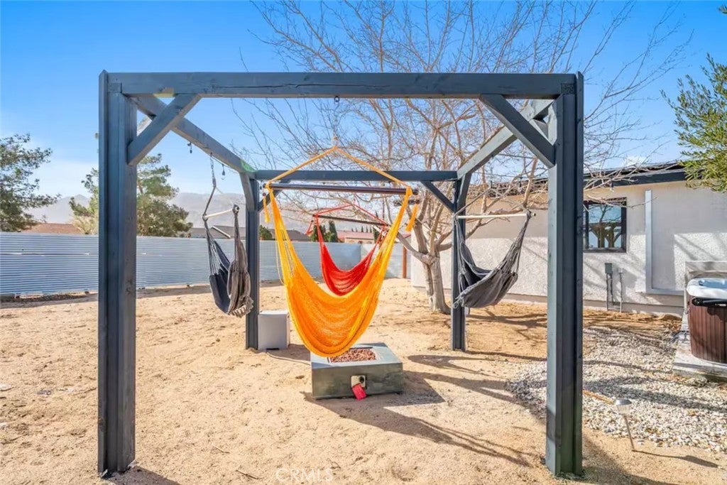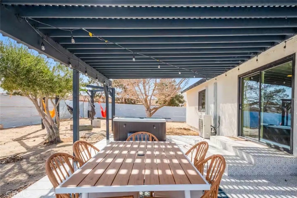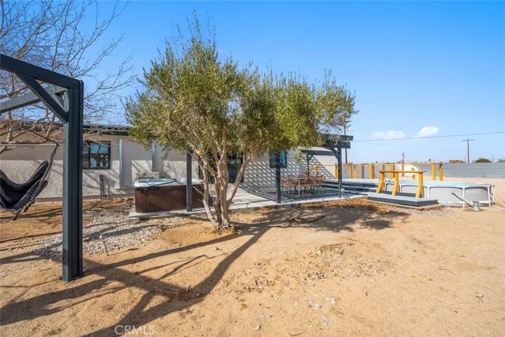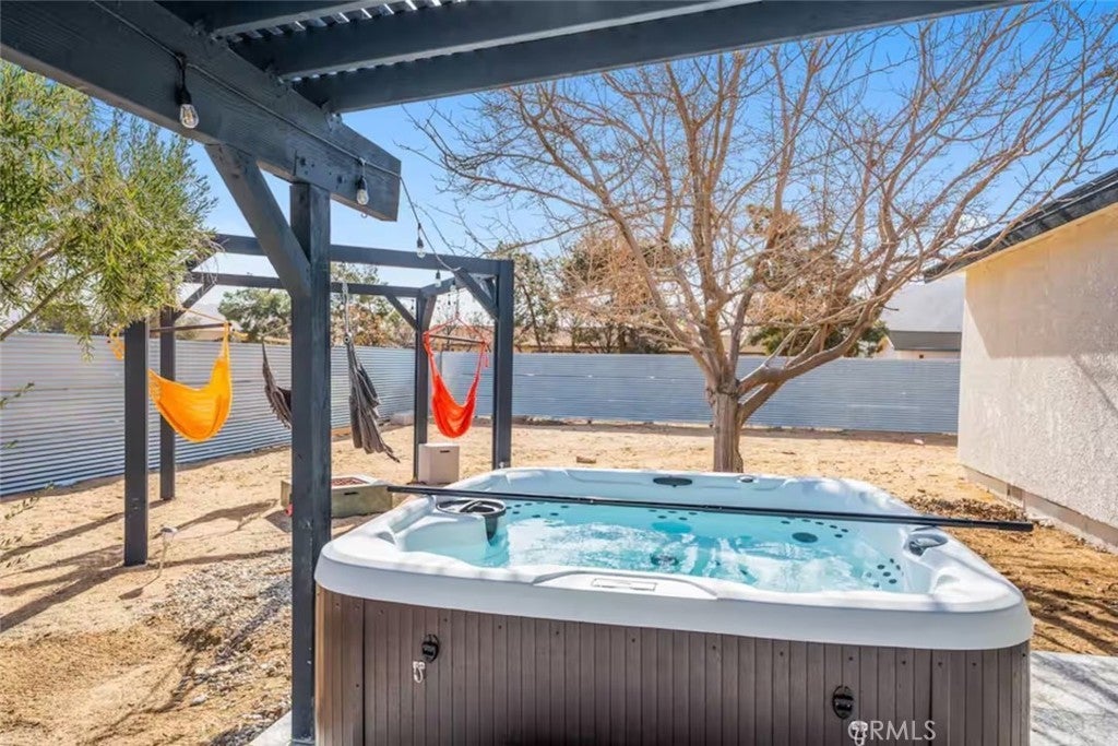 OASIS HOUSE: Meticulously Remodeled & Updated home, including new kitchen cabinetry, quartz countertops, counter-to-ceiling tile backsplash and ALL new appliances. Engineered flooring throughout. Exposed beam in living area, provides the perfect organic aesthetic touch. Both bathrooms are also fully upgrades, with new vanities and floor-to-ceiling custom tile work in the luxurious walk-in showers. The beautifully finished bedrooms feature sublime design details. The garage has been transformed into the ultimate lounge. Entire house is updated with zoned ductless mini-split AC/Heating units for efficiency. Utility room features new washer and dryer. The fully-fenced, private backyard is perfect for children, pets, family and friends and features a cowboy pool, hot tub, fire pit + pergola w/ hanging hammock chairs for socializing and stargazing. Picturing yourself relaxing underneath the palm trees. The legendary 29 Palms Inn is only a short distance away for fine dining and only a short drive to the main entrance of Joshua Tree National Park for hiking and outdoor activities.