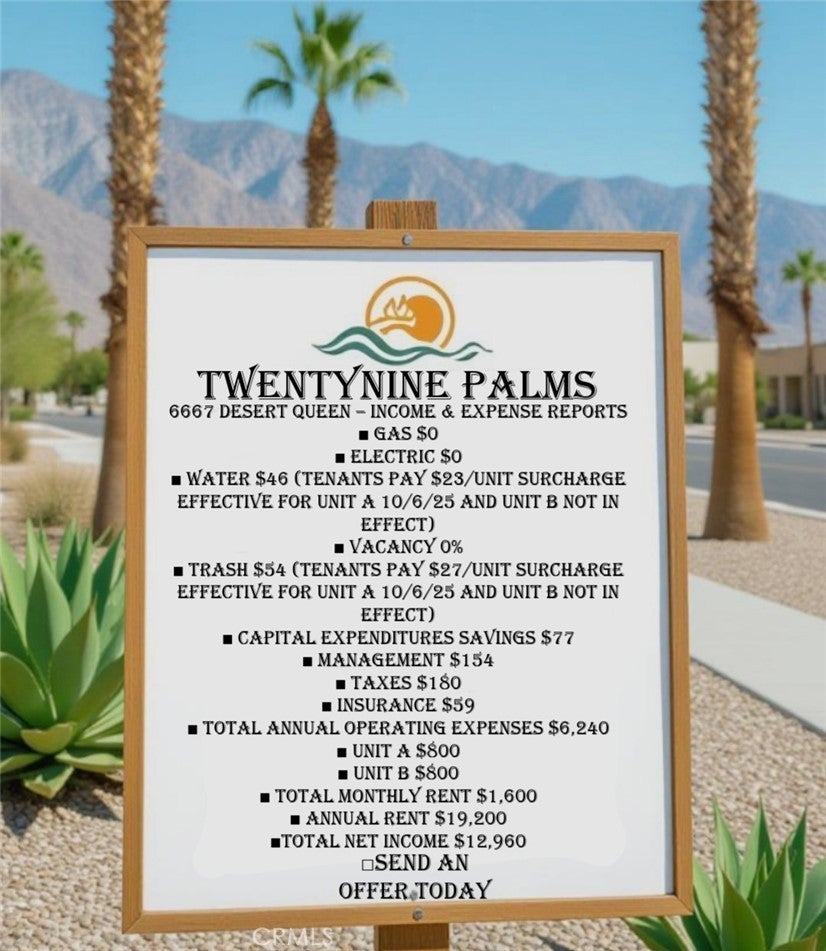 Priced to sell investment opportunity that awaits a savvy investor. Contemporary duplex with consistent occupancy located in 29 Palms. Great potential for the person that is looking for the right price and conditions on an income producing property. This duplex is a gem that has even more of an upside potential for future rents. Unit A consists of a two bedroom, one bathroom home that boasts great use of space and storage, swamp cooler and radiant wall heater. Unit B is a one bedroom, one bathroom home also with great storage, wall mounted AC units and a radiant wall heater. Each one has it's own water meter and gas meter as well as each having their own mailing address. The units share a water meter. Both feature beautiful exposed beam ceilings. Conveniently located next to schools and downtown 29 Palms which is really getting a lot of attention for recent improvements like some new chic restaurants, Freedom Plaza with it's weekly farmers and art market and special events and concerts. The homes are also less than two miles from Luckie Park community park and community pool with baseball, football, skate park, basketball courts, playgrounds and more. They are only five miles away from the main entrance to Joshua Tree National Park. Six miles from the 29 Palms Marine base. It is a great jump off point to all that the area and beyond has to offer. The seller willing to provide concessions for escrow closing costs. 2% credit for investor and 5% credit for owner-occupant at close of escrow. Live in one and rent out the other or rent out both. Come take a look and make this great property yours to own. Seller also has a second duplex for sale on Athol Ave. in 29 Palms.