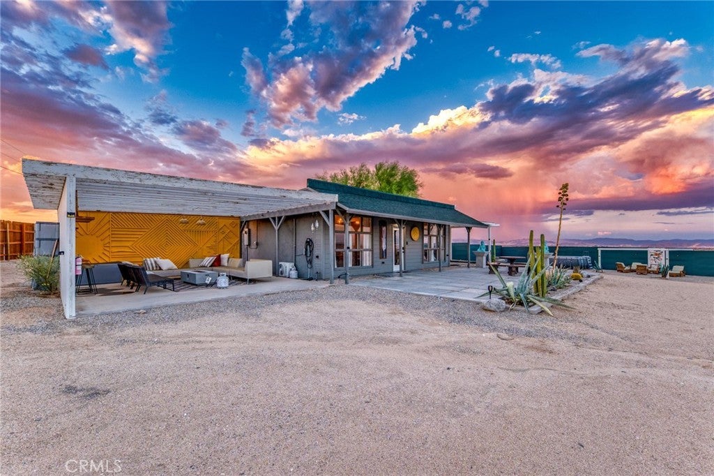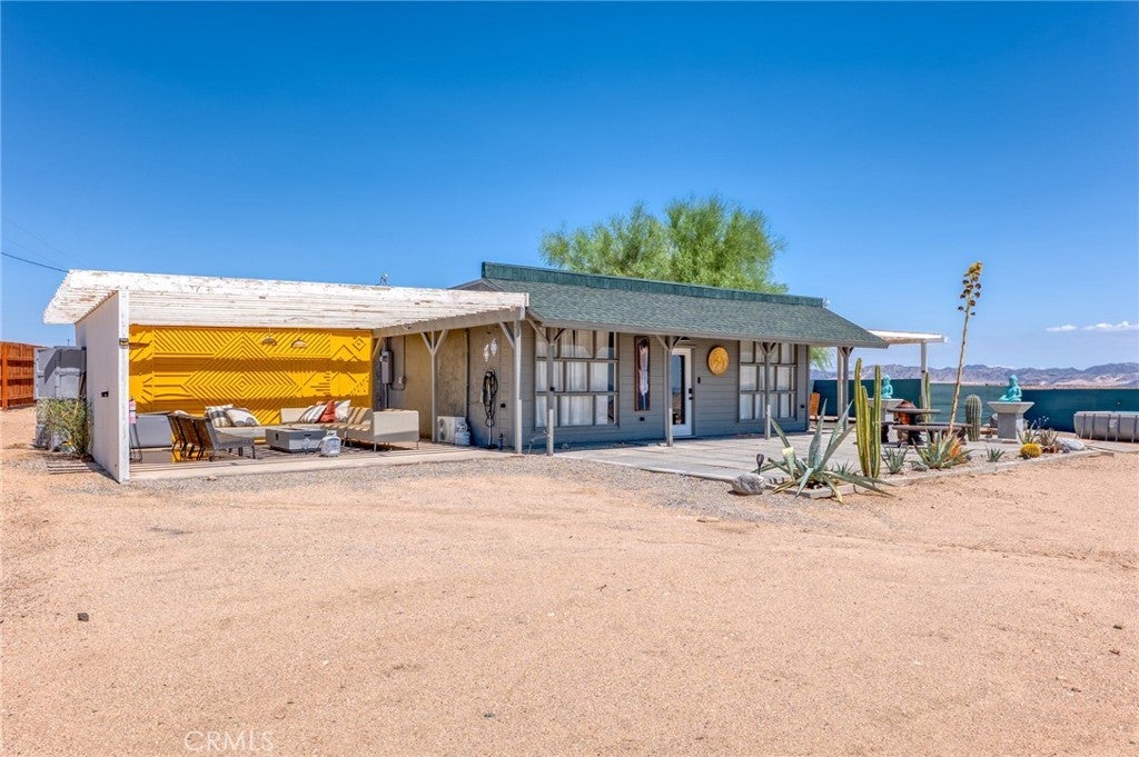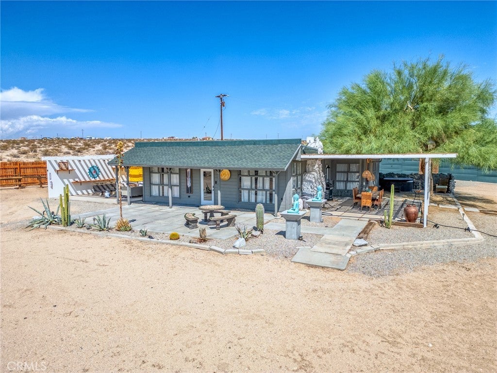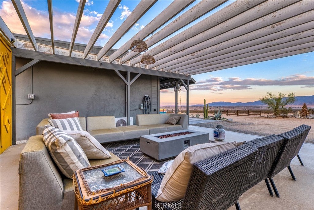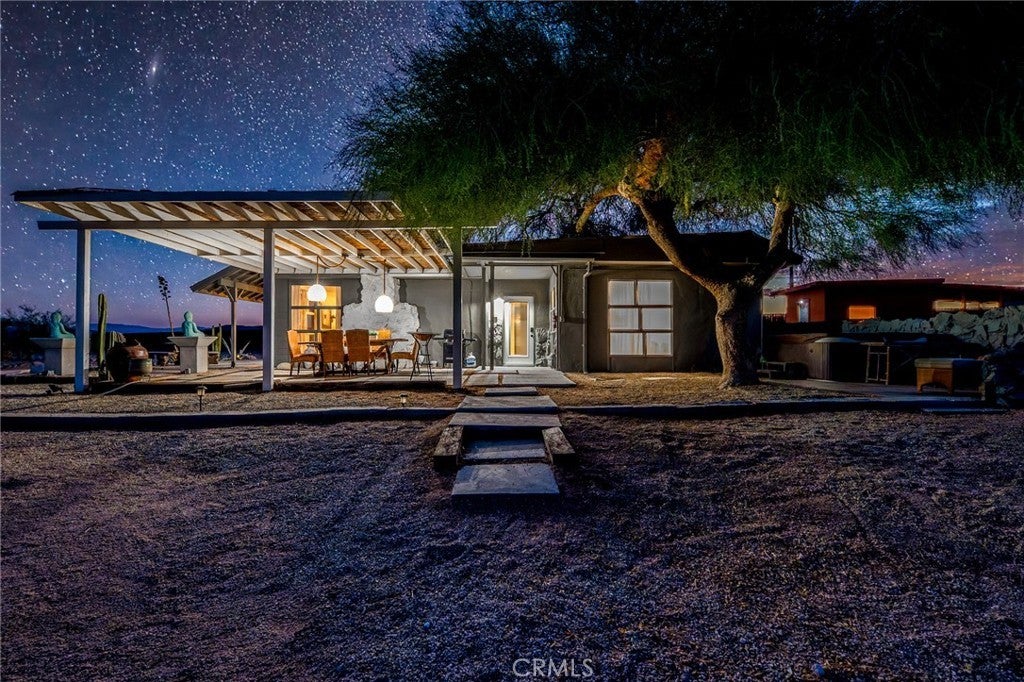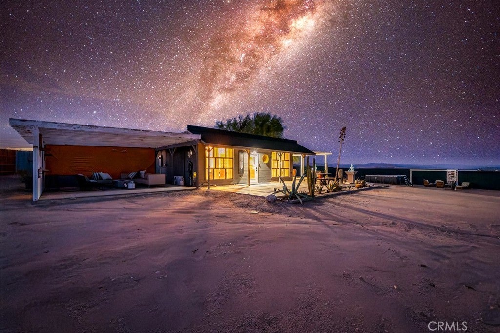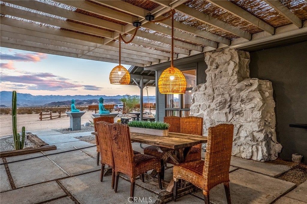 Welcome to this stylish 3-bedroom, 1-bath mid-century desert compound with 1,418 sq ft of living space and sweeping views of the Joshua Tree National Park hills. This property is fully dialed in and ready to enjoy, offering strong appeal as both a private desert getaway and an investment opportunity. The main home features an open floor plan with light-filled living spaces, two spacious bedrooms, plus a versatile third room ideal as a den, office, or extra sleeping quarters. Interiors include modern flooring, updated fixtures, a sleek kitchen, efficient mini-split systems, and a spacious walk-in shower. A detached guest studio with its own A/C and private outdoor hot/cold shower expands the possibilities, whether for hosting additional guests, creating a wellness or art space, or boosting rental income potential. The grounds are designed for relaxation and entertaining, with multiple shaded lounge areas, a fire pit, and mature desert landscaping. With no immediate neighbors and government land nearby, the views and sense of privacy are preserved—an increasingly rare find in the high desert. Located just 10 minutes from Joshua Tree National Park’s Indian Cove entrance and 15 minutes from both downtown Joshua Tree and 29 Palms, this retreat sits in the heart of one of Southern California’s fastest-growing travel destinations. The area continues to draw year-round tourism, outdoor enthusiasts, and those seeking unique vacation rentals, making Joshua Tree Sunset Highway an excellent investment with proven demand.
