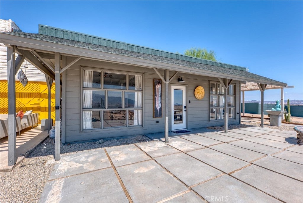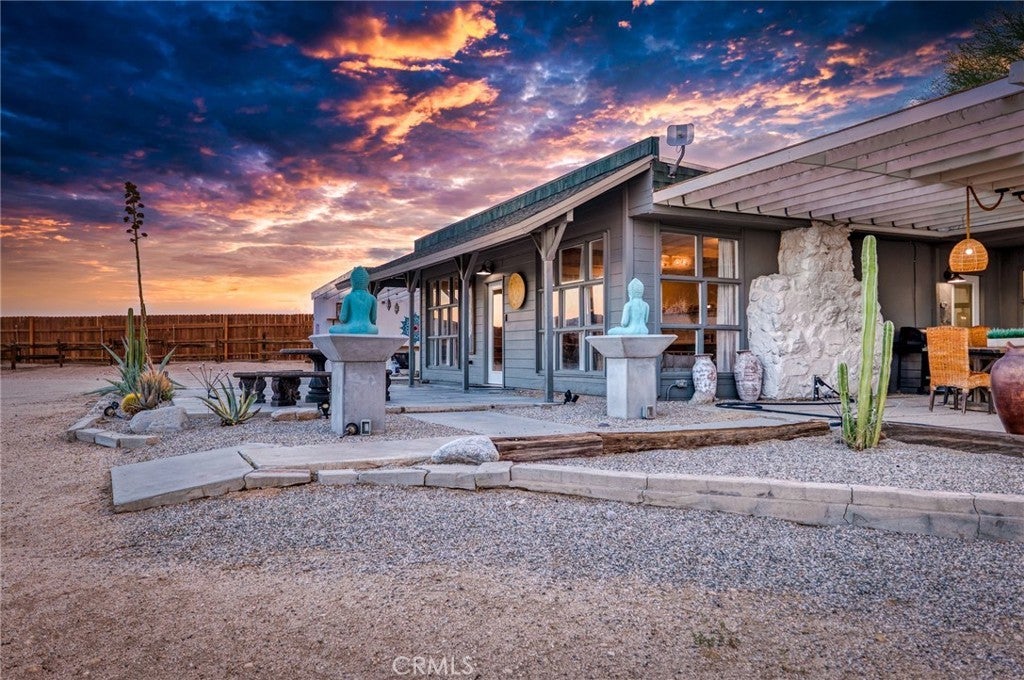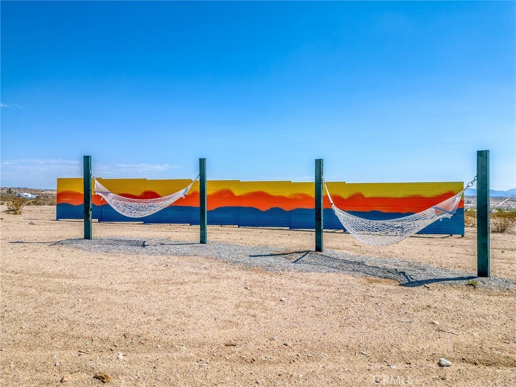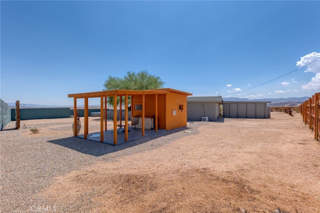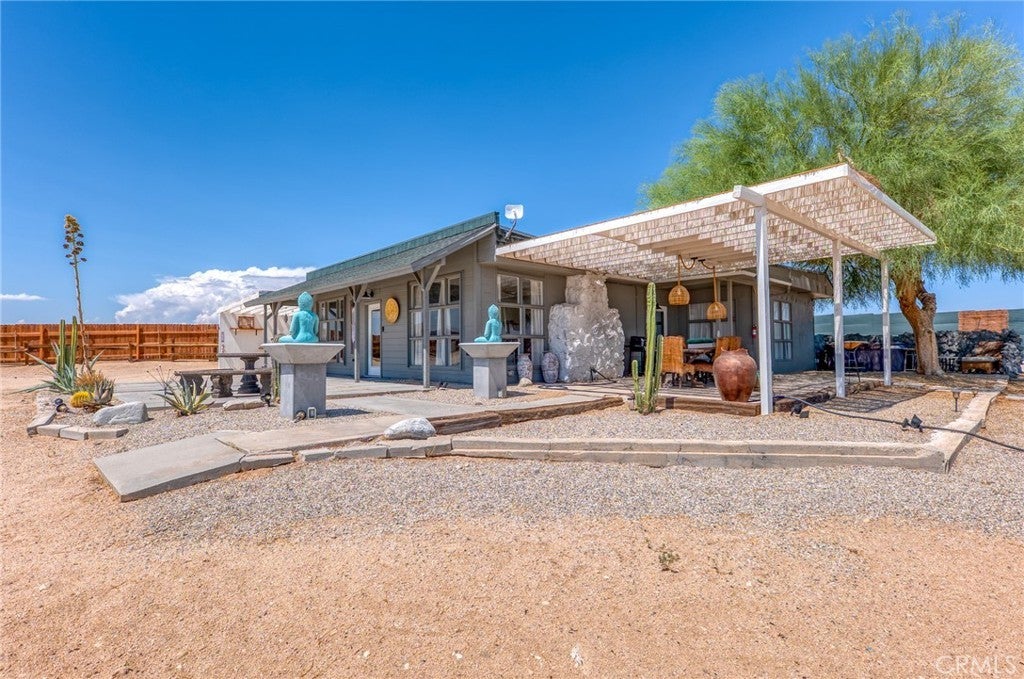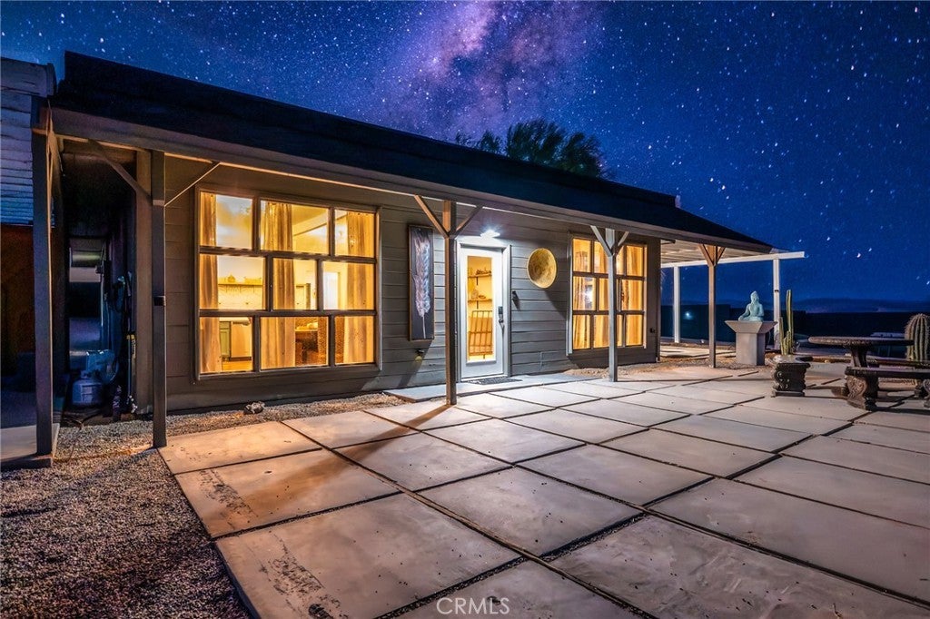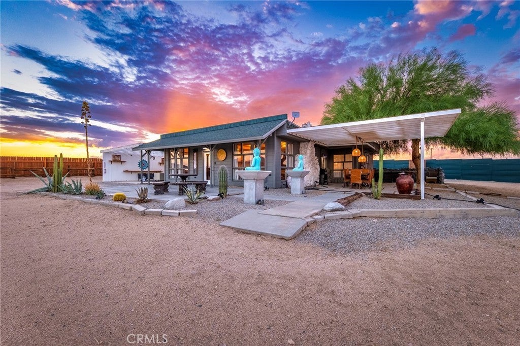 Welcome to this stylish 3-bedroom, 1-bath mid-century desert compound with 1,418 sq ft of living space and sweeping views of the Joshua Tree National Park hills. This property is fully dialed in and ready to enjoy, offering strong appeal as both a private desert getaway and an investment opportunity. The main home features an open floor plan with light-filled living spaces, two spacious bedrooms, plus a versatile third room ideal as a den, office, or extra sleeping quarters. Interiors include modern flooring, updated fixtures, a sleek kitchen, efficient mini-split systems, and a spacious walk-in shower. A detached guest studio with its own A/C and private outdoor hot/cold shower expands the possibilities, whether for hosting additional guests, creating a wellness or art space, or boosting rental income potential. The grounds are designed for relaxation and entertaining, with multiple shaded lounge areas, a fire pit, and mature desert landscaping. With no immediate neighbors and government land nearby, the views and sense of privacy are preserved—an increasingly rare find in the high desert. Located just 10 minutes from Joshua Tree National Park’s Indian Cove entrance and 15 minutes from both downtown Joshua Tree and 29 Palms, this retreat sits in the heart of one of Southern California’s fastest-growing travel destinations. The area continues to draw year-round tourism, outdoor enthusiasts, and those seeking unique vacation rentals, making Joshua Tree Sunset Highway an excellent investment with proven demand.
