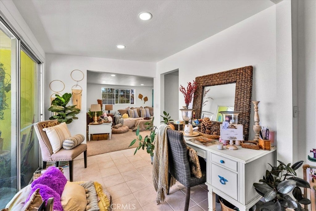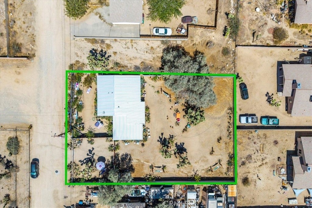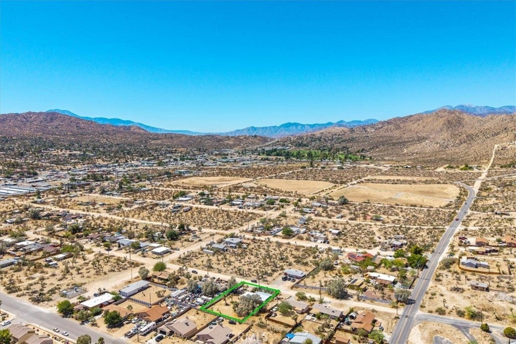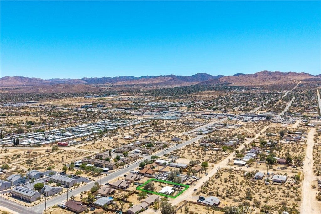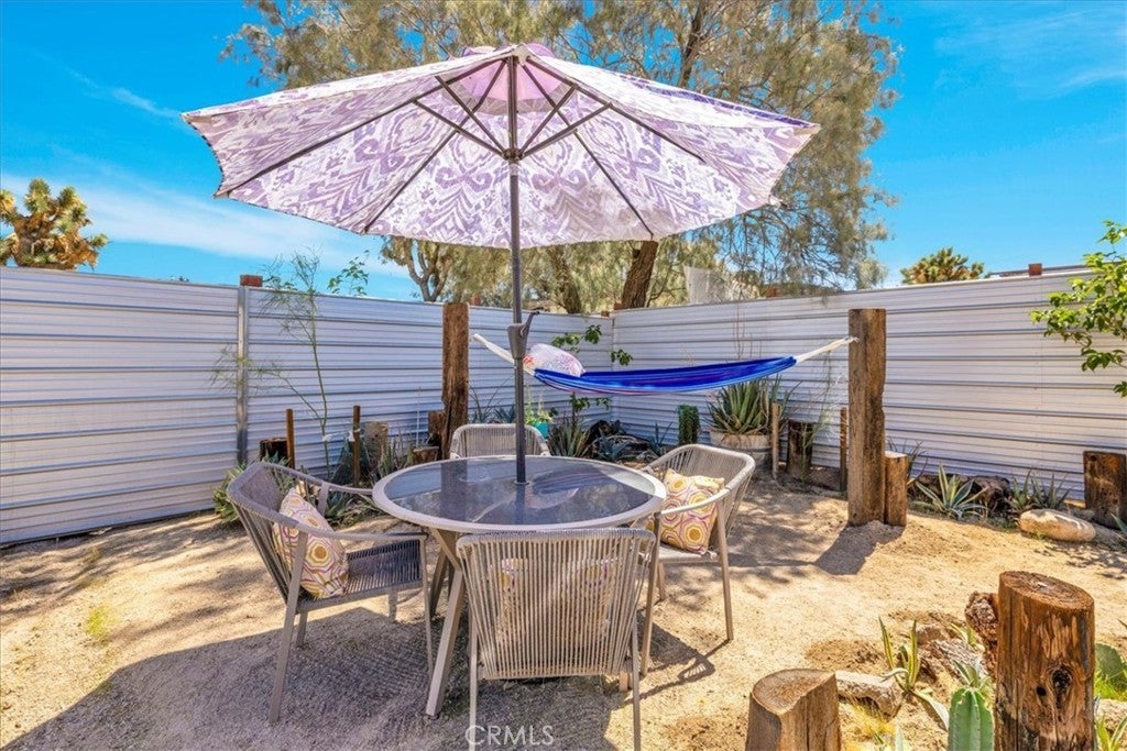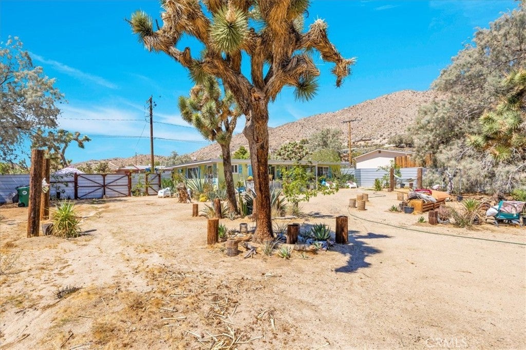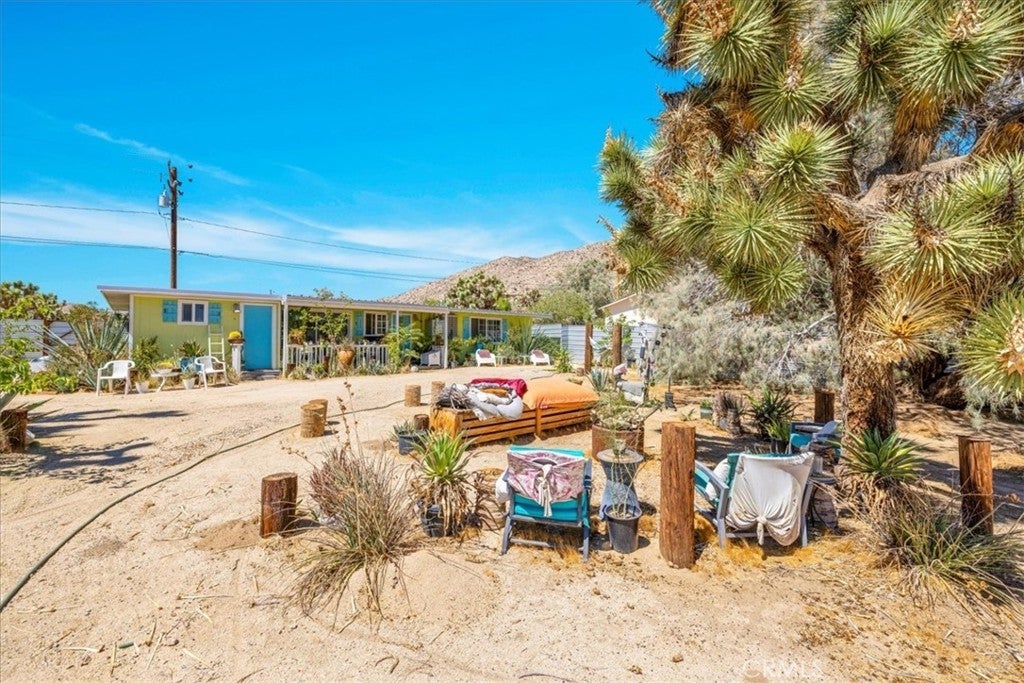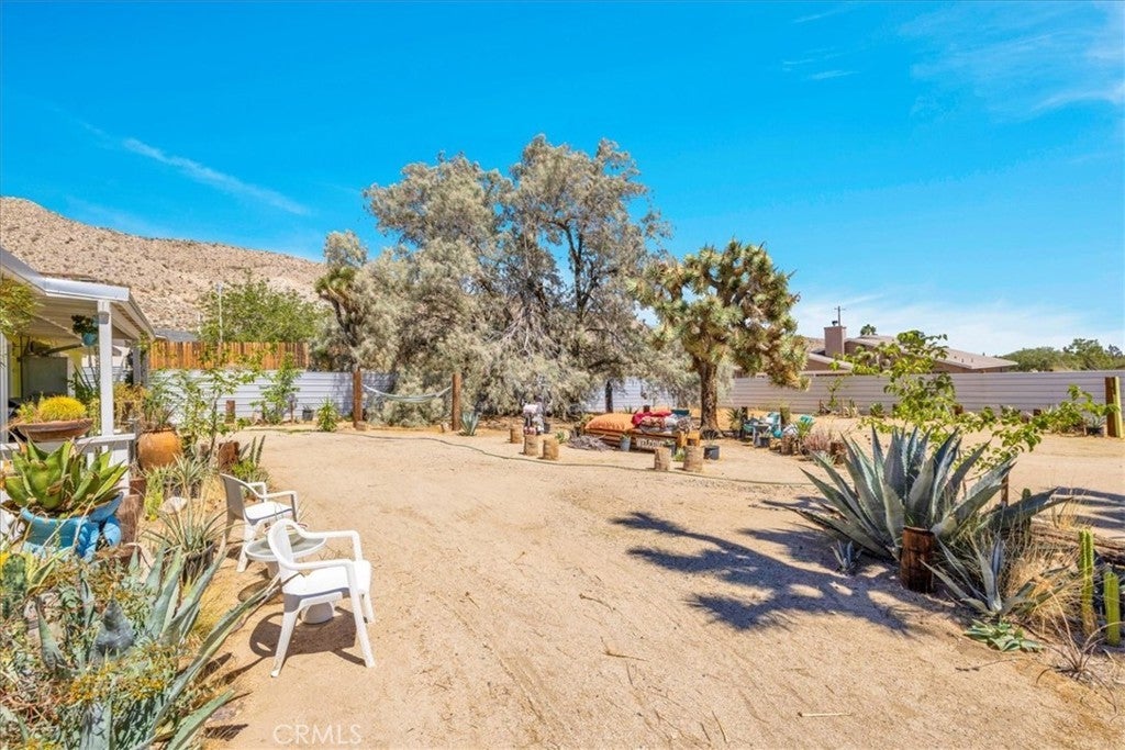This charming 2 bedroom, 1 bath home on 1/3 acre in north downtown Yucca Valley combines comfort, style, and privacy with a convenient location. Beautiful landscaping and mountain views welcome you, along with a secure outdoor parking area and privacy fencing in both the front and backyard. Covered patios at the front and back of the home provide inviting spaces to relax outdoors in your own private oasis. Inside, the living room is spacious with high beamed ceilings, tile flooring throughout, and new windows that fill the space with light. The kitchen is nicely appointed and features an informal dining area with sliding glass doors to the backyard, plus a separate formal dining room for added flexibility. The bathroom is generously sized and includes a tub/shower combo. The first bedroom offers built-in storage and plenty of space, while the second bedroom is oversized with abundant natural light and large closet. A sizable bonus room provides even more versatility for work, hobbies, or guest use. Furniture is included, making this property move-in ready. With its thoughtful updates, spacious design, and excellent outdoor living features, this home is a wonderful opportunity in a desirable Yucca Valley neighborhood.