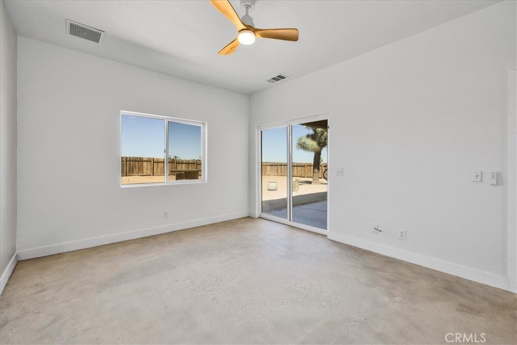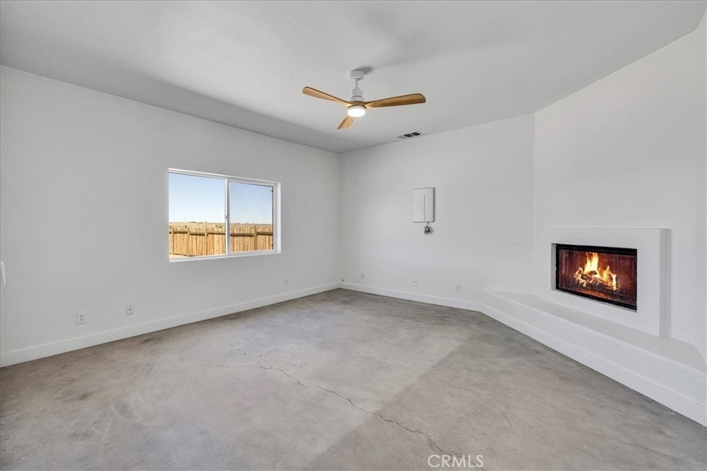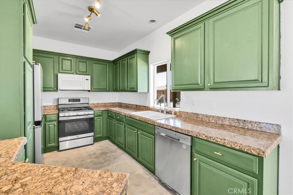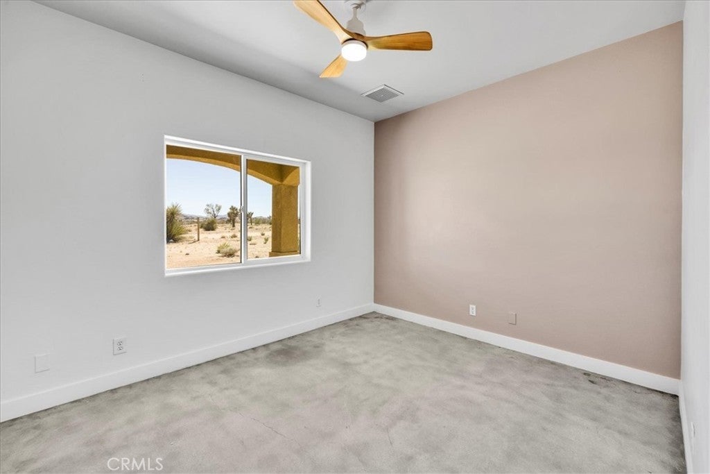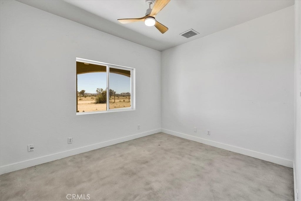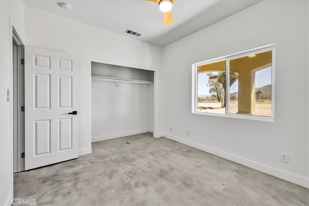 Welcome to your beautiful ranch-style home in peaceful North Joshua Tree! Sitting on 2.5 acres with dormer windows, arches, and sweeping panoramic desert and mountain views, this 3 bedroom, 2 bathroom home offers both charm and modern comfort with no visual power lines to impede the views .Step inside to find high ceilings and a cozy fireplace in the main living area, which flows seamlessly into the dining room and kitchen. The kitchen is a highlight with granite tile countertops, freshly painted cabinets, stainless steel appliances, breakfast bar, and a picture-perfect window view above the sink. Sliding glass doors off the dining area lead to a large covered patio—perfect for entertaining or enjoying tranquil desert nights. The spacious bedrooms are bright and airy, each with concrete floors and ceiling fans. The primary suite includes a large walk-in closet, slider access to the back patio, and a private bath with a walk-in shower and matching granite finishes. The guest bath features a tub/shower combo and granite vanity. Additional features include:Fully fenced property with a wooden privacy-fenced backyard area. Underground utilities (no obstructed views!) 2-car finished garage with high ceilings and laundry hookups. Concrete driveway and charming covered front patio Room for a pool, workshop, or ADU etc. All parcels in this sought-after area are on acreage, ensuring space and privacy. Just 10 minutes to Joshua Tree Village and less than 20 minutes to the National Park, the location balances serenity with convenience.Inclusions: Washer, Dryer, Refrigerator Imagine starry desert nights from your property with nearly no light pollution—peace and tranquility await. Don’t miss out on this opportunity—schedule your private showing today!Please include a recent pre-approval letter and proof of funds with your offer.Buyer to verify all MLS information, including but not limited to: permits and uses, bed/bath counts, square footage, school information and enrollment availability. Buyer is advised to independently investigate all aspects of the property, and to verify the accuracy of all information provided through personal inspections and with appropriate professionals to the buyer’s satisfaction.Buyer is solely responsible for verifying water, power, zoning, and county building requirements.Buyers are responsible for confirming the accuracy of all information and are encouraged to conduct their own due diligence or retain qualified professionals.