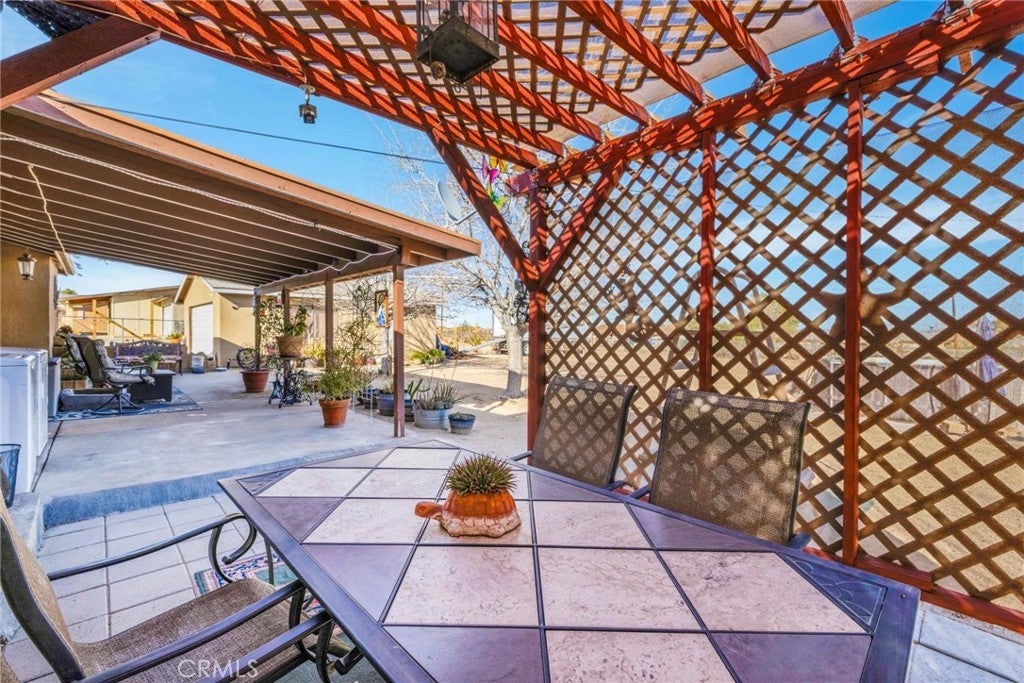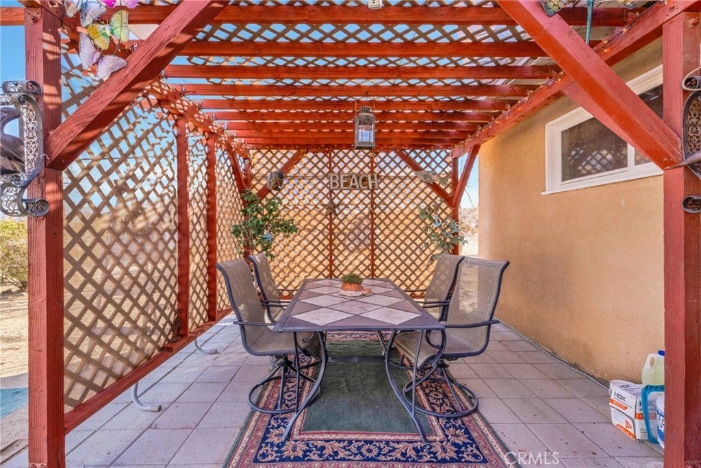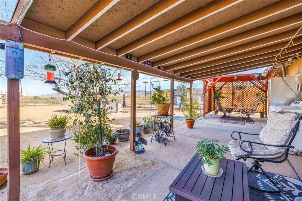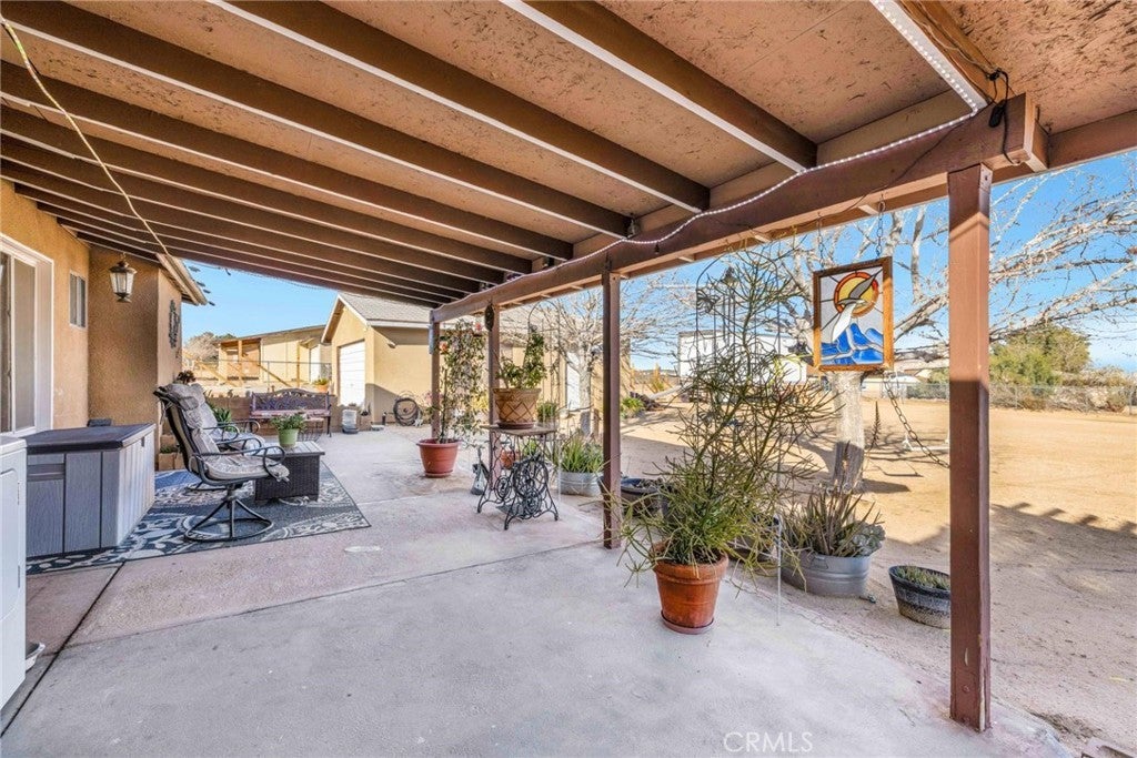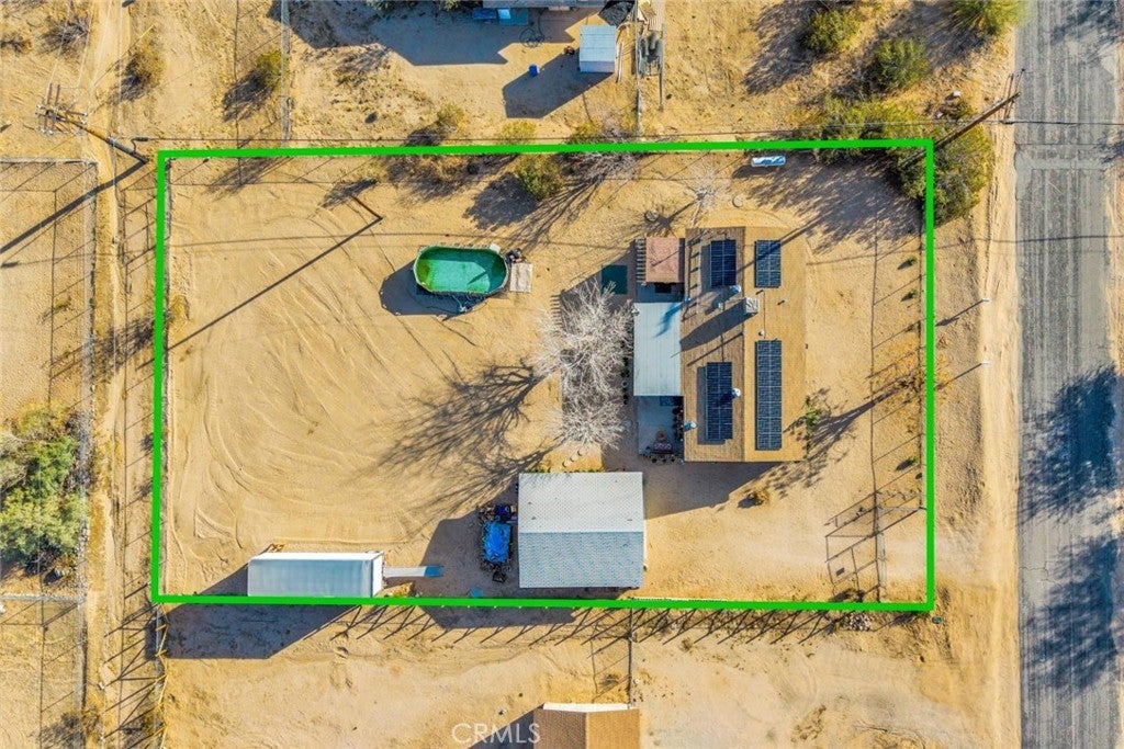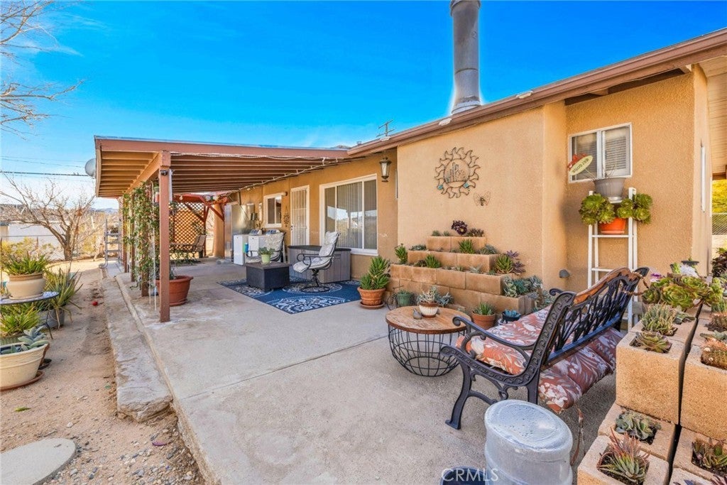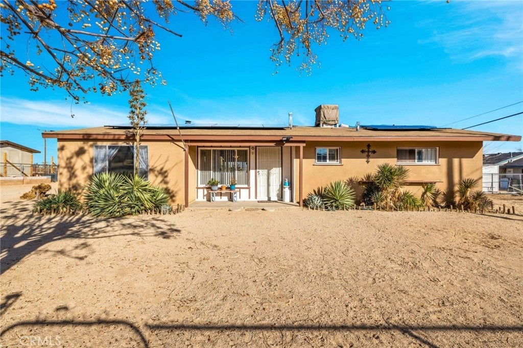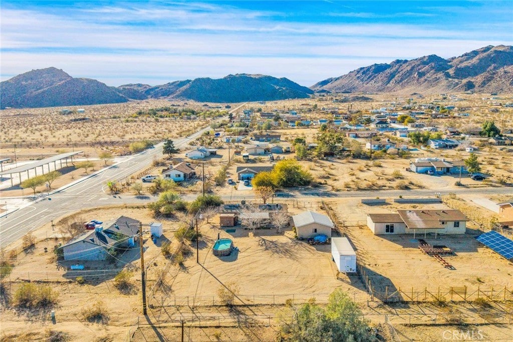 Charming and well kept home at an amazing price! Located in the scenic Hidden Rivers area of Joshua Tree. This is the one you've been waiting for! wonderful, 2 bedroom 1 bath home that offers comfort, space and stunning Desert views! Enjoy the inviting family room that features a beautiful stone fireplace with a wood burning insert for those cozy, chilly desert nights. You'll love all the large windows that fill the home with natural light. The adorable kitchen has plenty of cabinets and ample counter space. Step outside to the huge yard that is fenced all around both front and back; complete with an inviting covered patio, picnic area, and an above ground pool, great for relaxing and entertaining. The 572 sq. ft detached garage provides plenty of room for parking, storage or a workshop with tons of outdoor space for an RV, boat, ATV's or even to build an ADU. This home is conveniently located near the Elementary School and just minutes form Joshua Tree National Park, local restaurants, shops and the Farmers Market. a Fantastic opportunity for first time home buyers or as an investment property. Schedule your showing today!