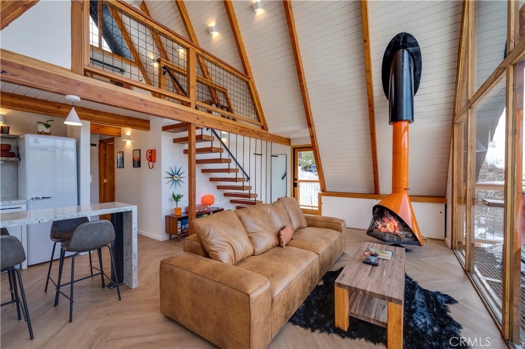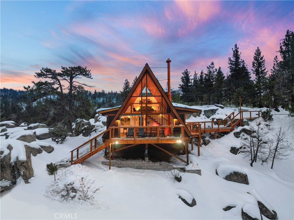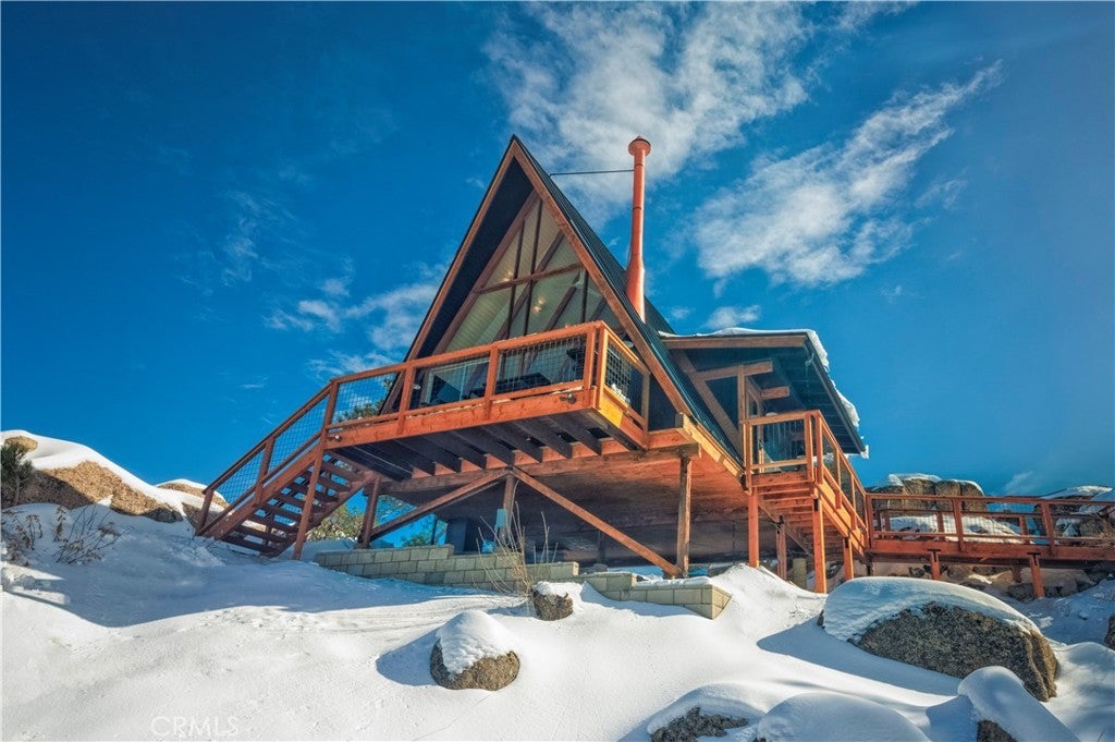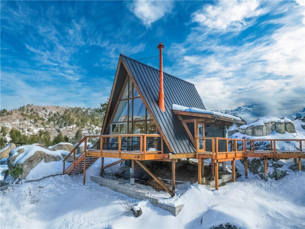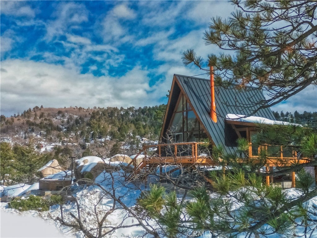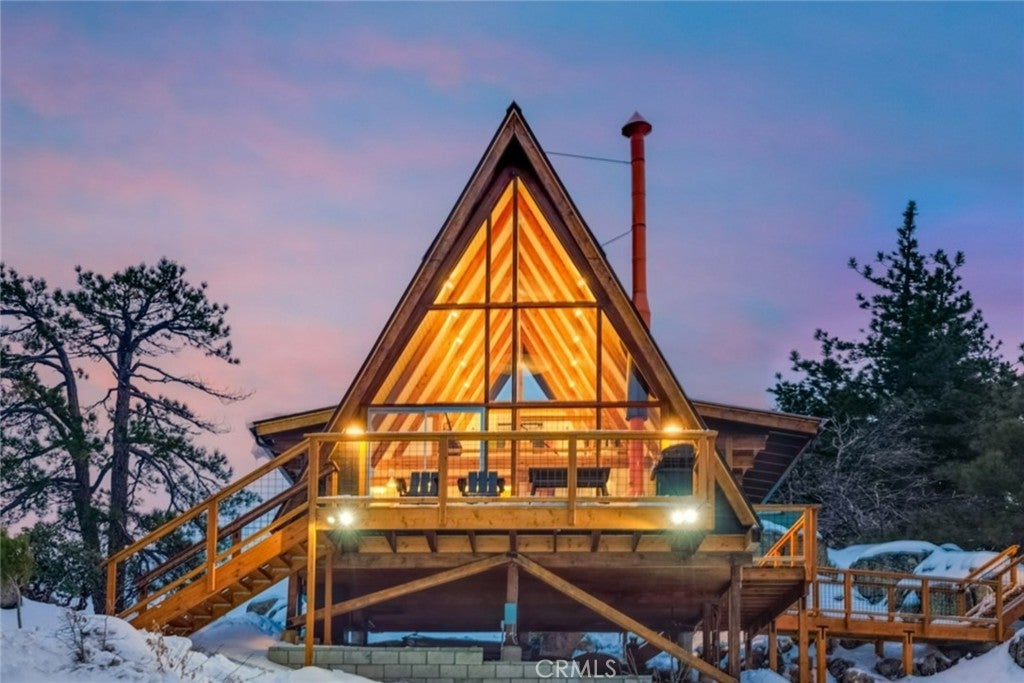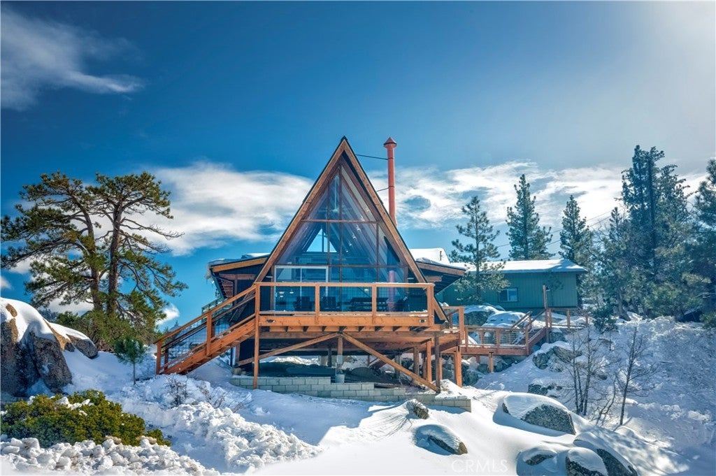 The Lake Arrowhead/Big Bear region is synonymous with A frames. A-frames are reflections of the mountains they inhabit; snowed in, Après Ski, and Summer pine aromas. This A Frame sits at a pinnacle, capturing unbridled views. Built in 1964 as a price for a Heinz 57 sweepstakes winner. Then, in 2022, the structure was brilliantly restored showcasing precision in spatial planning, material integrity, and modern-rustic synergy. Herringbone hardwood floors draw the eye across the room like an arrow, up to the full frame windows and out to the sky, boulders, and forest. The kitchen is smart, with a full suite of appliances including retro Classic brand fridge, gas stove and microwave, water filter, dishwasher and hidden laundry facilities. The counters are quartz river stone terrazzo, and an elegant steal reenforced floating waterfall edge serves as a dining setting, bar, prep or laundry station. The sofa is faced directly at the twenty-five-foot-tall window. The forest brushing the bottoms of clouds and shifting colors of the sky and phases of the moon and stars are true natural endless entertainment. A vintage Midcentury MALM fireplace ties a whole architectural theme and scheme together. The bath features a walk- in shower with hexagonal tile Aswell as acoustic paneling behind the commode. The basin sink preserves counterspace. And heated floors warm your bare feet all year long. Downstairs is a bedroom for guests, but the bedroom loft upstairs is romantic magic. Ascend a floating staircase to a boudoir where the moon kisses you good night and the light on the trees brushes you to wake. The whole home is smartly lit with warm minimalist sconces providing ample indirect light. You've waited long enough. It's time to make your mountain escape fantasies come true. This property grossed $126,000 in 2024 as an STR
