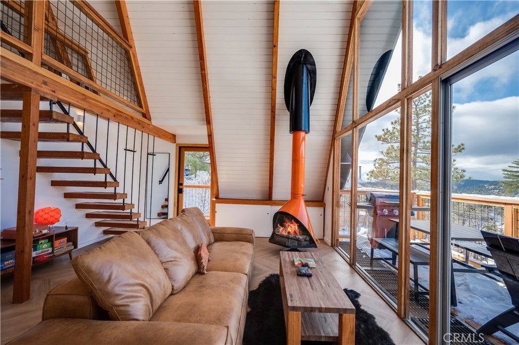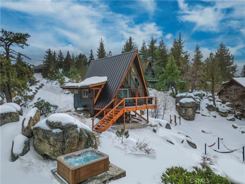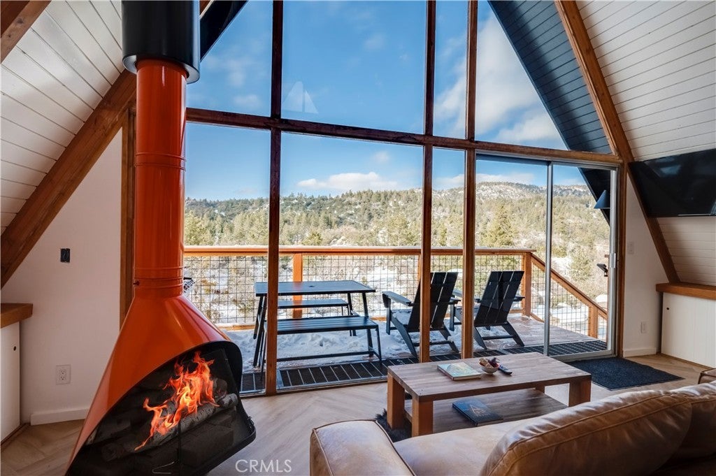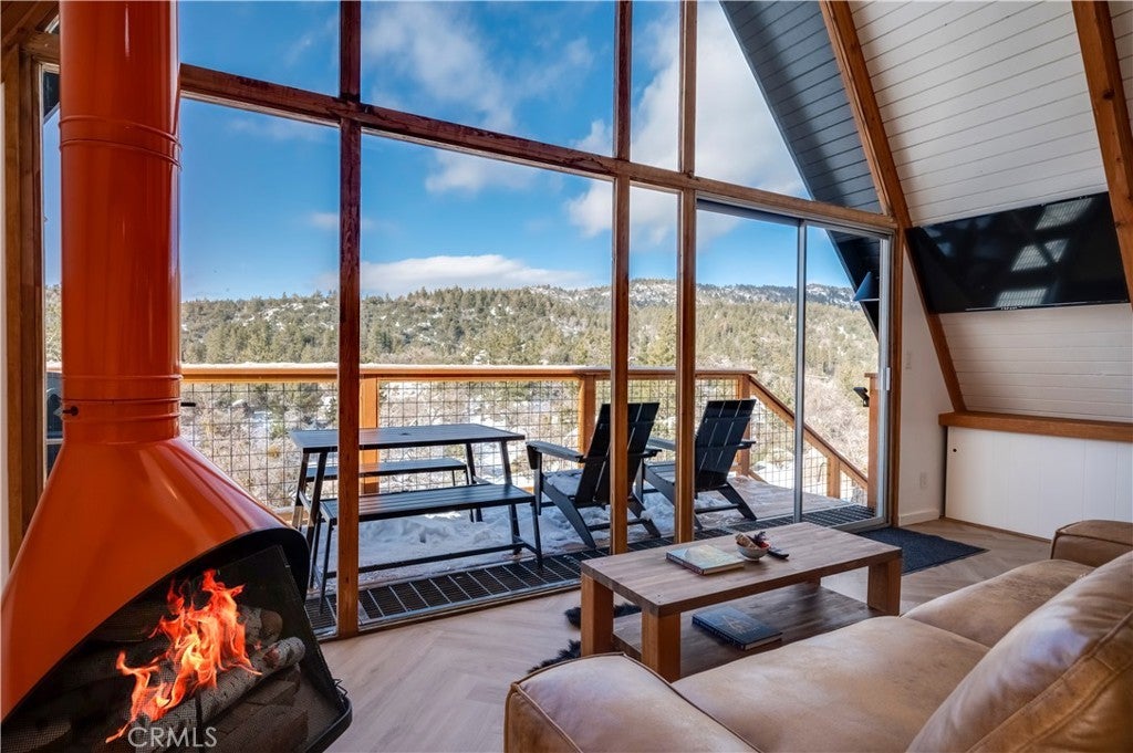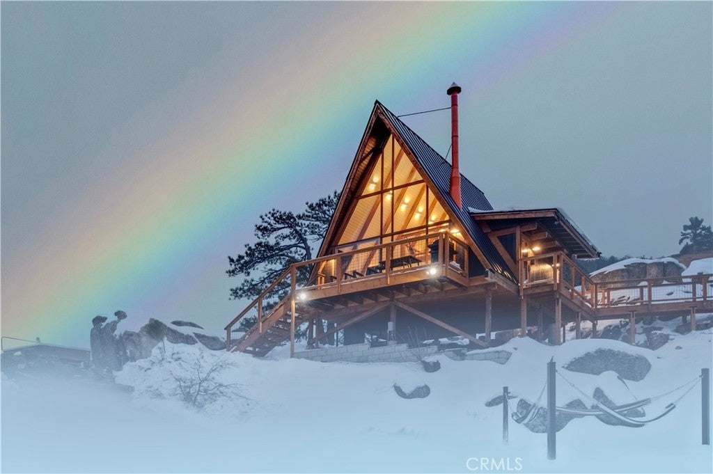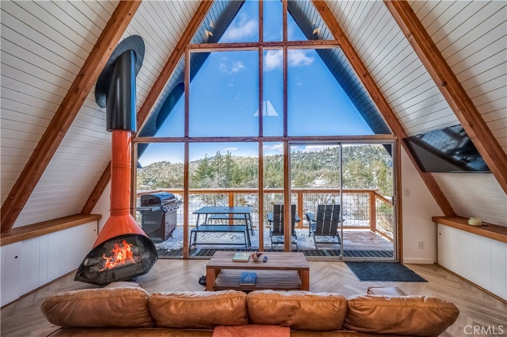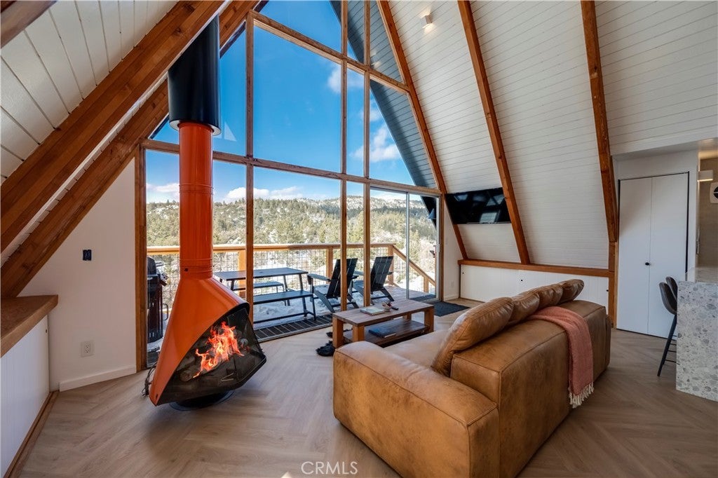The Lake Arrowhead/Big Bear region is synonymous with A frames. A-frames are reflections of the mountains they inhabit; snowed in, Après Ski, and Summer pine aromas. This A Frame sits at a pinnacle, capturing unbridled views. Built in 1964 as a price for a Heinz 57 sweepstakes winner. Then, in 2022, the structure was brilliantly restored showcasing precision in spatial planning, material integrity, and modern-rustic synergy. Herringbone hardwood floors draw the eye across the room like an arrow, up to the full frame windows and out to the sky, boulders, and forest. The kitchen is smart, with a full suite of appliances including retro Classic brand fridge, gas stove and microwave, water filter, dishwasher and hidden laundry facilities. The counters are quartz river stone terrazzo, and an elegant steal reenforced floating waterfall edge serves as a dining setting, bar, prep or laundry station. The sofa is faced directly at the twenty-five-foot-tall window. The forest brushing the bottoms of clouds and shifting colors of the sky and phases of the moon and stars are true natural endless entertainment. A vintage Midcentury MALM fireplace ties a whole architectural theme and scheme together. The bath features a walk- in shower with hexagonal tile Aswell as acoustic paneling behind the commode. The basin sink preserves counterspace. And heated floors warm your bare feet all year long. Downstairs is a bedroom for guests, but the bedroom loft upstairs is romantic magic. Ascend a floating staircase to a boudoir where the moon kisses you good night and the light on the trees brushes you to wake. The whole home is smartly lit with warm minimalist sconces providing ample indirect light. You've waited long enough. It's time to make your mountain escape fantasies come true. This property grossed $126,000 in 2024 as an STR