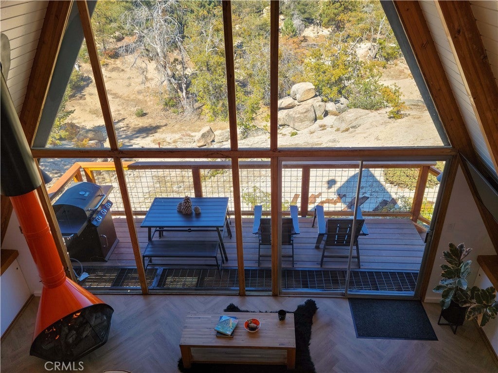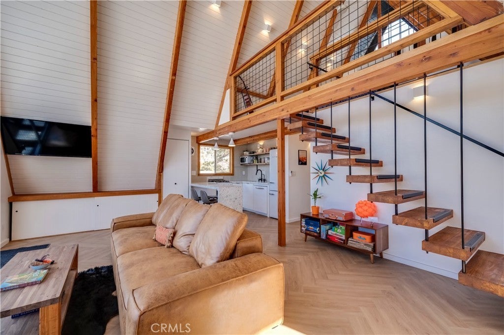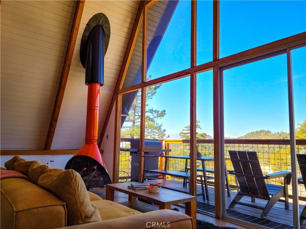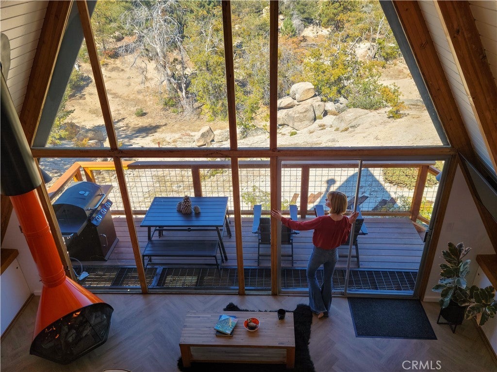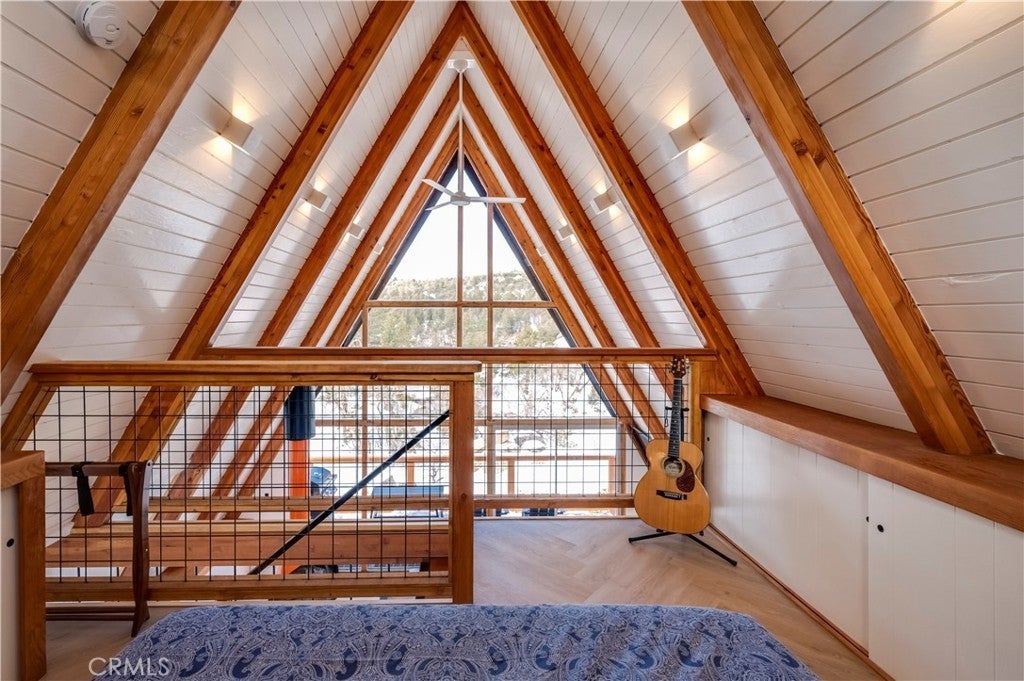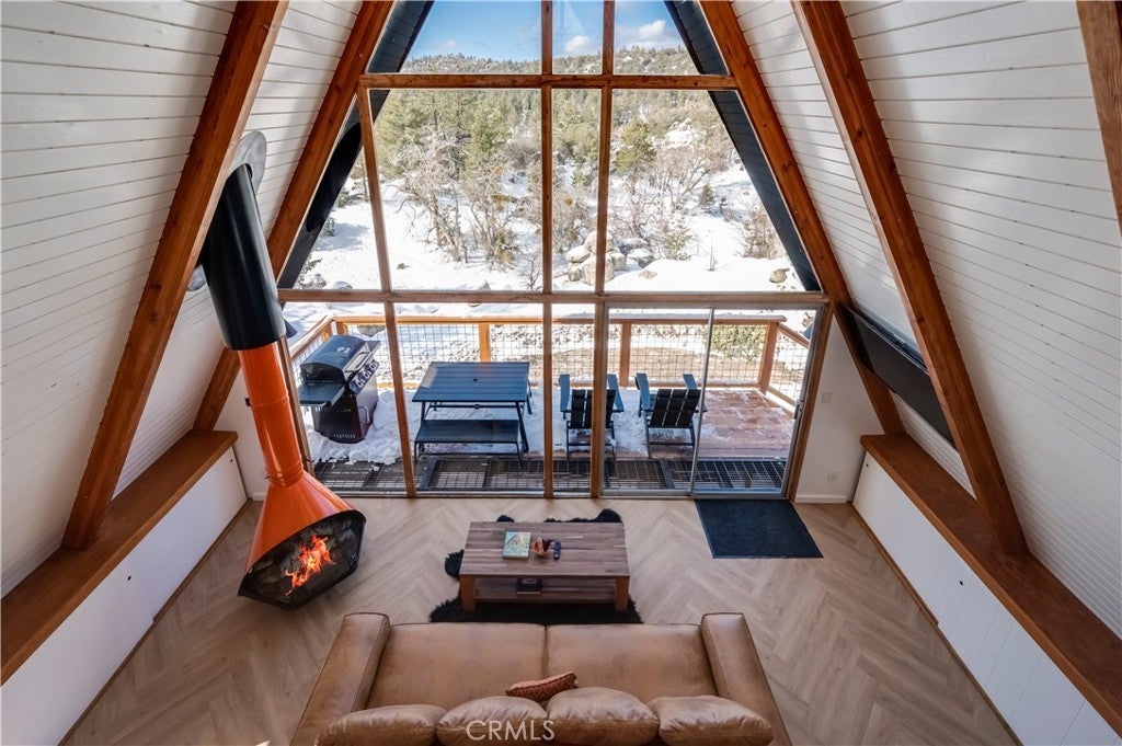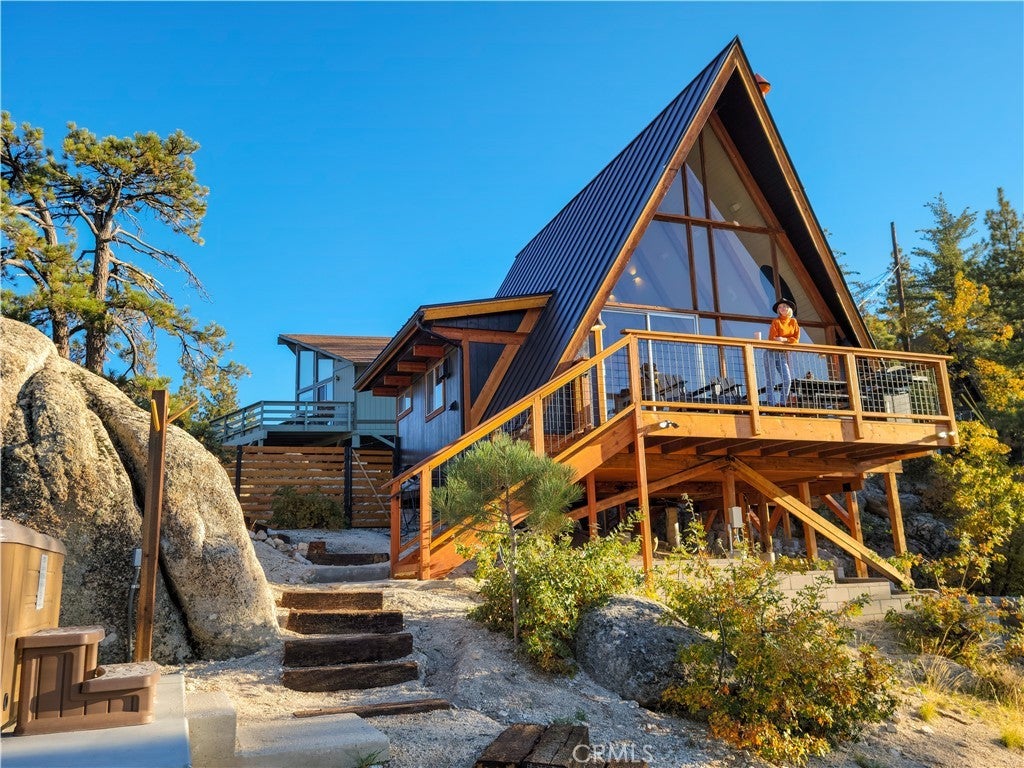 The Lake Arrowhead/Big Bear region is synonymous with A frames. A-frames are reflections of the mountains they inhabit; snowed in, Après Ski, and Summer pine aromas. This A Frame sits at a pinnacle, capturing unbridled views. Built in 1964 as a price for a Heinz 57 sweepstakes winner. Then, in 2022, the structure was brilliantly restored showcasing precision in spatial planning, material integrity, and modern-rustic synergy. Herringbone hardwood floors draw the eye across the room like an arrow, up to the full frame windows and out to the sky, boulders, and forest. The kitchen is smart, with a full suite of appliances including retro Classic brand fridge, gas stove and microwave, water filter, dishwasher and hidden laundry facilities. The counters are quartz river stone terrazzo, and an elegant steal reenforced floating waterfall edge serves as a dining setting, bar, prep or laundry station. The sofa is faced directly at the twenty-five-foot-tall window. The forest brushing the bottoms of clouds and shifting colors of the sky and phases of the moon and stars are true natural endless entertainment. A vintage Midcentury MALM fireplace ties a whole architectural theme and scheme together. The bath features a walk- in shower with hexagonal tile Aswell as acoustic paneling behind the commode. The basin sink preserves counterspace. And heated floors warm your bare feet all year long. Downstairs is a bedroom for guests, but the bedroom loft upstairs is romantic magic. Ascend a floating staircase to a boudoir where the moon kisses you good night and the light on the trees brushes you to wake. The whole home is smartly lit with warm minimalist sconces providing ample indirect light. You've waited long enough. It's time to make your mountain escape fantasies come true. This property grossed $126,000 in 2024 as an STR