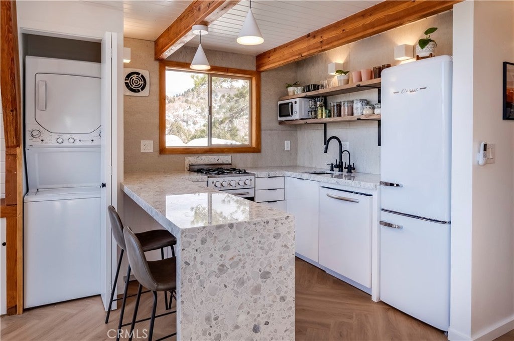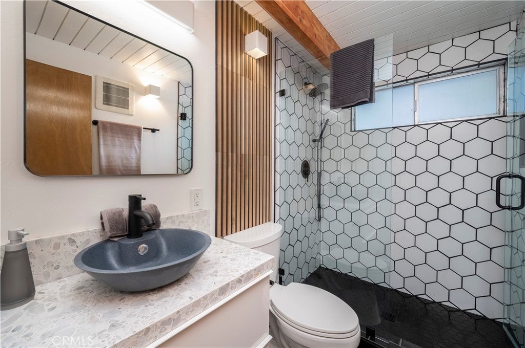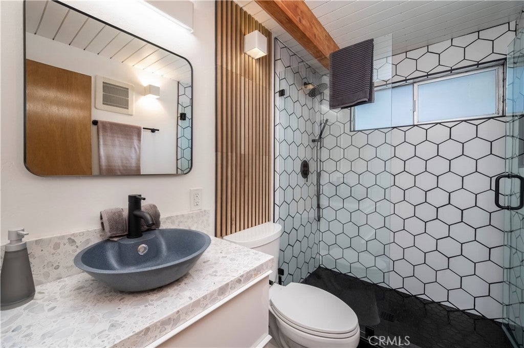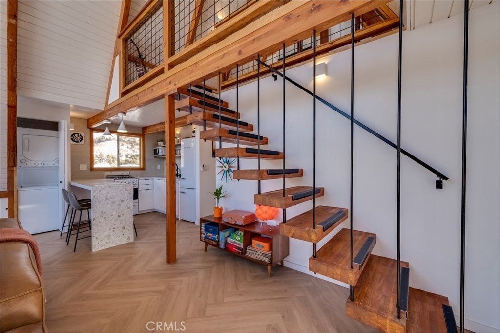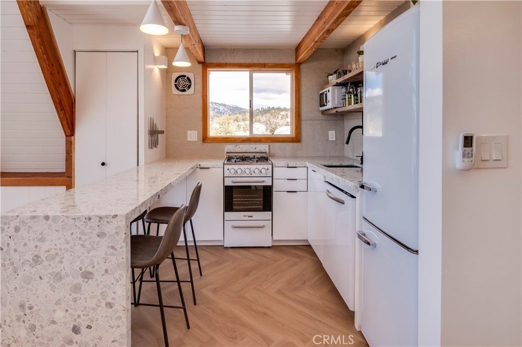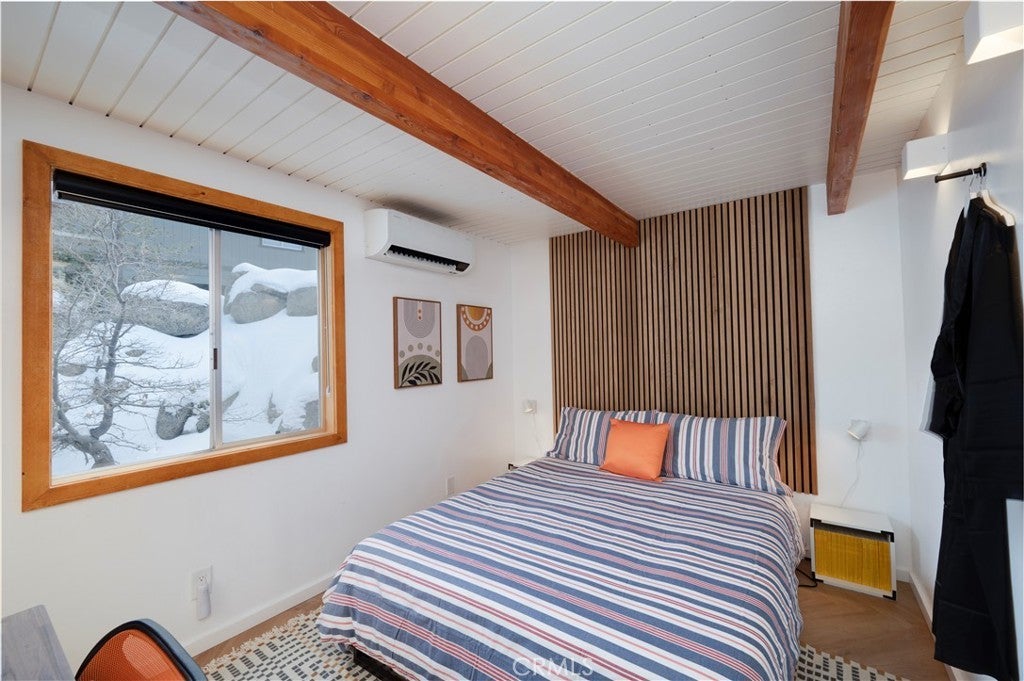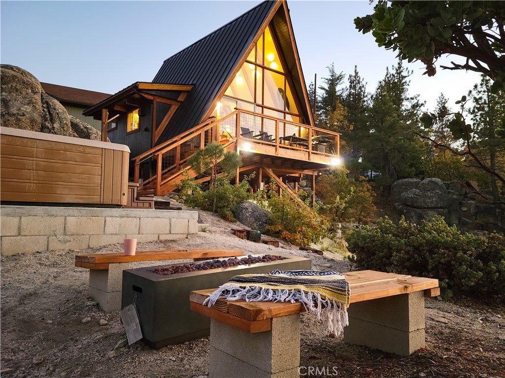 The Lake Arrowhead/Big Bear region is synonymous with A frames. A-frames are reflections of the mountains they inhabit; snowed in, Après Ski, and Summer pine aromas. This A Frame sits at a pinnacle, capturing unbridled views. Built in 1964 as a price for a Heinz 57 sweepstakes winner. Then, in 2022, the structure was brilliantly restored showcasing precision in spatial planning, material integrity, and modern-rustic synergy. Herringbone hardwood floors draw the eye across the room like an arrow, up to the full frame windows and out to the sky, boulders, and forest. The kitchen is smart, with a full suite of appliances including retro Classic brand fridge, gas stove and microwave, water filter, dishwasher and hidden laundry facilities. The counters are quartz river stone terrazzo, and an elegant steal reenforced floating waterfall edge serves as a dining setting, bar, prep or laundry station. The sofa is faced directly at the twenty-five-foot-tall window. The forest brushing the bottoms of clouds and shifting colors of the sky and phases of the moon and stars are true natural endless entertainment. A vintage Midcentury MALM fireplace ties a whole architectural theme and scheme together. The bath features a walk- in shower with hexagonal tile Aswell as acoustic paneling behind the commode. The basin sink preserves counterspace. And heated floors warm your bare feet all year long. Downstairs is a bedroom for guests, but the bedroom loft upstairs is romantic magic. Ascend a floating staircase to a boudoir where the moon kisses you good night and the light on the trees brushes you to wake. The whole home is smartly lit with warm minimalist sconces providing ample indirect light. You've waited long enough. It's time to make your mountain escape fantasies come true. This property grossed $126,000 in 2024 as an STR