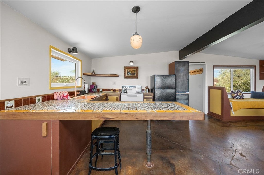 Beamed Ceilings, Breakfast Bar, Built-in Features, Ceiling Fan(s), Ceramic Counters, Cathedral Ceiling(s), Furnished, High Ceilings, Tile Counters, Bedroom on Main Level