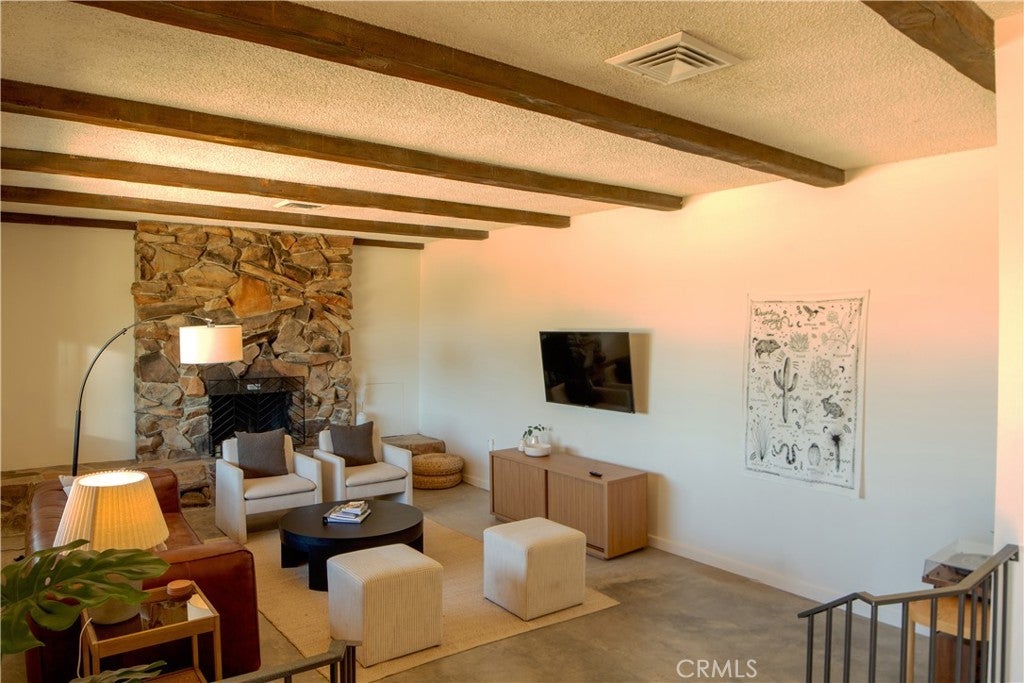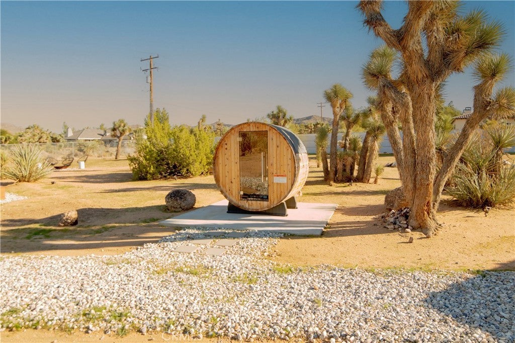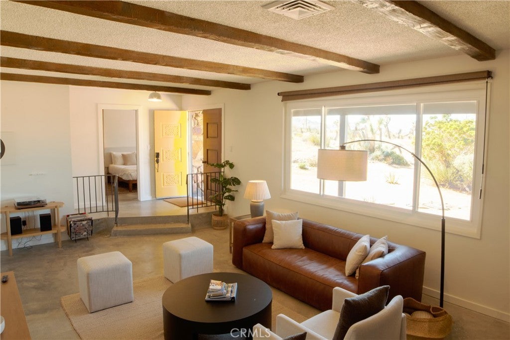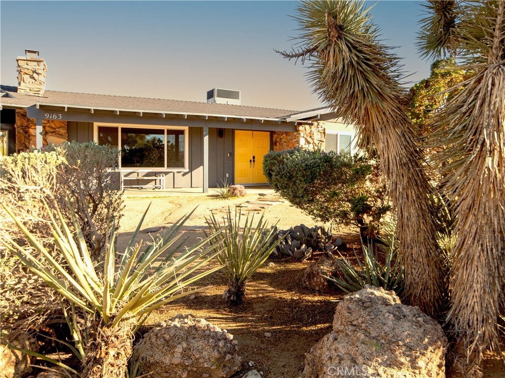 Classic Midcentury Charm, Floor plan and Architecture with sunken living room, gameroom with glass garage door. Midcentury charm starts with curb appeal, this home is set back from the street, centered on a square 1.4 acre lot. A long-looped driveway through lush hi-desert plants and bushes including large Joshua Trees and a large rear facing garage, a classic feature of Yucca Valley homes because of their large lots and relaxing lifestyle, most commonly built by early developer Fred A. Storey. The face of the home features rock masonry, exposed beams and eaves, a welcoming front patio and breezeway. The entry features double doors, paneled and carved. The entry looks on to a sunken living room, a giant window with beamed ceilings and a grand rock fireplace. The home has polished concrete floors throughout. To the right a den/office/bedroom with an ornate door. Forward through a pocket door is an open concept kitchen, dining room and laundry room with doors to the yard and breezeway. The bedroom wing hall has a large bank of built cabinets for extra storage. The guest bathroom is large and remodeled with terrazzo tile floors, floating vanity and a walk-in shower. The guest bedroom is large, with a large closet and windows. The primary bedroom is very large, with a walk-in closet, and remodeled full bath. The yard is big, the amenities spaced out with large Joshua Trees and pathways and wide views of Joshua Tree National Park Mountains. The large rear facing garage with its huge glass door and finished game room interior and mini split for heating and cool it’s the perfect place to enjoy the view and preside over a gathering enjoying the pool, spa, sauna and sundeck.