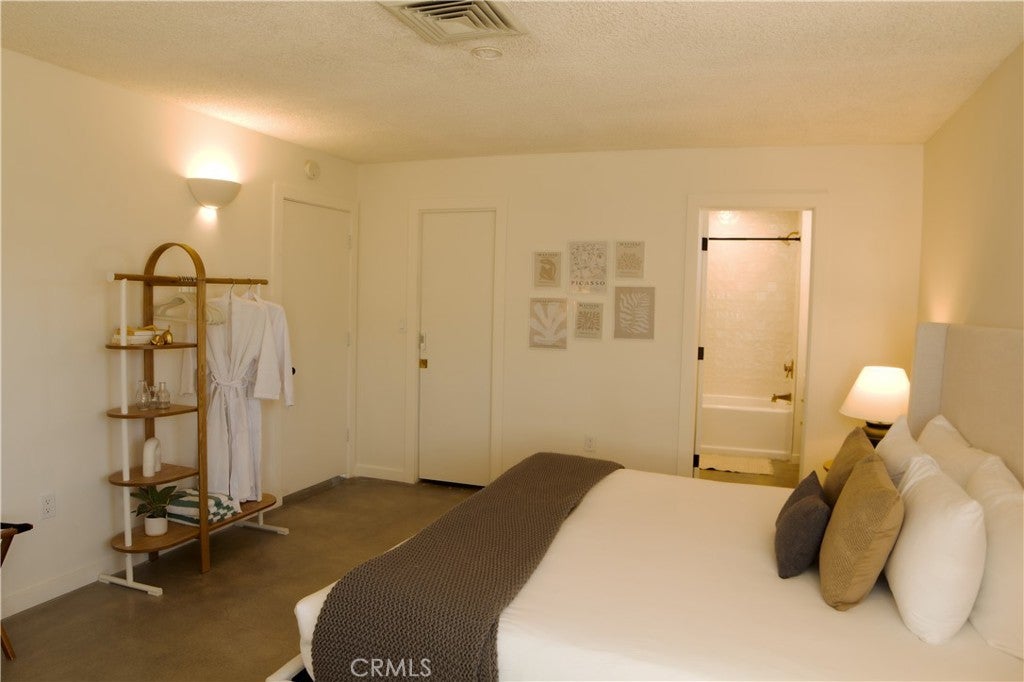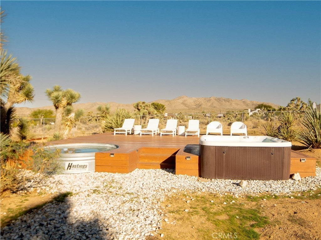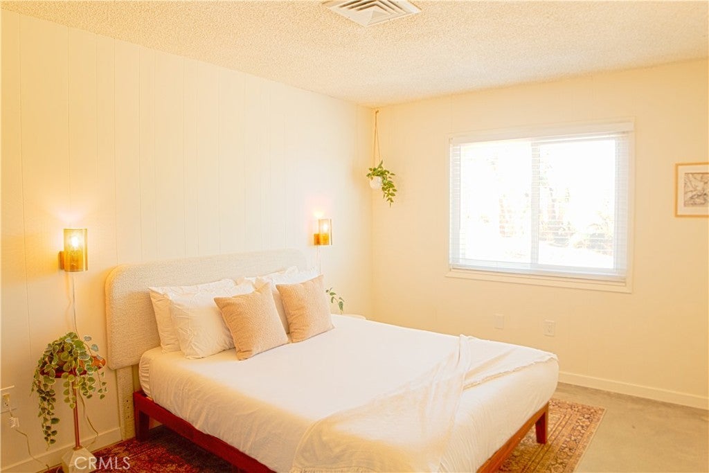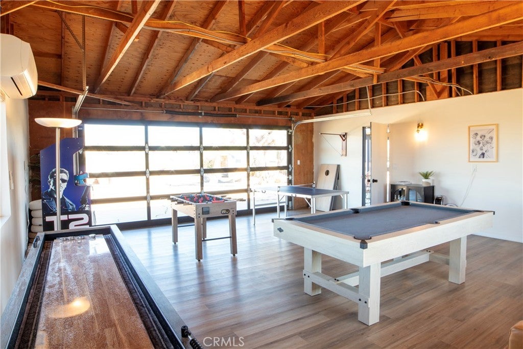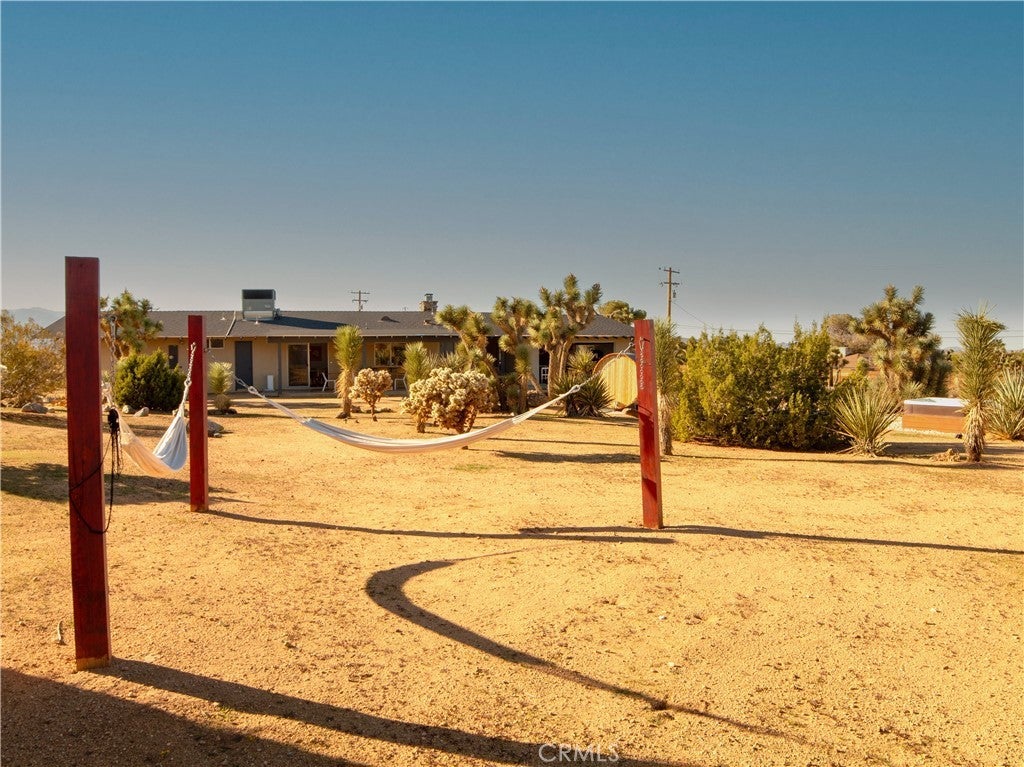 Classic Midcentury Charm, Floor plan and Architecture with sunken living room, gameroom with glass garage door. Midcentury charm starts with curb appeal, this home is set back from the street, centered on a square 1.4 acre lot. A long-looped driveway through lush hi-desert plants and bushes including large Joshua Trees and a large rear facing garage, a classic feature of Yucca Valley homes because of their large lots and relaxing lifestyle, most commonly built by early developer Fred A. Storey. The face of the home features rock masonry, exposed beams and eaves, a welcoming front patio and breezeway. The entry features double doors, paneled and carved. The entry looks on to a sunken living room, a giant window with beamed ceilings and a grand rock fireplace. The home has polished concrete floors throughout. To the right a den/office/bedroom with an ornate door. Forward through a pocket door is an open concept kitchen, dining room and laundry room with doors to the yard and breezeway. The bedroom wing hall has a large bank of built cabinets for extra storage. The guest bathroom is large and remodeled with terrazzo tile floors, floating vanity and a walk-in shower. The guest bedroom is large, with a large closet and windows. The primary bedroom is very large, with a walk-in closet, and remodeled full bath. The yard is big, the amenities spaced out with large Joshua Trees and pathways and wide views of Joshua Tree National Park Mountains. The large rear facing garage with its huge glass door and finished game room interior and mini split for heating and cool it’s the perfect place to enjoy the view and preside over a gathering enjoying the pool, spa, sauna and sundeck.