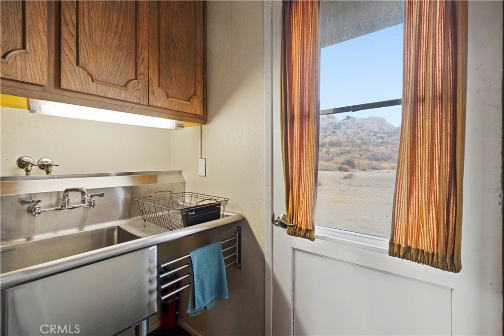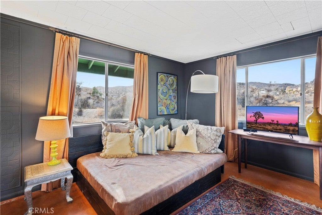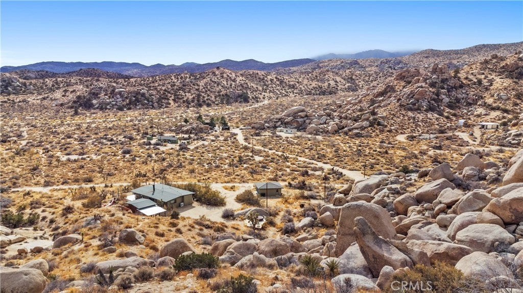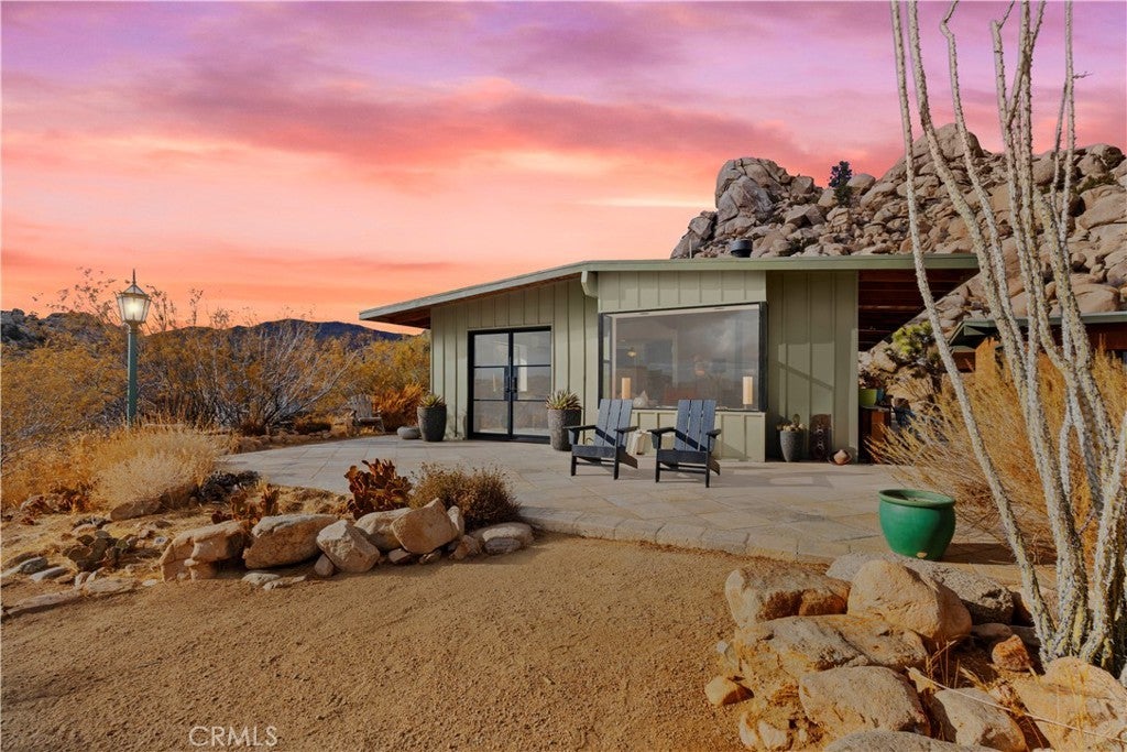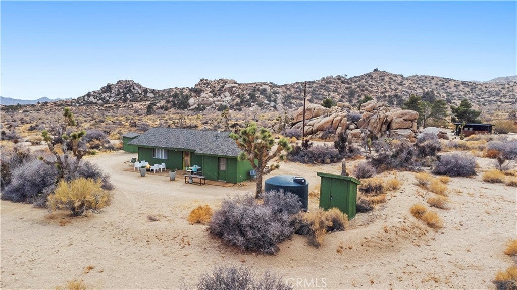 Set among massive boulders, native wildflowers, and old-growth Joshua Trees, this 5-acre property in Gamma Gulch feels like something you stumble upon once and never forget. Quiet, cinematic, and deeply peaceful, it’s the kind of place where the desert shows off—sunrises, long shadows, and sweeping views that stretch all the way to Joshua Tree National Park, and the snow-capped peaks of Mount San Jacinto. The main home is a thoughtfully updated 1-bedroom, 1-bath with just over 1,000 square feet, designed to frame the landscape from every room. Enter through custom iron doors by Pinky’s into a welcoming space that blends craftsmanship with comfort. The kitchen is a dream for anyone who loves to cook, featuring a Viking range and walk-in pantry. A wood-burning stove anchors the living room, creating a cozy place to unwind on cool desert evenings. The bathroom has been recently refreshed with modern fixtures, and the home has been newly painted throughout. Outside, the property continues to impress. A private garden with mature landscaping feels like a hidden oasis, while the patio is perfect for entertaining under the stars. Just off the main house is a studio currently used as a second bedroom, along with a finished two-car garage that offers excellent storage or creative space. At the opposite end of the land—completely private and visually separated—is a second, remodeled 700 square feet home. With an open-concept layout, full bathroom, and kitchenette, Ideal for guests, or a dedicated work-from-home retreat. The exterior has just been repainted, and the home feels fresh and serene. The main houses a private well, while the second home has its own 2,400-gallon water tank with a new digital pump. Both homes have been successful short-term rentals in the past (buyer to verify current permitting and usage), offering flexibility for personal use, income, or a combination of both. Furnishings may be negotiated with some exceptions. Despite its sense of seclusion, the property is easily accessible—just 7–8 minutes down a well-maintained dirt road, about 20 minutes to Yucca Valley, and only 15 minutes to the Pappy & Harriet’s. Adjacent 4.6-acre parcel is also available for separate purchase, offering even more room to expand or preserve the surrounding landscape. Private, expansive, and surrounded by unforgettable scenery, this Gamma Gulch retreat is a rare opportunity to own a true piece of the high desert—one that feels worlds away, yet perfectly connected.