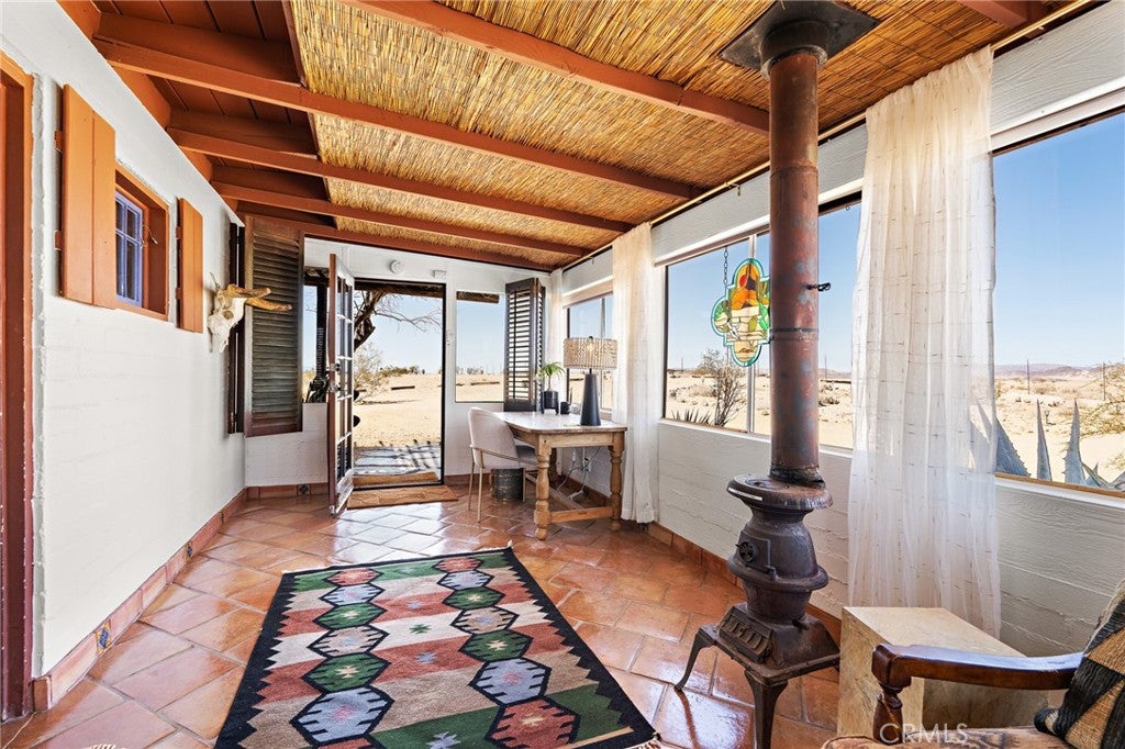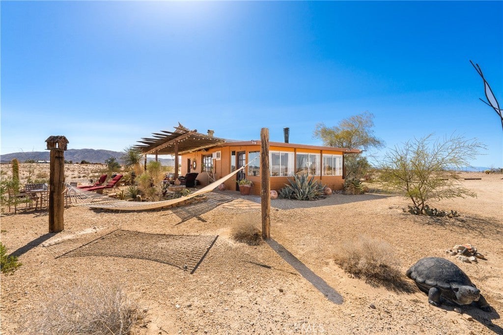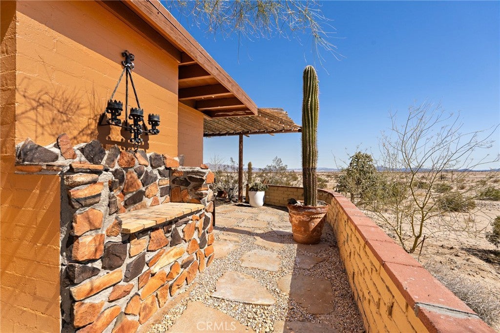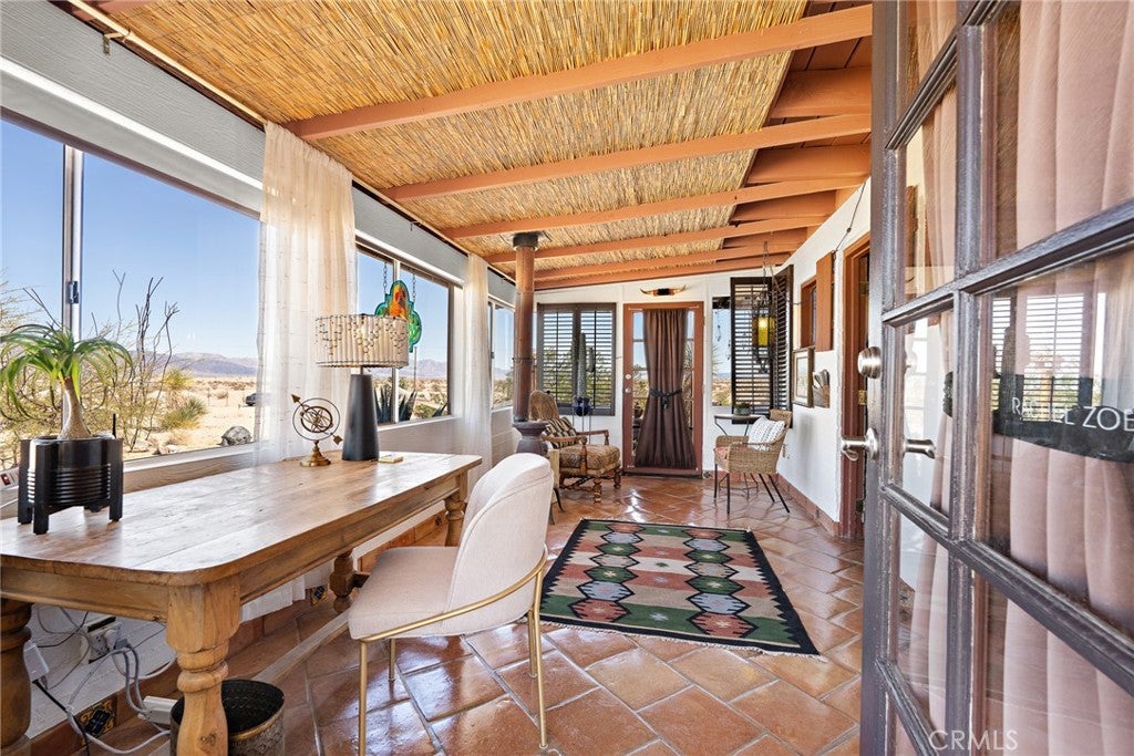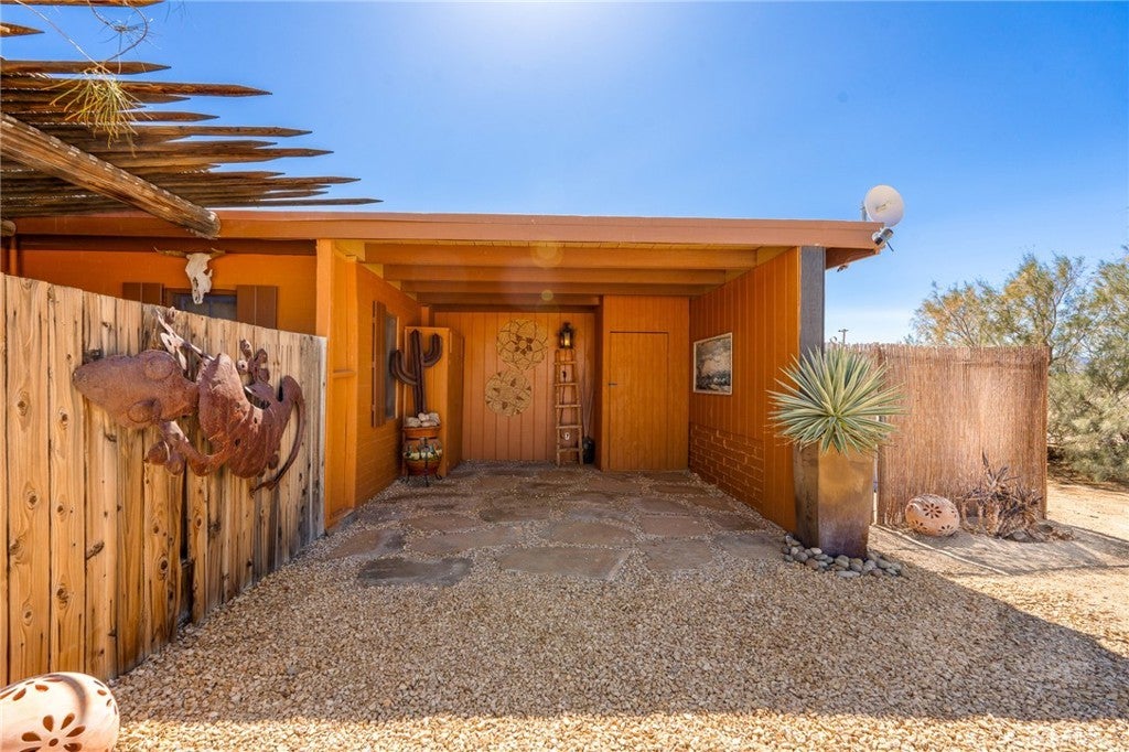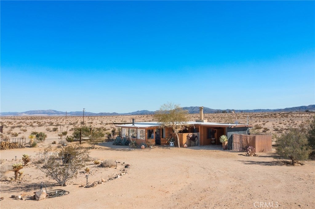Now available for long-term lease, ADOBE is a fully furnished mid-century home located in the quiet and expansive Wonder Valley area of Twentynine Palms. Set on 5 fully fenced acres with a gated drive and sweeping 360-degree desert and mountain views, this property offers privacy, style, and comfort in one of the High Desert's most serene settings. The interior features Saltillo tile floors, beamed ceilings, a sunken living room with a stone fireplace, a walk-in shower, and a flexible office or sitting porch-ideal for remote work or quiet reading. The home's layout and southwestern-inspired details create a warm, inviting space filled with natural light. Outdoor amenities include a private hot tub, shaded lounging areas, a BBQ, fire pit, fire bowl all set within a professionally designed landscape created by an award-winning LA-based architect. A sunset lookout point and ambient outdoor lighting complete the experience. This home offers the feeling of remote living while still being only 10 minutes from downtown Twentynine Palms, 15 minutes from the Marine base, and near The Palms restaurant. Some pets may be considered.