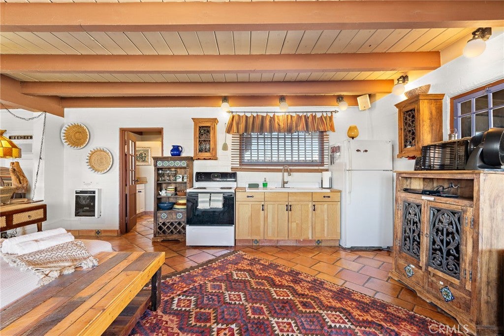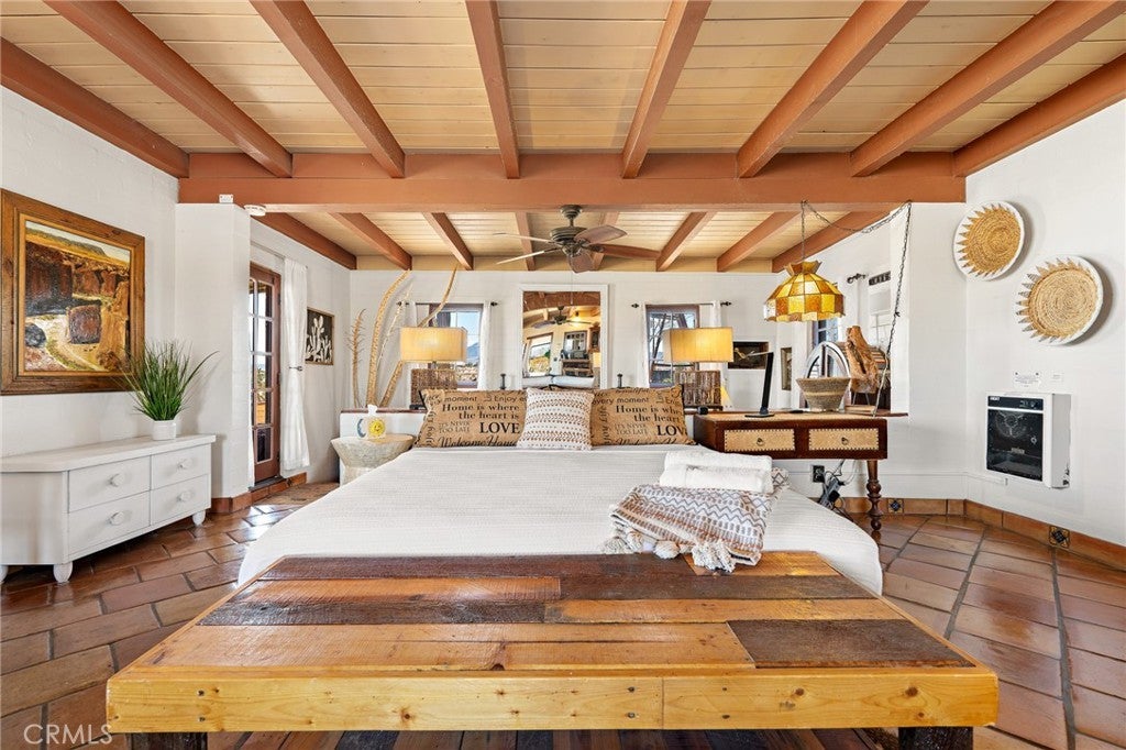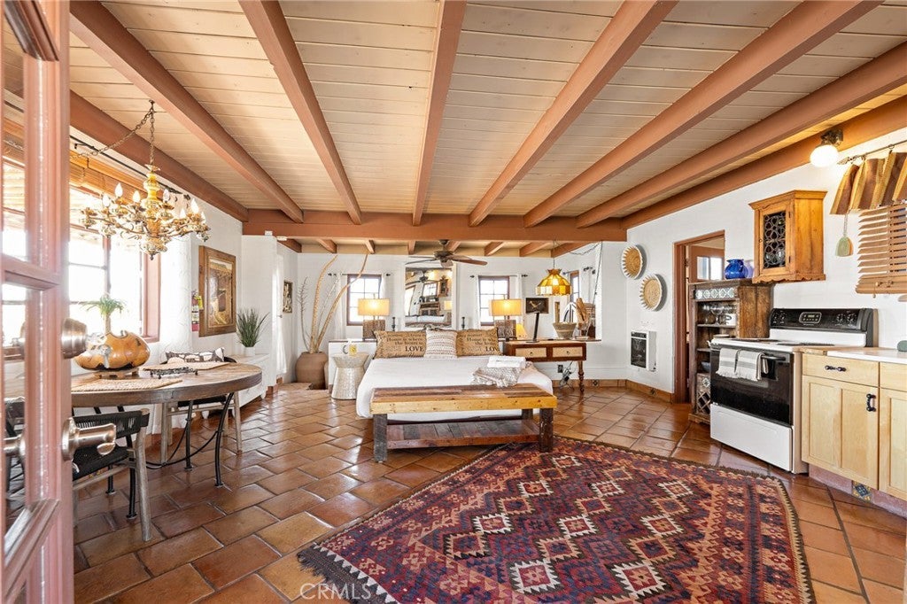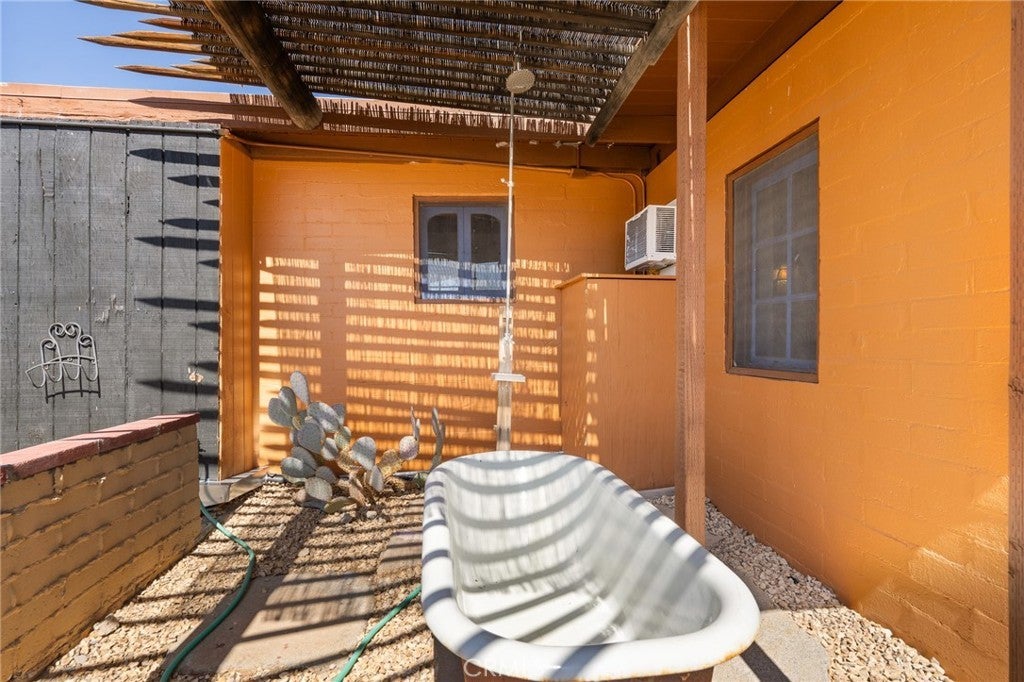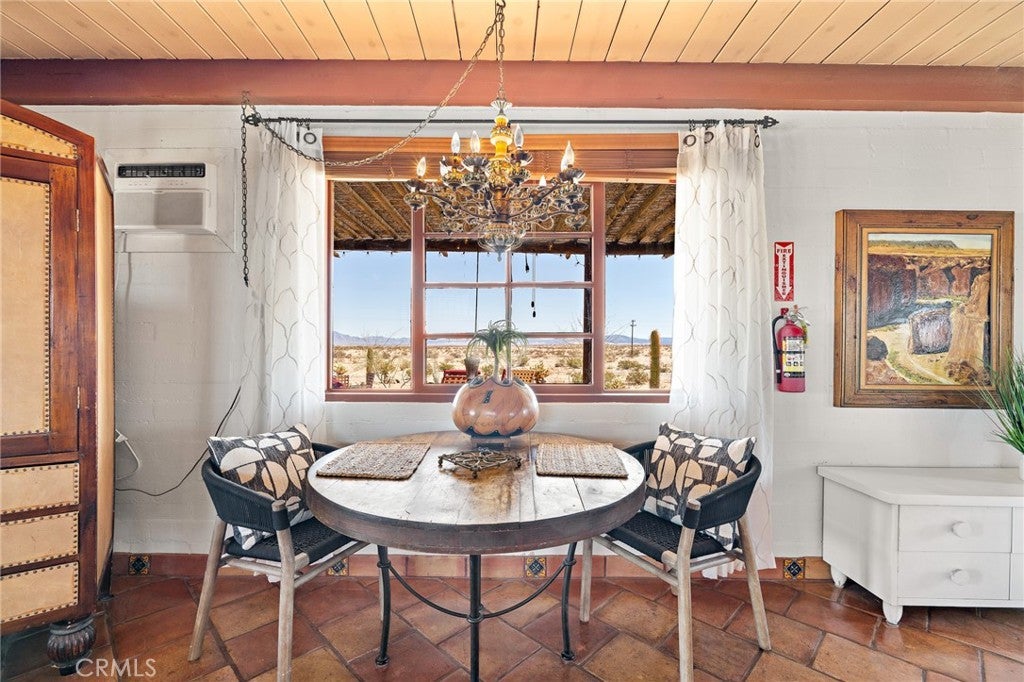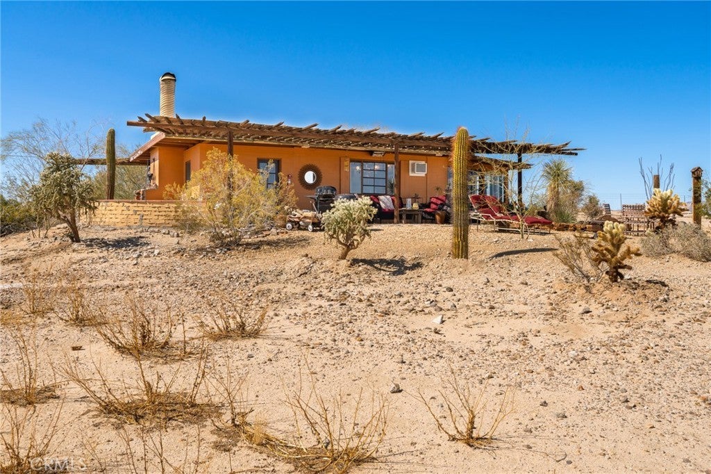 Now available for long-term lease, ADOBE is a fully furnished mid-century home located in the quiet and expansive Wonder Valley area of Twentynine Palms. Set on 5 fully fenced acres with a gated drive and sweeping 360-degree desert and mountain views, this property offers privacy, style, and comfort in one of the High Desert's most serene settings. The interior features Saltillo tile floors, beamed ceilings, a sunken living room with a stone fireplace, a walk-in shower, and a flexible office or sitting porch-ideal for remote work or quiet reading. The home's layout and southwestern-inspired details create a warm, inviting space filled with natural light. Outdoor amenities include a private hot tub, shaded lounging areas, a BBQ, fire pit, fire bowl all set within a professionally designed landscape created by an award-winning LA-based architect. A sunset lookout point and ambient outdoor lighting complete the experience. This home offers the feeling of remote living while still being only 10 minutes from downtown Twentynine Palms, 15 minutes from the Marine base, and near The Palms restaurant. Some pets may be considered.